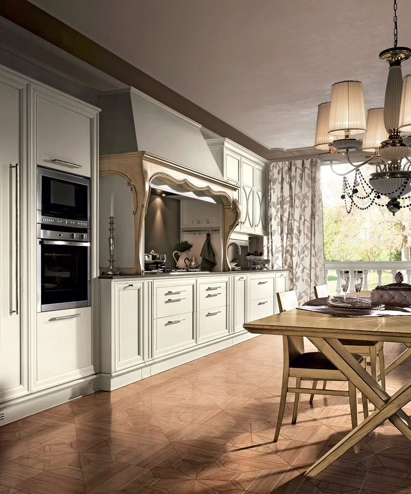 Кухня Dama от элитной итальянской фабрики Prestige выполнена в древесине бука и является образцом современного стиля с элементами неоклассики. Окрашенные фасады спроектированы в рамочном дизайне и покрыты воском. Столешница рабочей области представлена Каррарским мрамором.