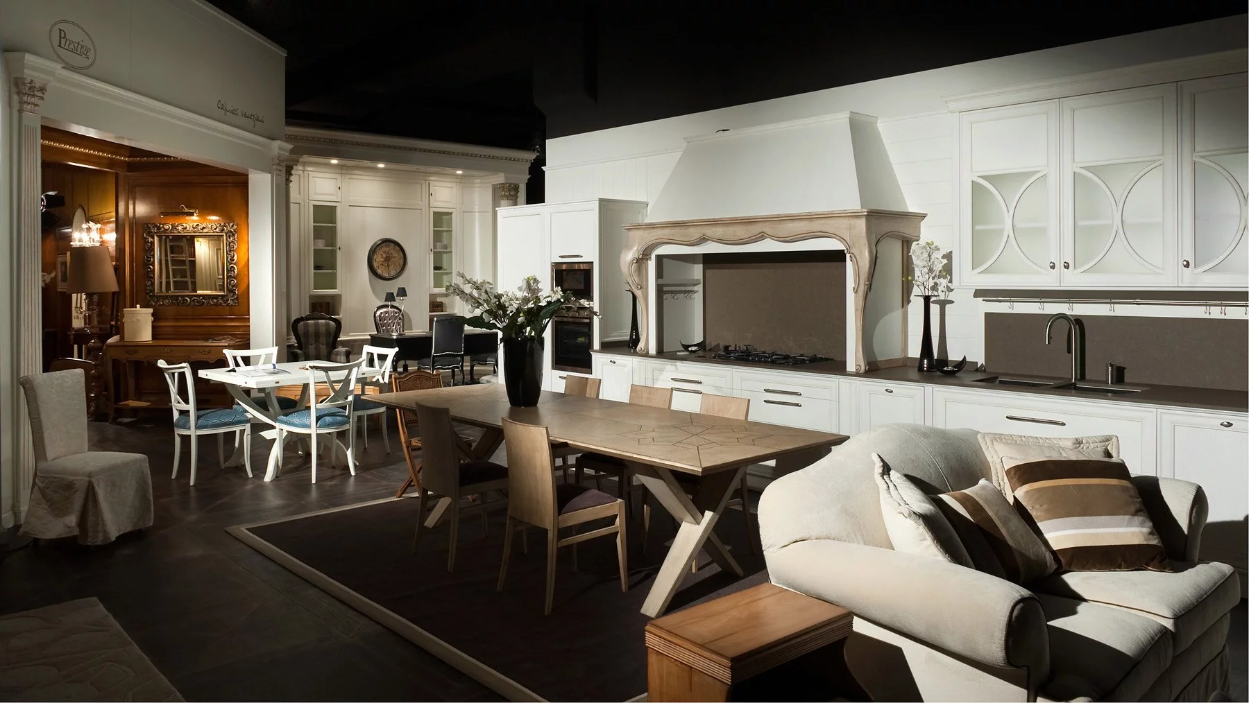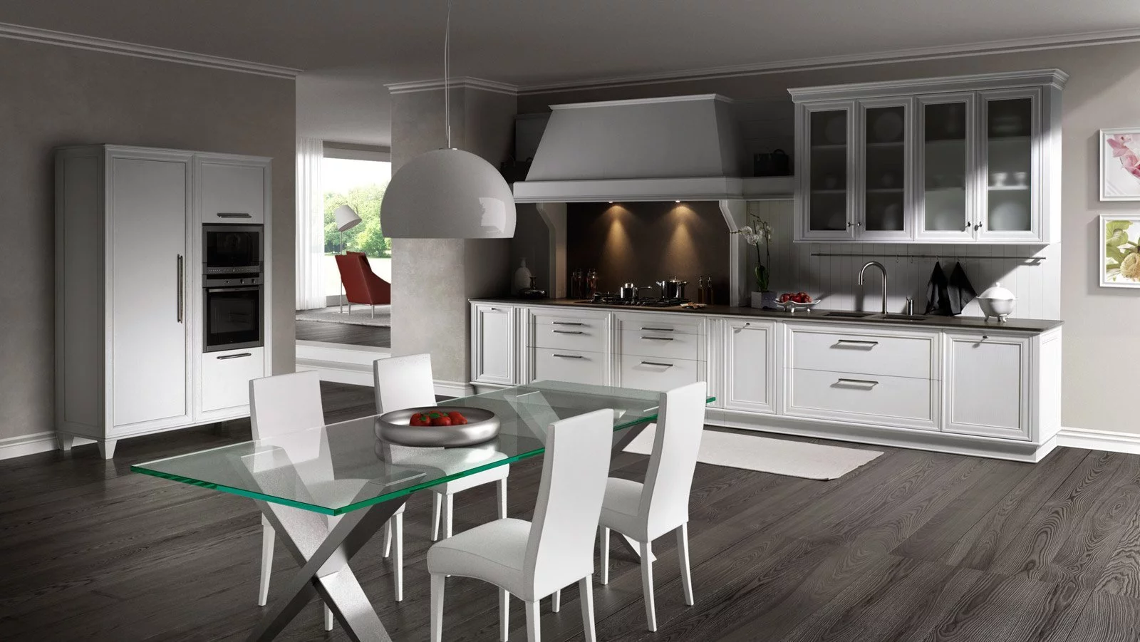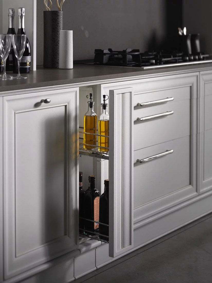 Кухня Dama делает нахождение в рабочей области приятным и лёгким благодаря австрийским механизмам плавного закрытия и инновационным системам доводчиков. Изделие комплектуется многочисленными полочками и шкафами для холодильника, духового шкафа и хранения кухонных аксессуаров. В дополнение к уникальной модели фабрика предлагает эстетичные обеденные столы и стулья, выполненные в едином стиле.