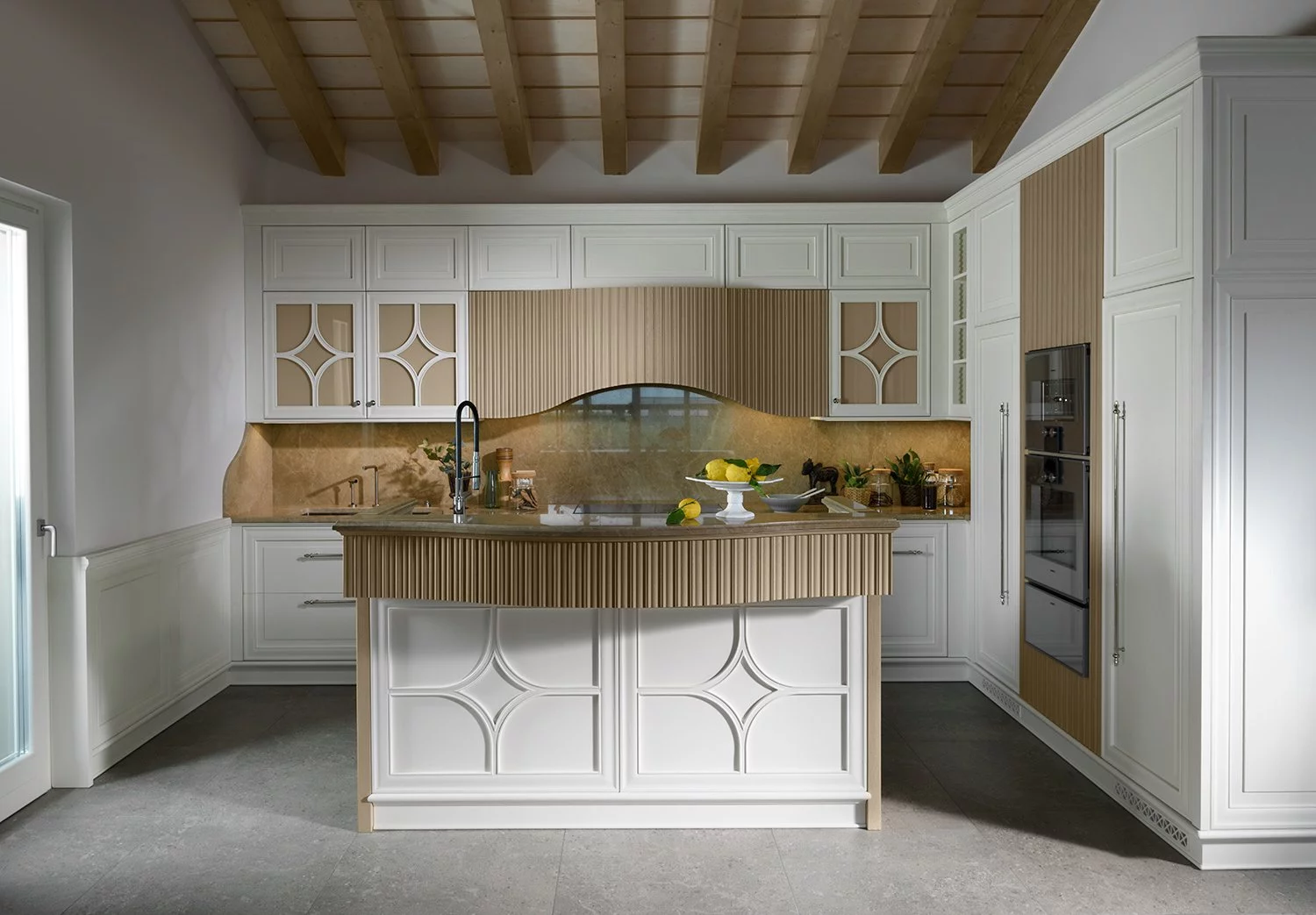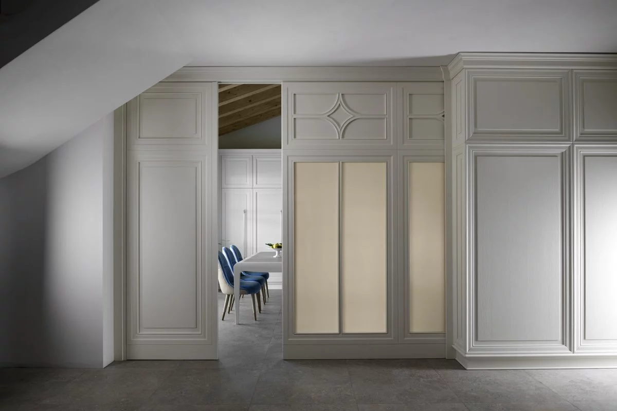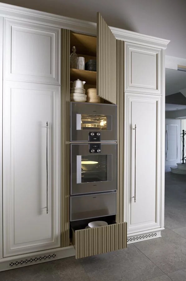Кухня Dama от элитной итальянской фабрики Prestige выполнена в древесине бука и является образцом современного стиля с элементами неоклассики. Окрашенные фасады спроектированы в рамочном дизайне и покрыты воском. Столешница рабочей области представлена Каррарским мрамором.