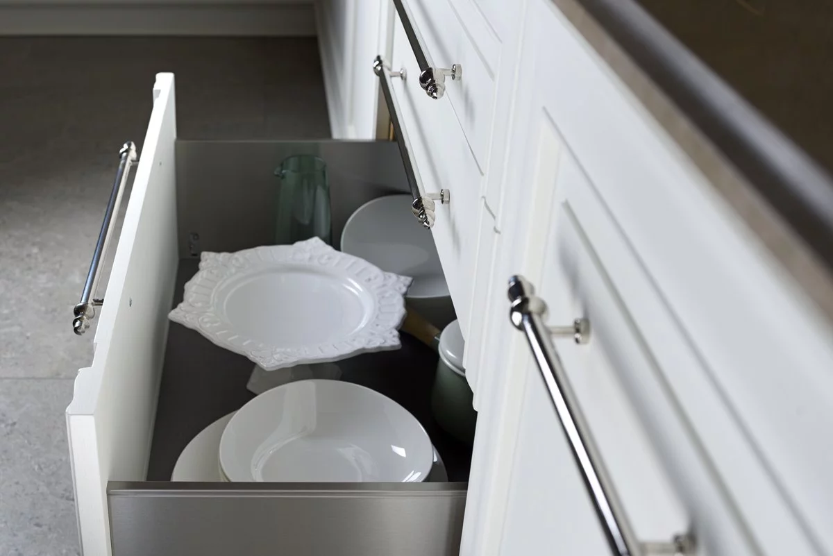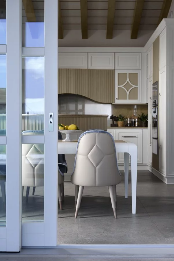Кухня Dama делает нахождение в рабочей области приятным и лёгким благодаря австрийским механизмам плавного закрытия и инновационным системам доводчиков. Изделие комплектуется многочисленными полочками и шкафами для холодильника, духового шкафа и хранения кухонных аксессуаров. В дополнение к уникальной модели фабрика предлагает эстетичные обеденные столы и стулья, выполненные в едином стиле.