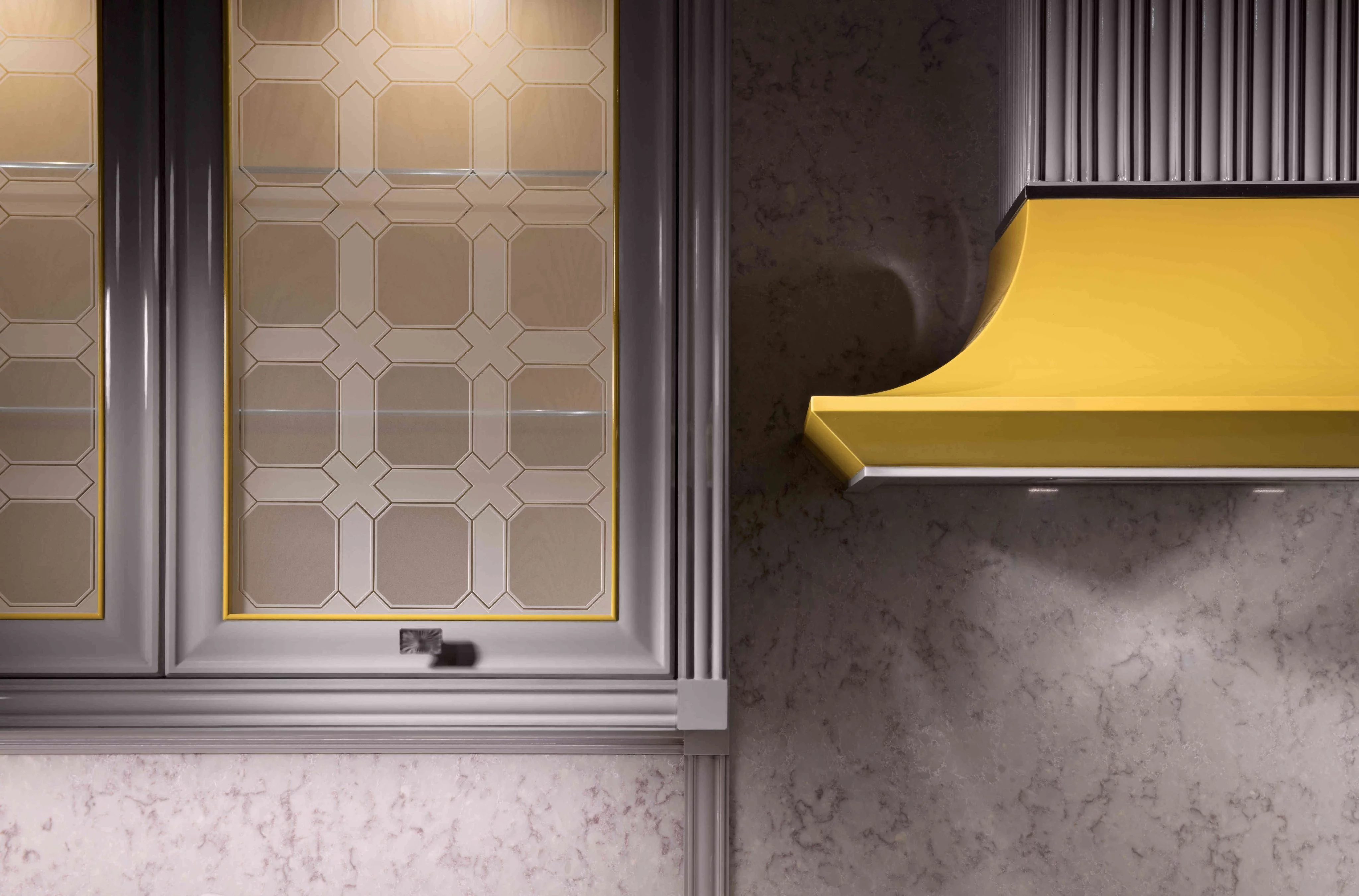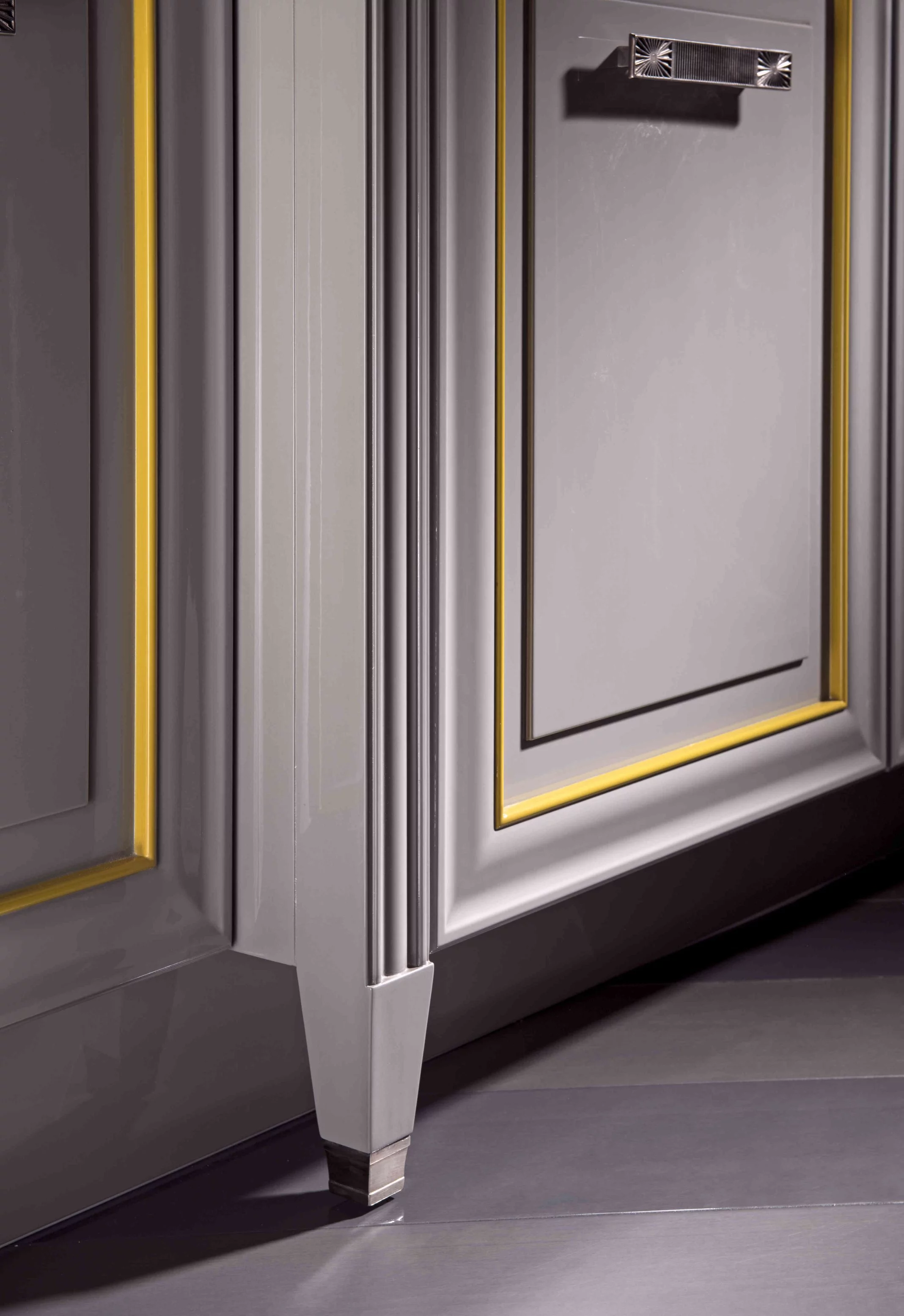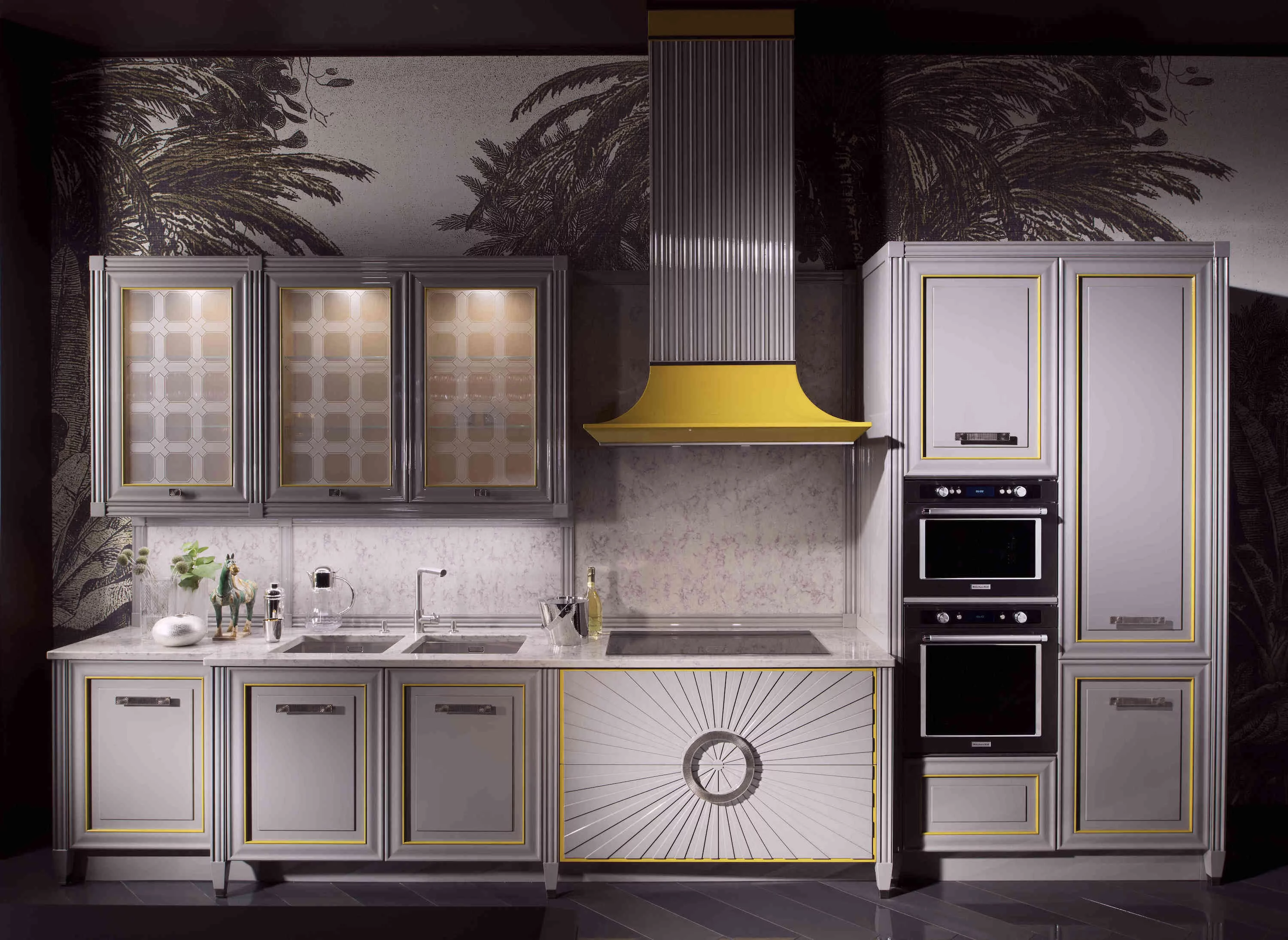 Если вы думаете, что «классика» — это скучно, то обратите внимание на кухню Dama Quadri от итальянского производителя Prestige. Здесь нейтральные серые рамочные фасады, которые украшены жёлтой патиной, придающей яркий акцент всему дизайну. Кроме этого, интересная стальная фурнитура также становится «изюминкой» проекта, особенно это касается тумбы под варочной поверхностью.