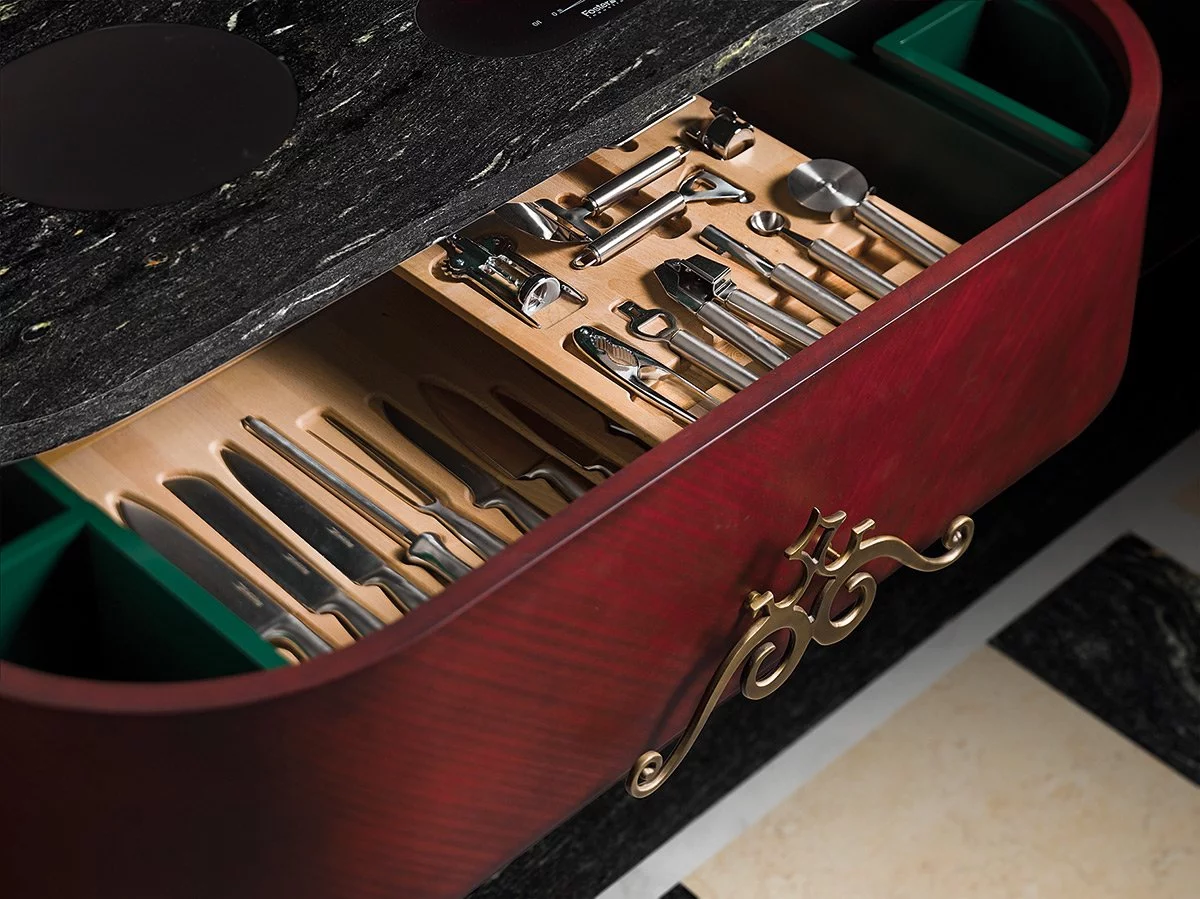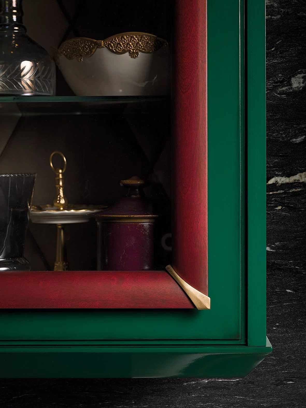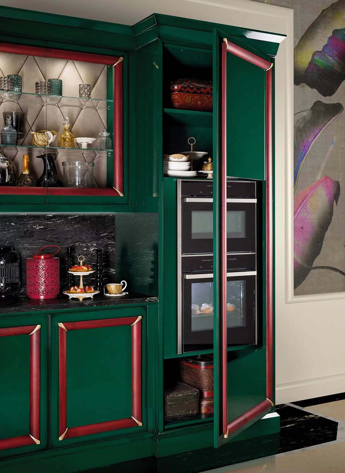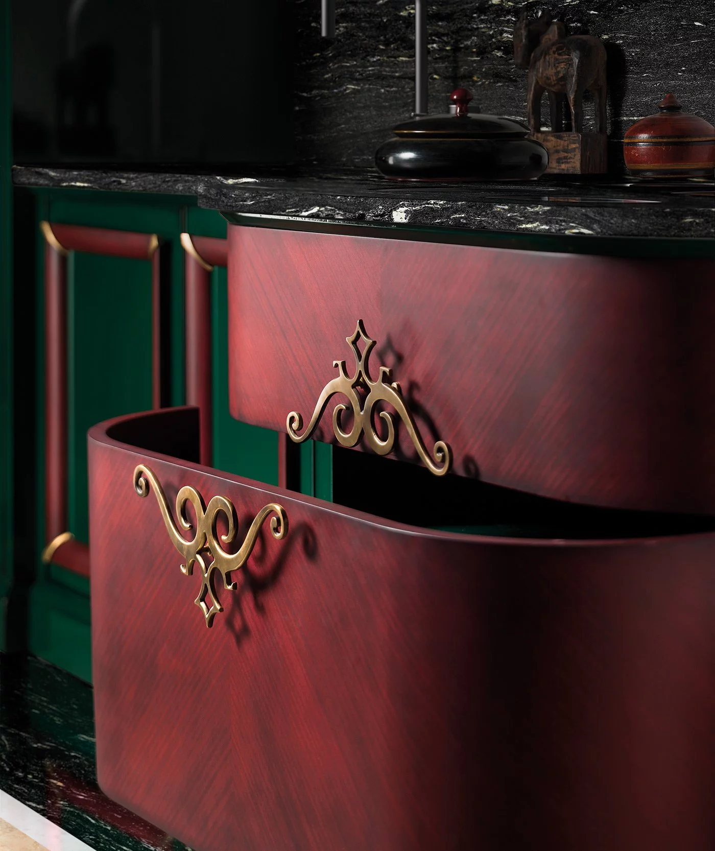 Кухня Gran Duca от итальянской фабрики Prestige стала олицетворением американского арт-деко, где сочетается функциональность, инновации, а также изысканные объёмы, чёткие линии, дорогие материалы и покрытия. Модель отличается яркими контрастными цветами — изумруд и винный оттенок с проглядывающейся текстурой дерева.