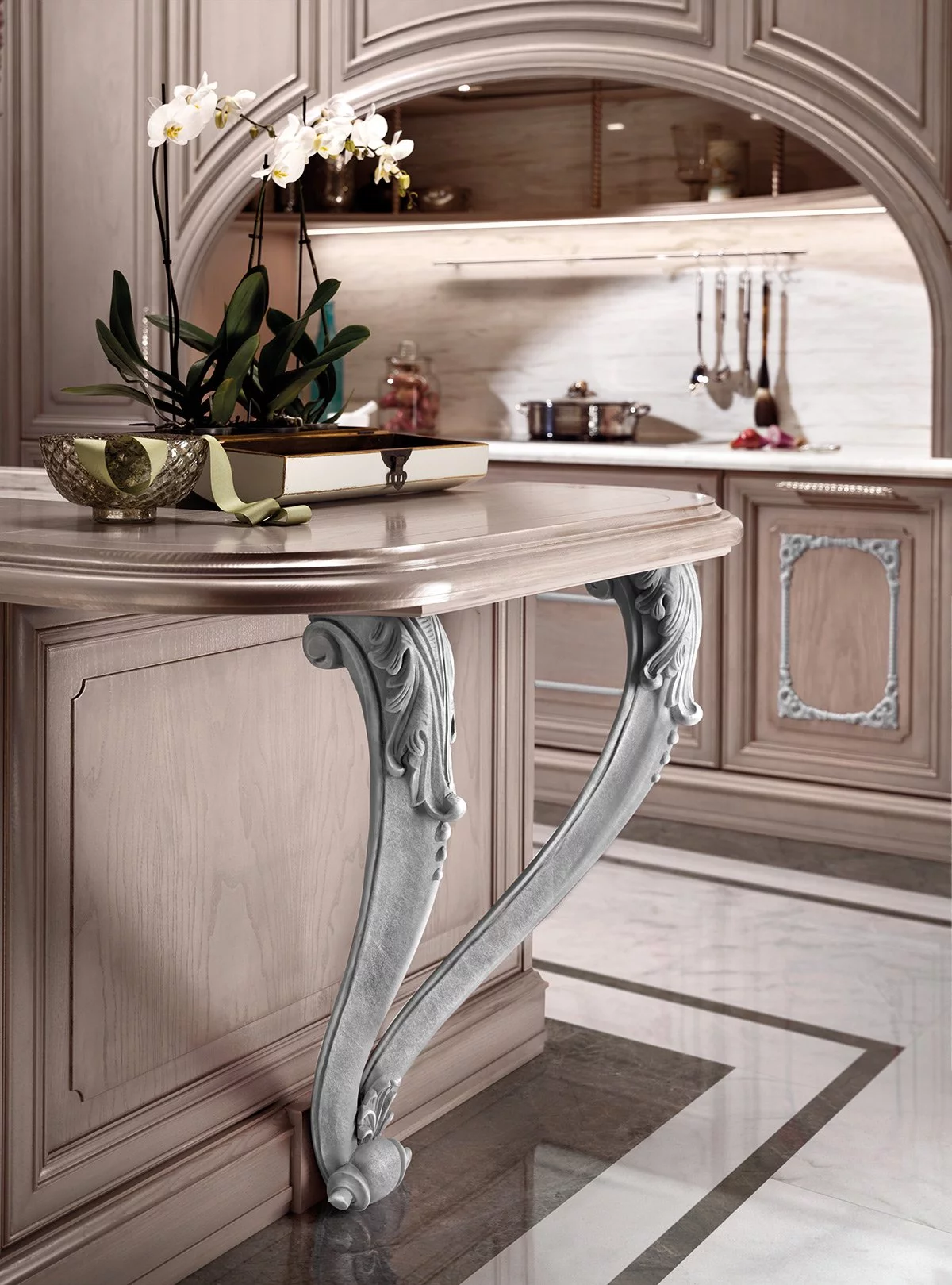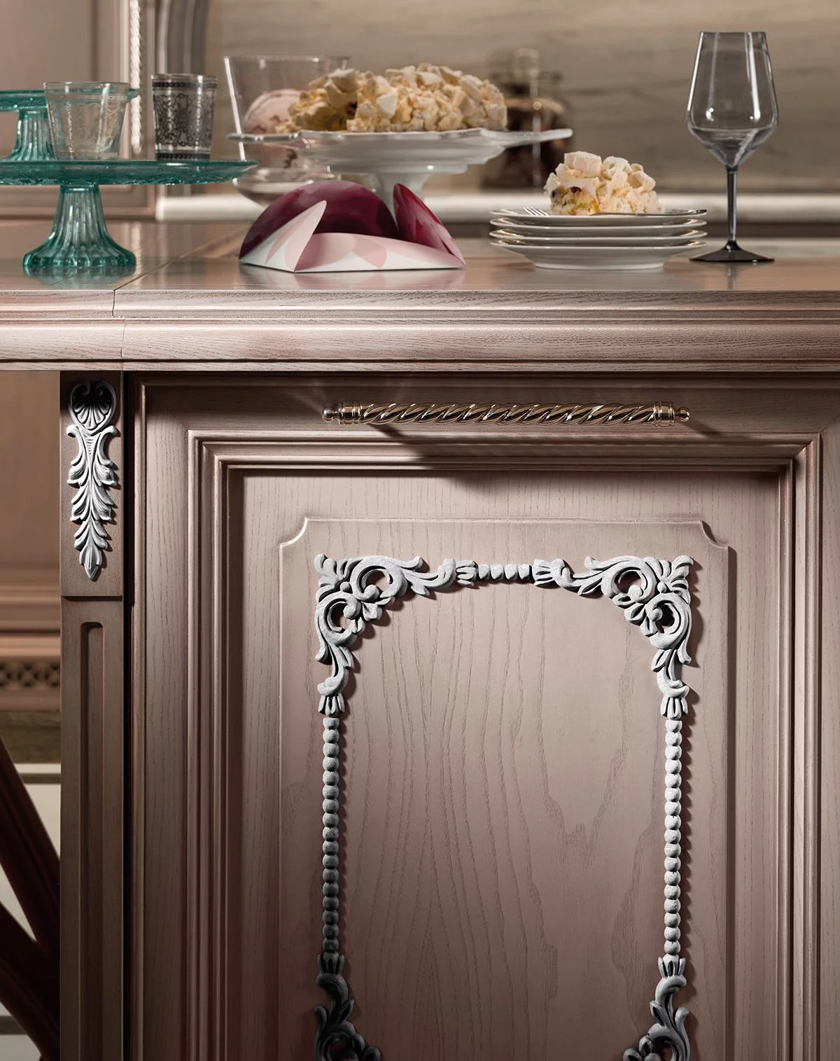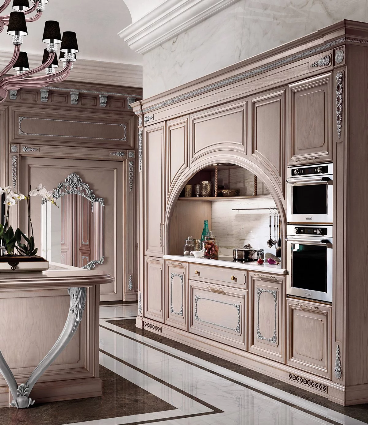 Уникальная кухня Regina от фабрики Prestige придётся по вкусу романтическим натурам. Королевская «классика», выполненная в оттенке розового золота, украшена многочисленной лепниной античного стиля. Это изделие обязательно станет центром притяжения любого домашнего пространства, даря неповторимую атмосферу уюта, тепла и гармонии.