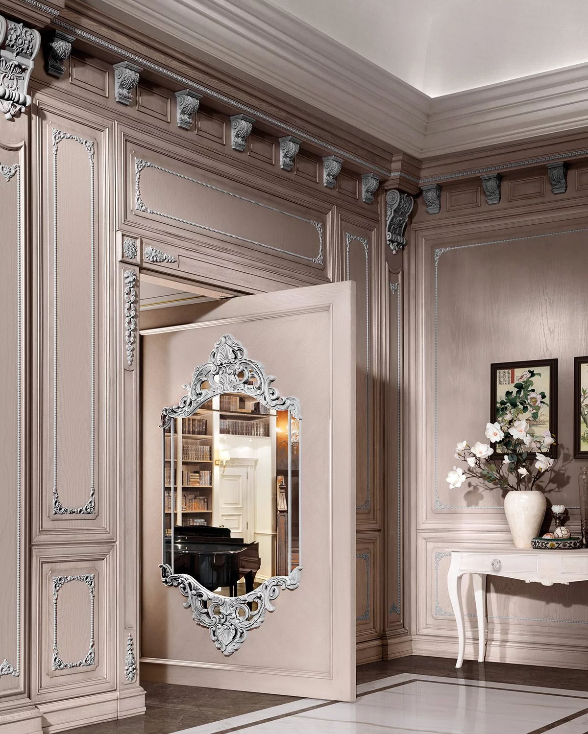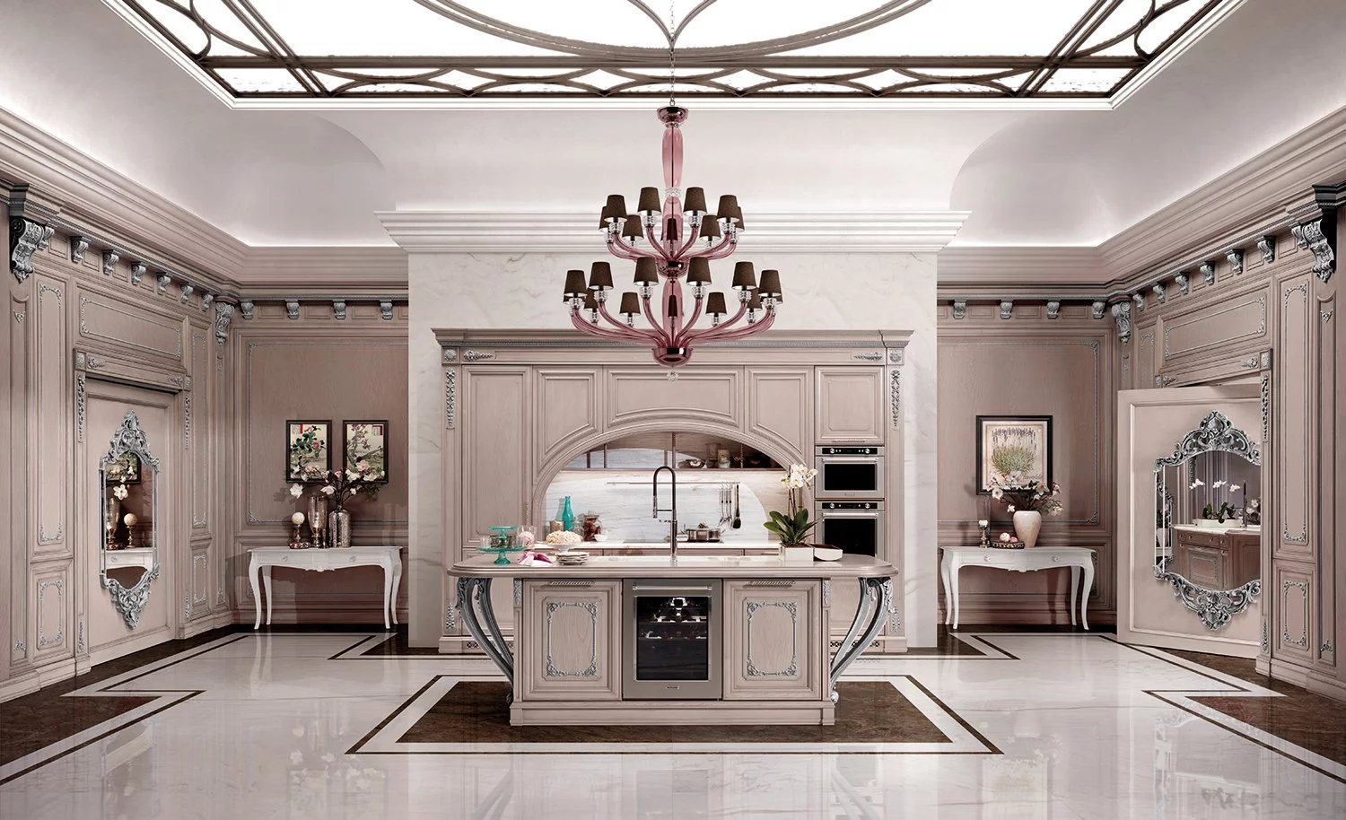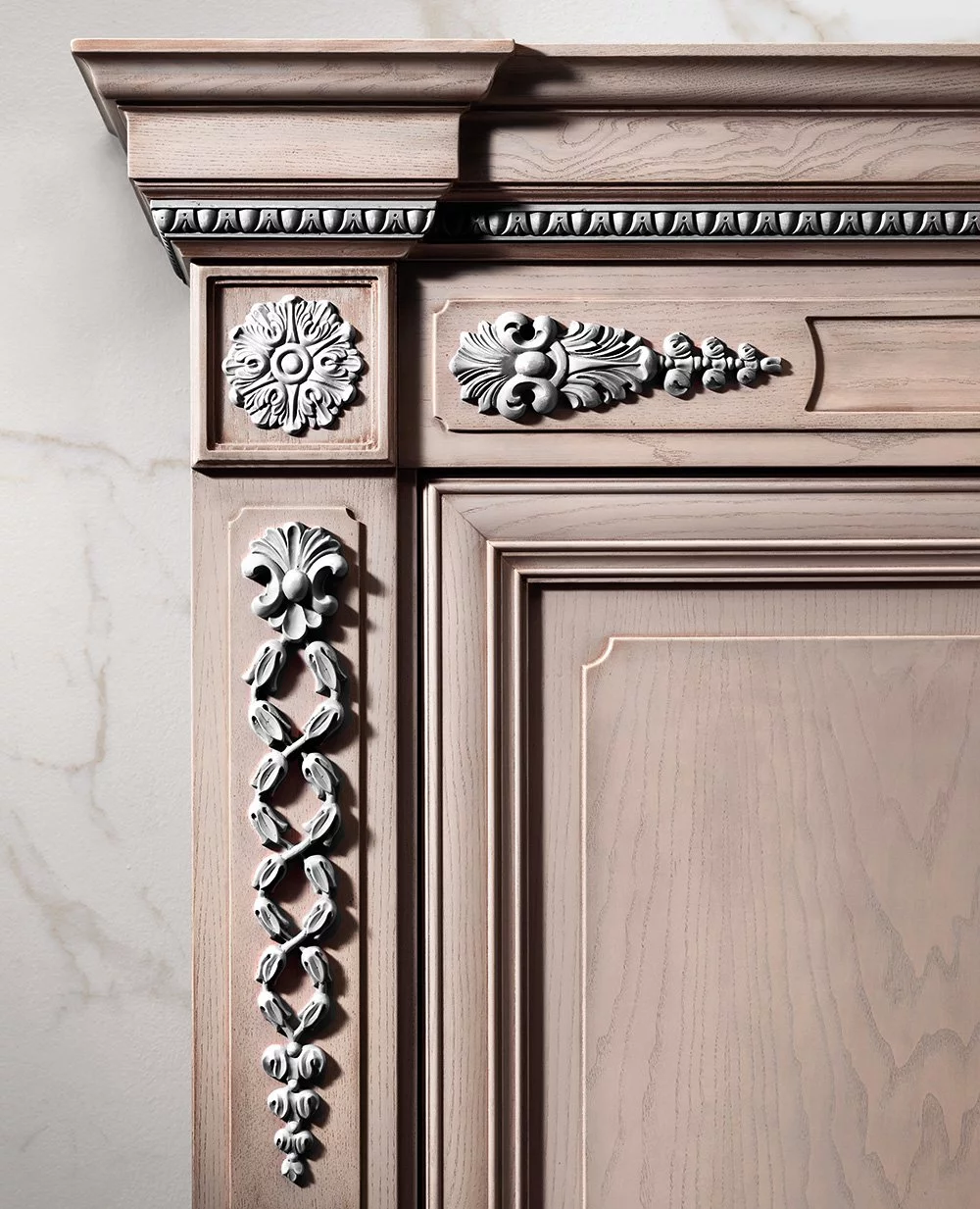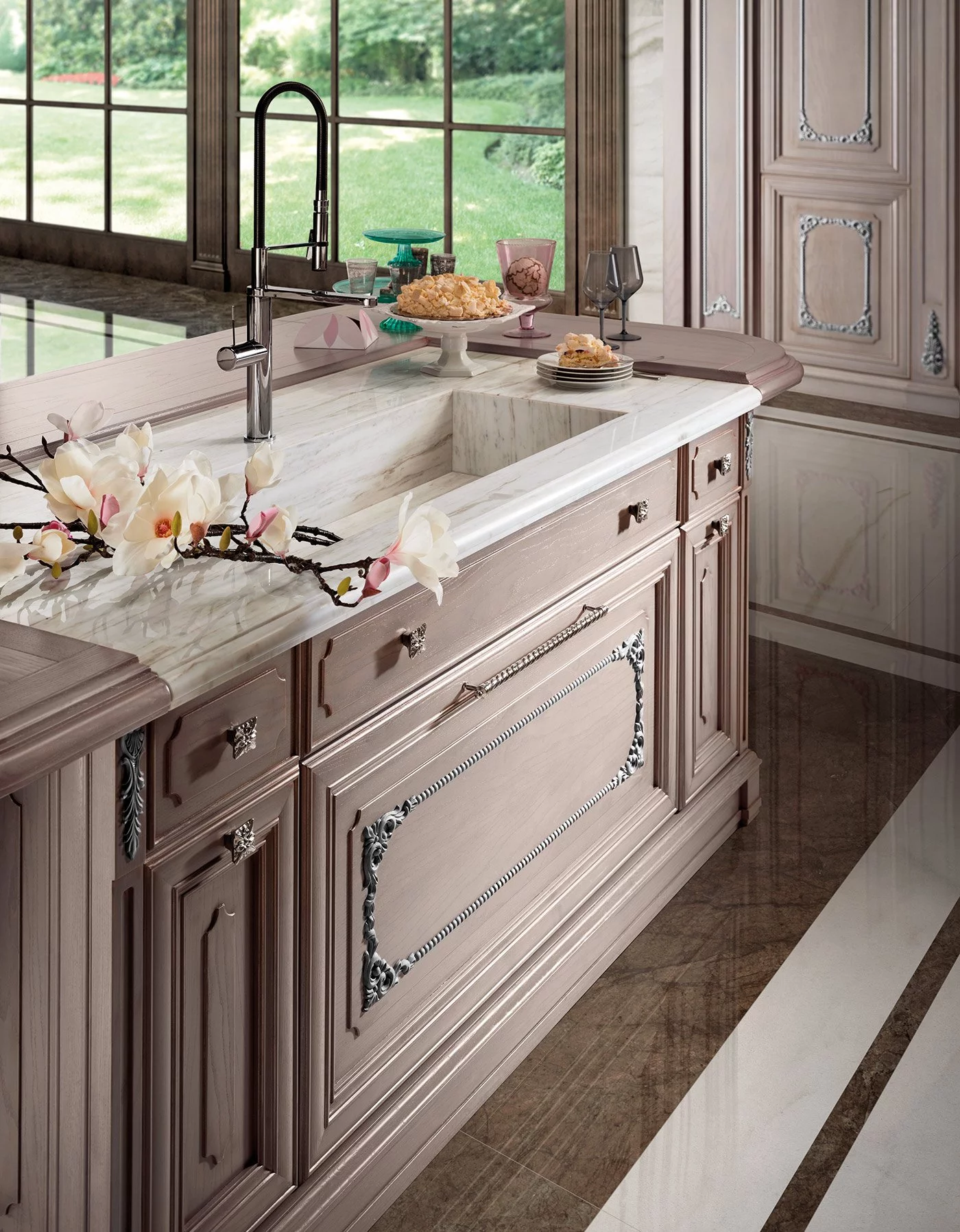 Уникальная кухня Regina от фабрики Prestige придётся по вкусу романтическим натурам. Королевская «классика», выполненная в оттенке розового золота, украшена многочисленной лепниной античного стиля. Это изделие обязательно станет центром притяжения любого домашнего пространства, даря неповторимую атмосферу уюта, тепла и гармонии.