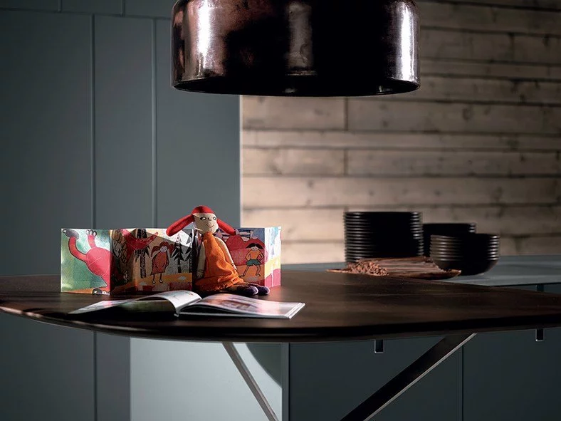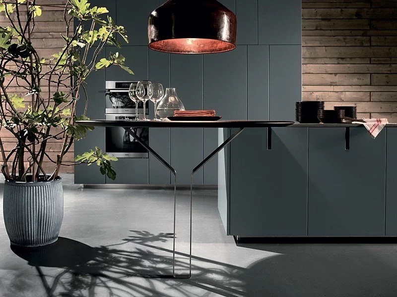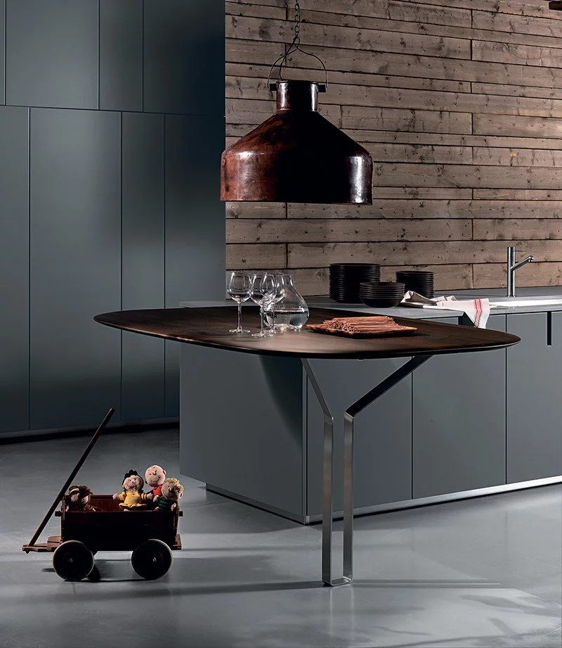 Идеально ровные гладкие фасады, тонкая столешница шоколадного цвета, опирающаяся на тонкую ассиметричную ножку обеденного стола — отличное решение рационального использования пространства в совокупности с созданием комфортной рабочей зоны.