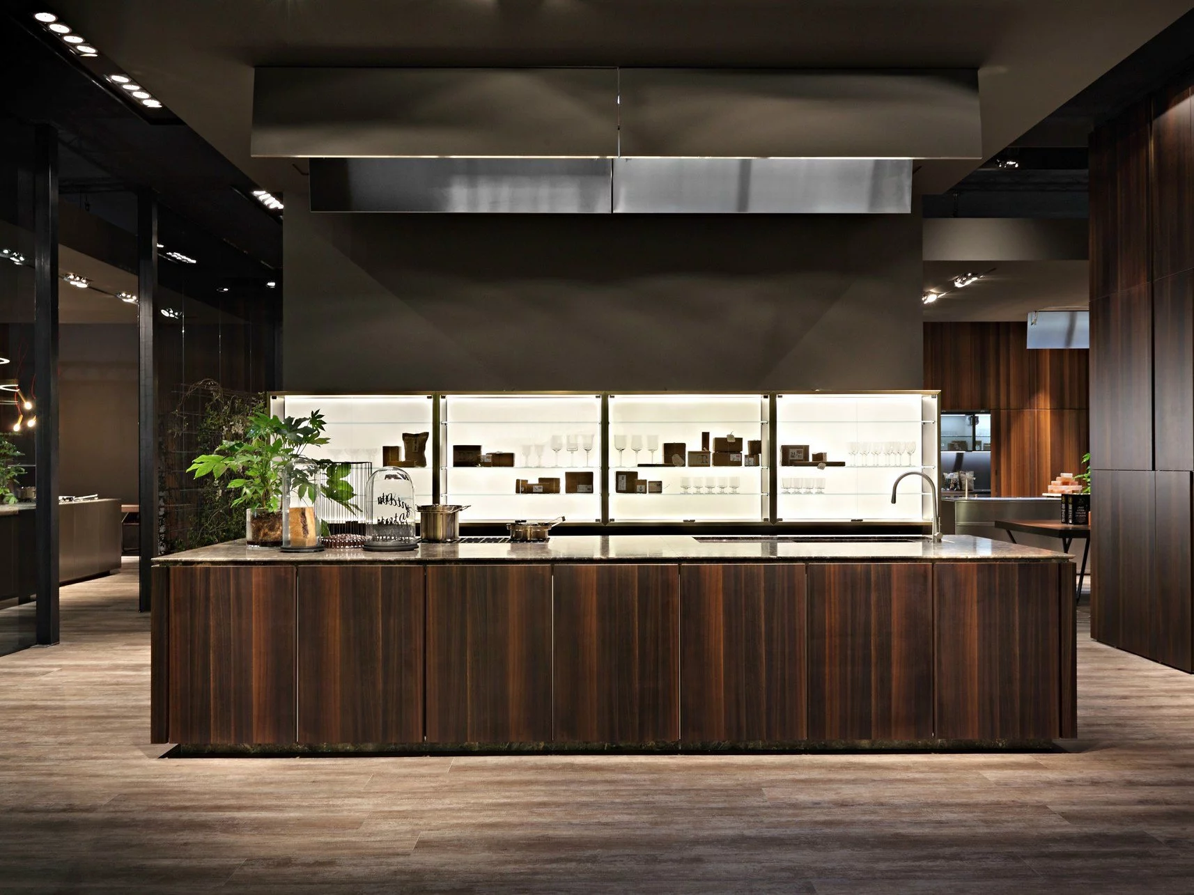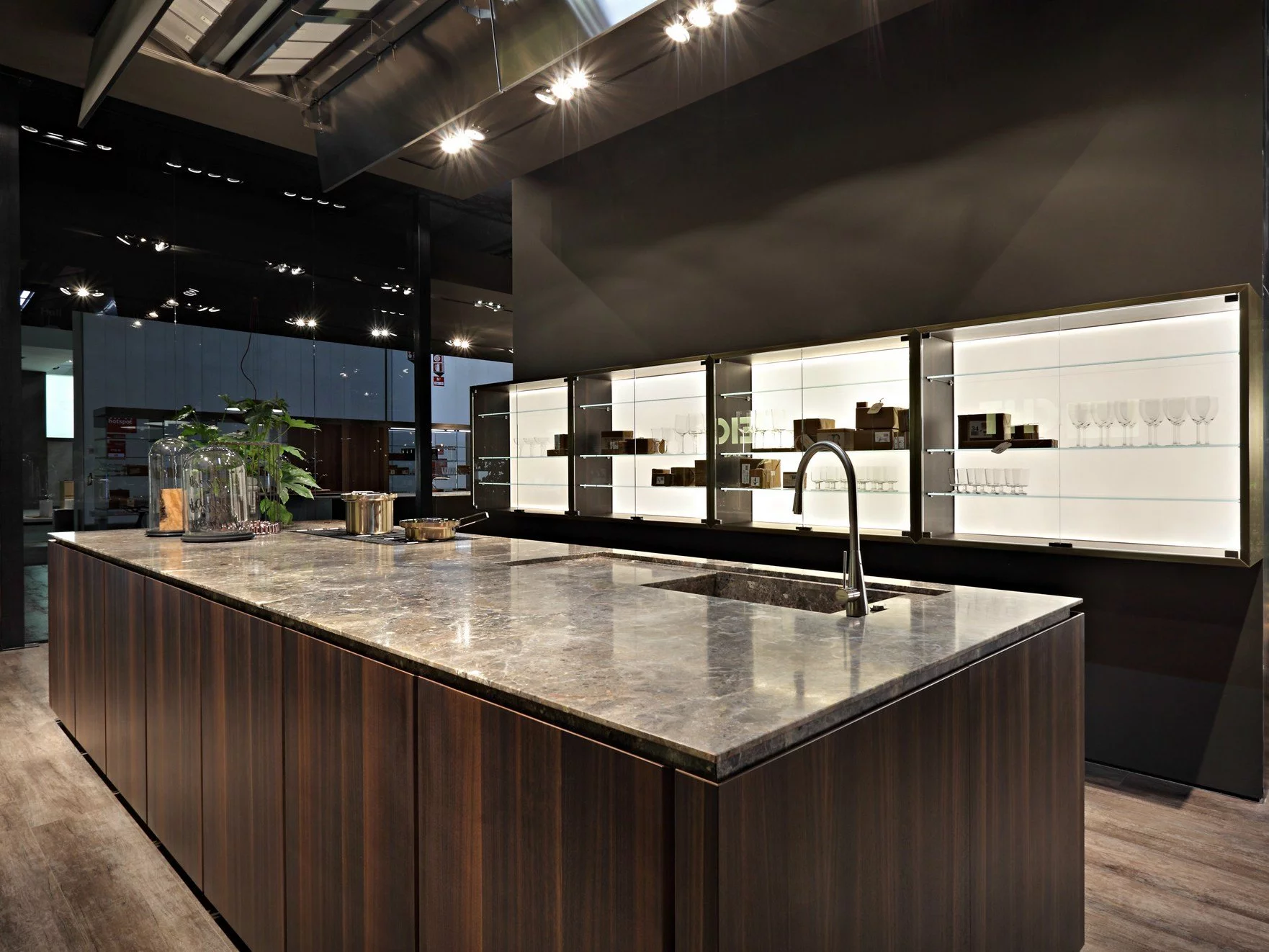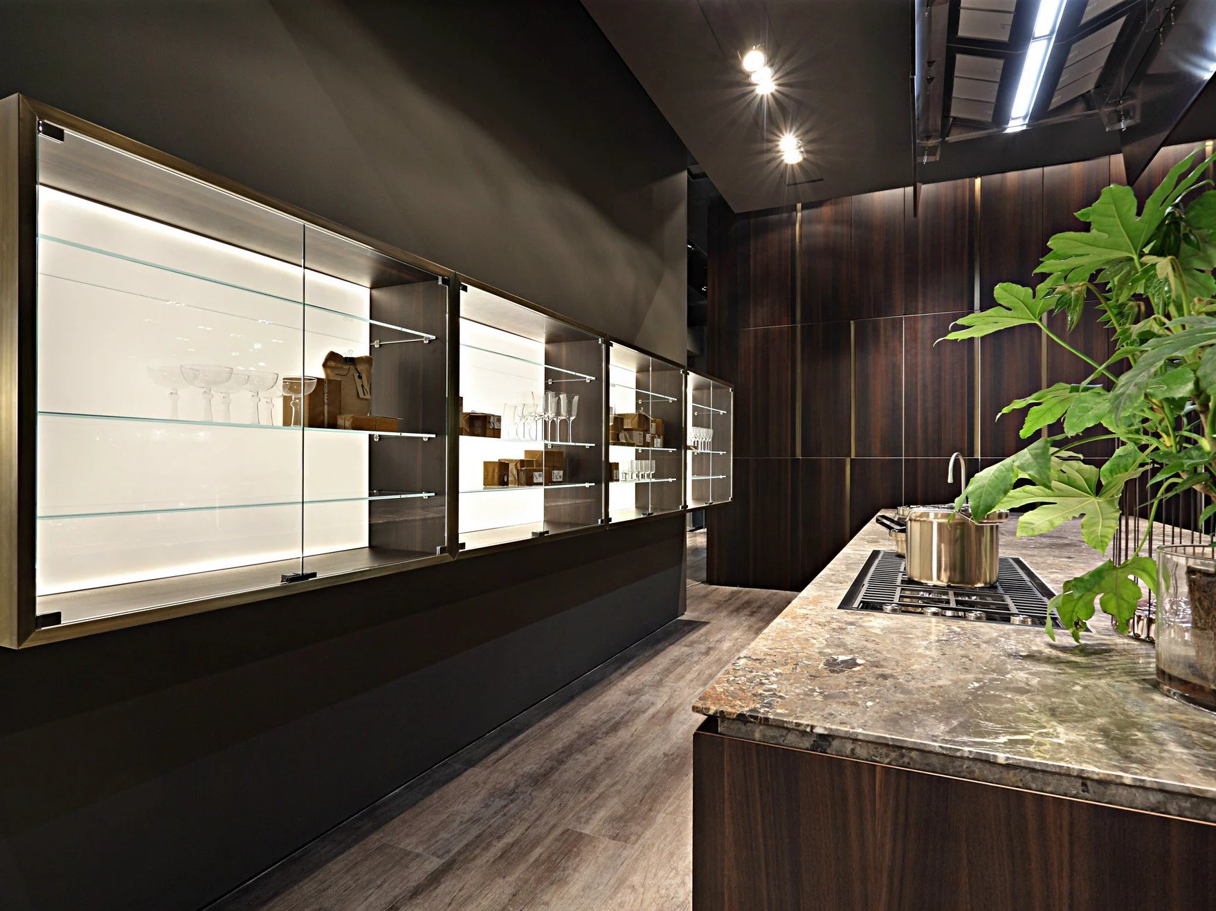 Прозрачные стеклянные фасады настенных модулей, оборудованные дополнительным освещением и стеклянными внутренними полками, создают в помещении приглушенный свет. Мраморная столешница оборудована мойкой и встроенной плитой. Закрытые фасады из натурального дерева скрывают выдвижные шкафы, создавая совершенно новую систему хранения.