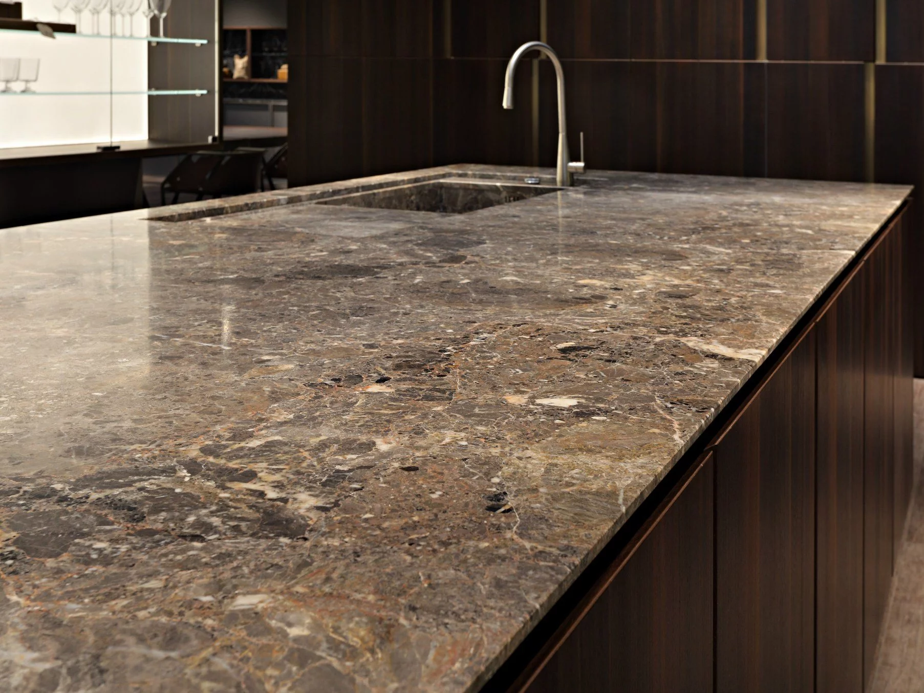 Кухня W75 фабрики Rossana — добротность и солидность мрамора и натурального дерева, сочетающихся со стеклом и металлом.
