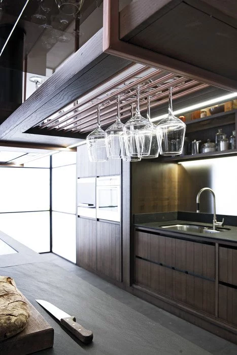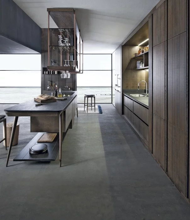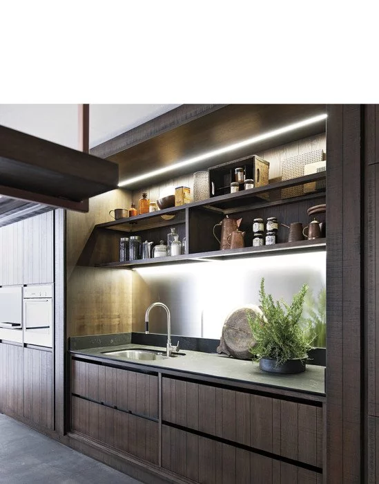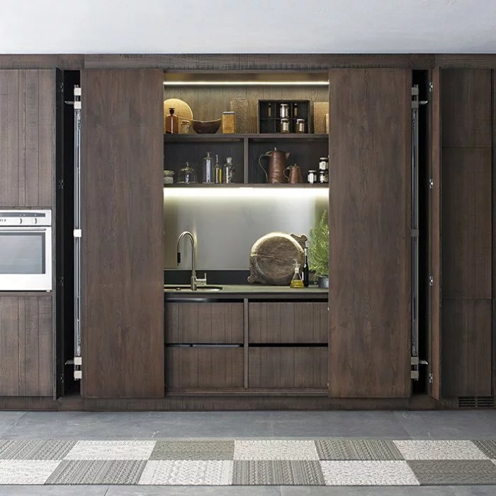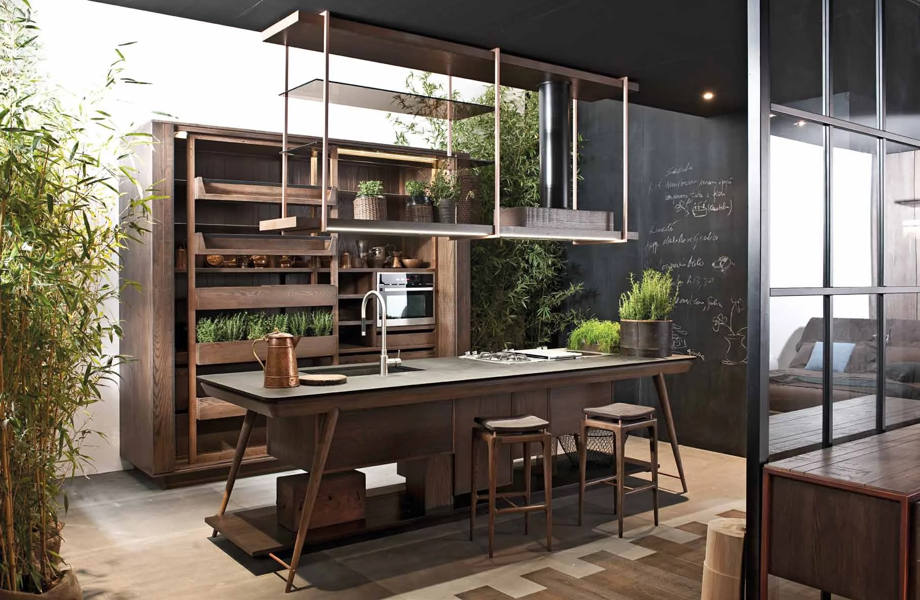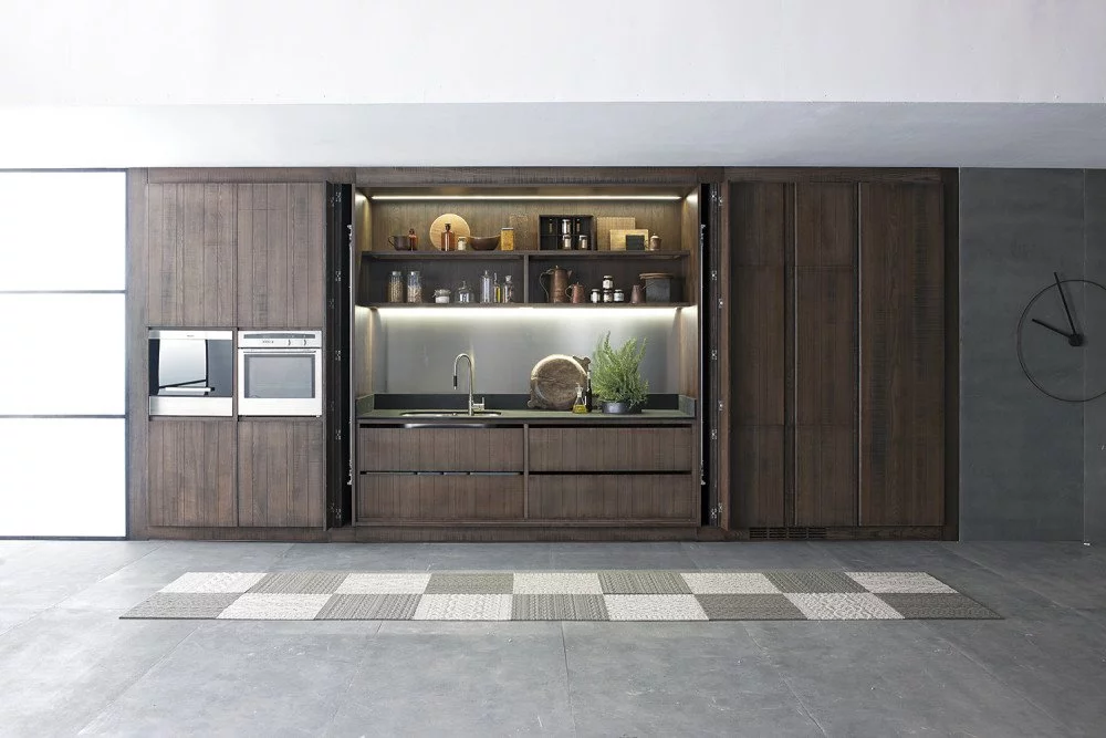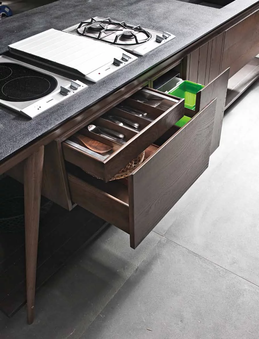 Любителям всего натурального обязательно понравится кухня La Cucina от фабрики Shake, выполненная полностью из натурального массива. В конструкцию интегрирована передвигающаяся перегородка, которая может смещаться в разные стороны, открывая доступ к выдвижным ящикам и бытовой технике. В боковых нишах прячутся глухие дверцы, которые при желании полностью скрывают фасад модели.