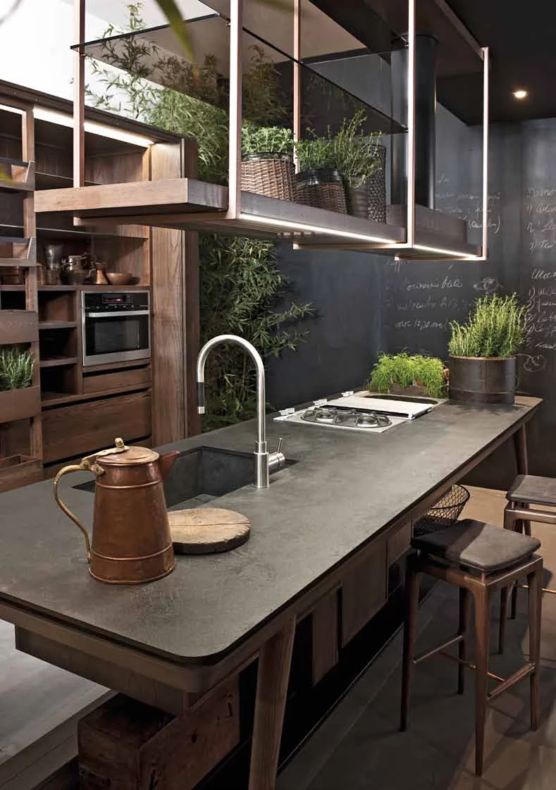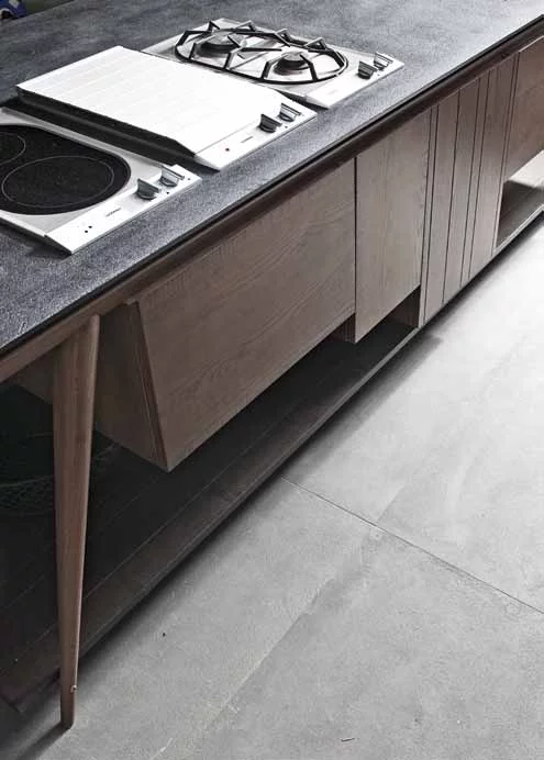 Остров кухни La Cucina опирается на четыре ножки, установленные под углом и соединяющиеся между собой деревянной полкой. На ней можно хранить посуду и необходимые аксессуары.