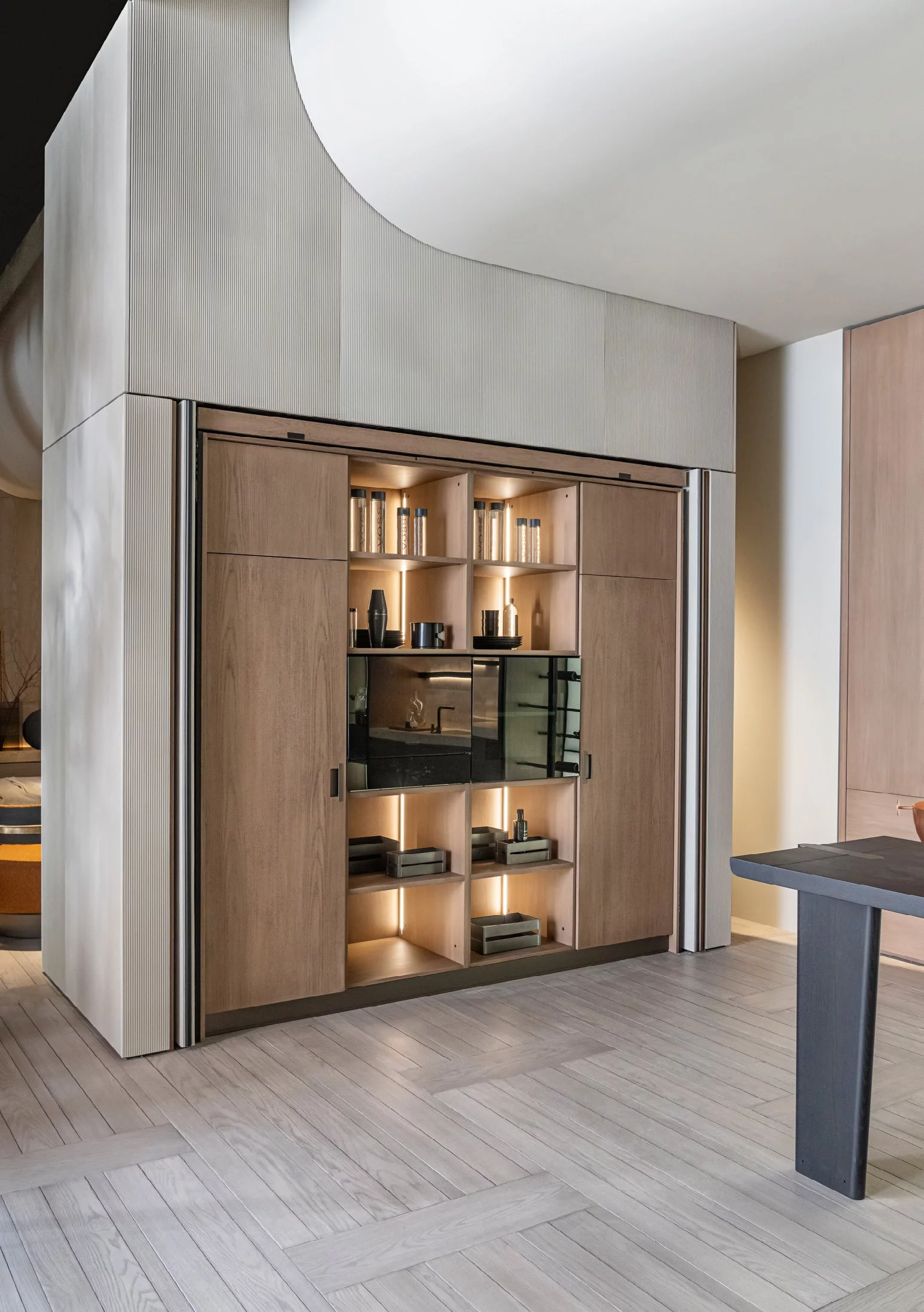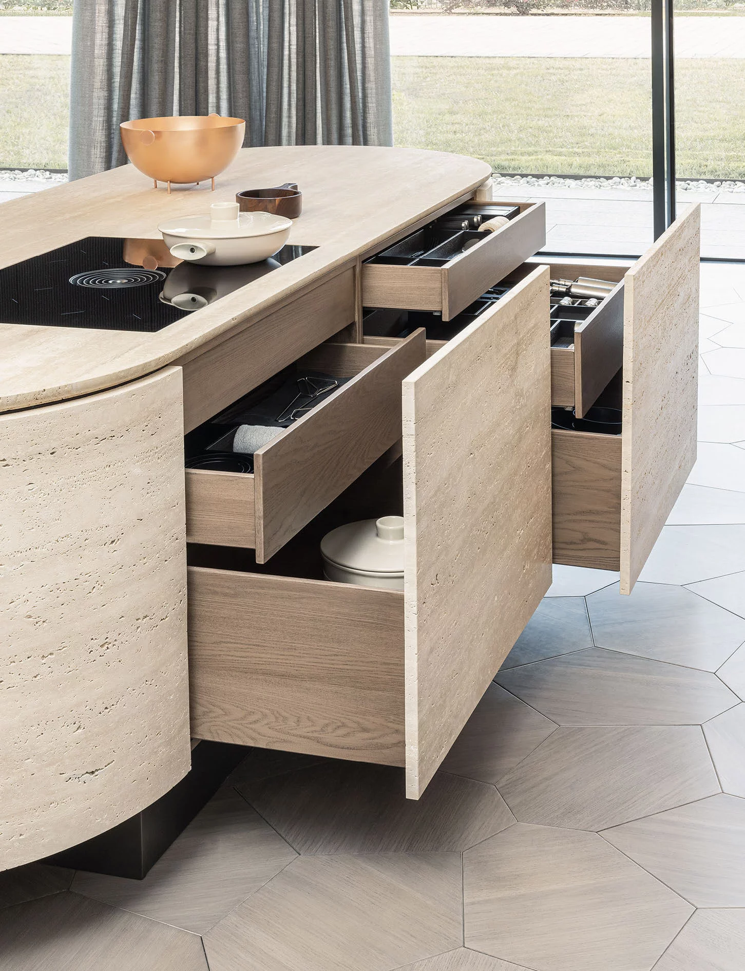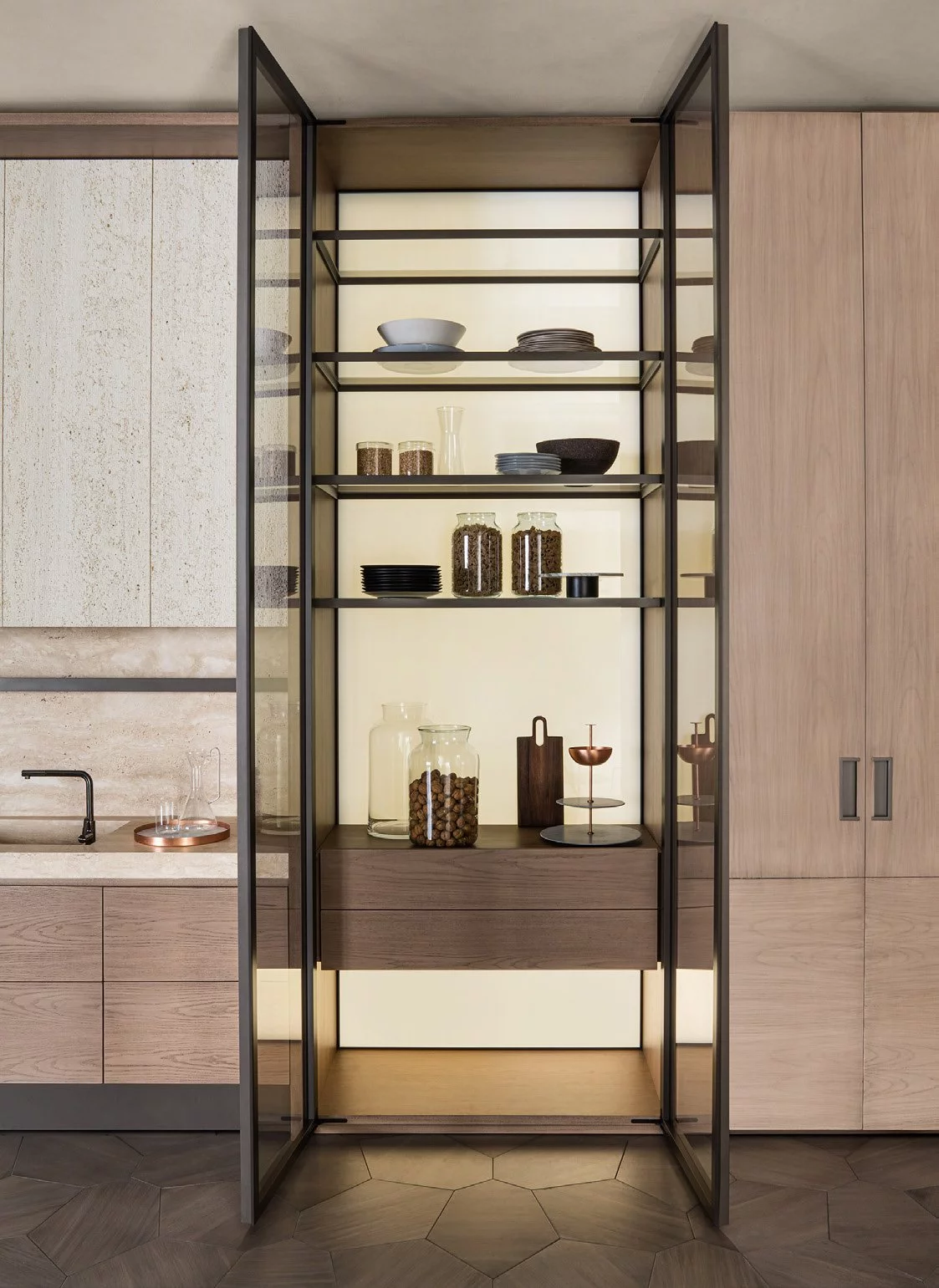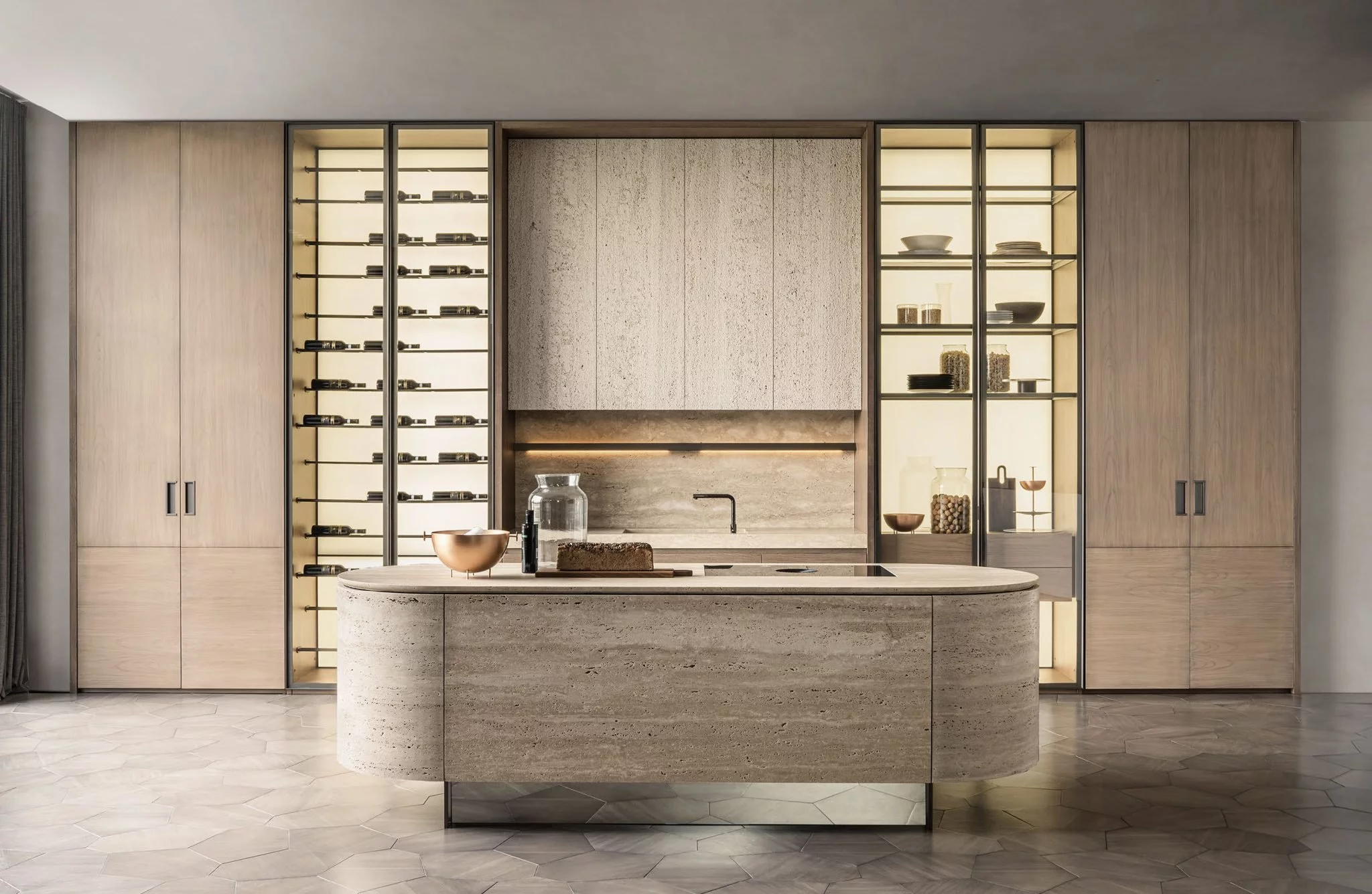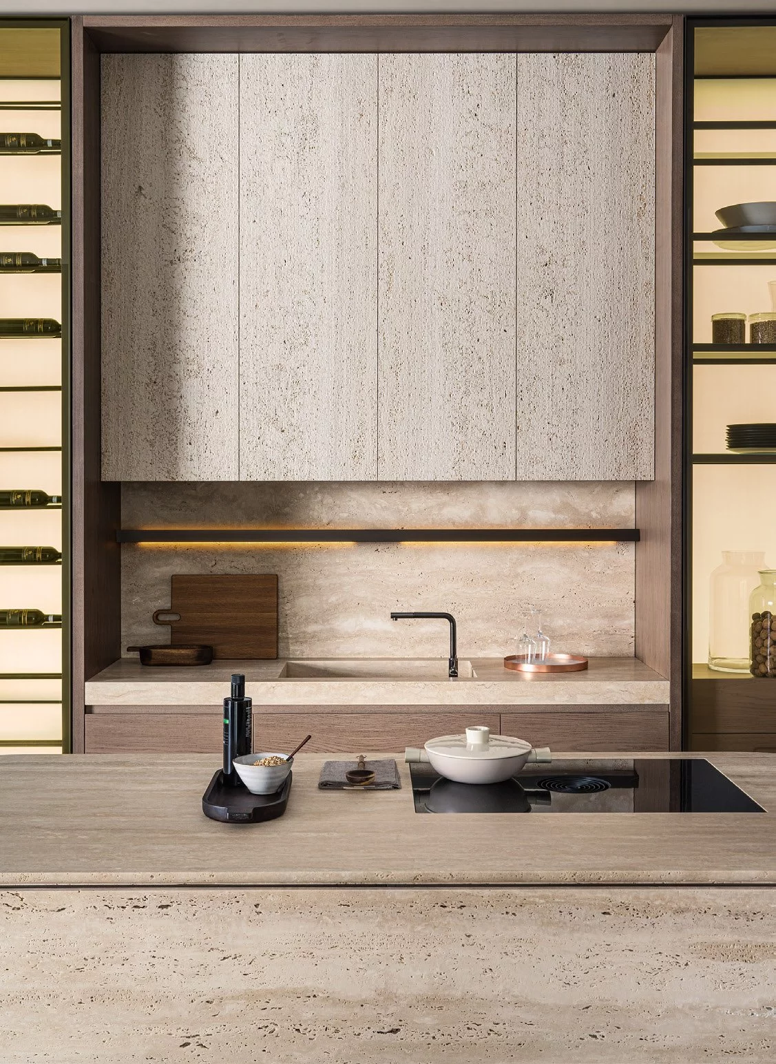 Кухня Vogue представляет собой воплощение гармонии между функциональностью и эстетикой, современным стилем и уютом, изысканностью и строгостью. В создании этой кухни бренд Shake поднимает планку дизайна на новый уровень, переосмысливая и творчески преображая материалы, технологии и формы. Высокие шкафы из дерева T158 в оттенке бискотто впечатляют своей изысканностью, а витрины с металлической рамой и прозрачным стеклом добавляют современный шик. Напольные базы, также выполненные из дерева T158 бискотто, обеспечивают не только функциональность, но и элегантность пространства. Подвесные ящики с раздвижными дверцами, обитые мрамором Травертин полосатым, добавляют штрих утонченного роскоши, создавая впечатляющий ансамбль, который впишется в любой современный интерьер.