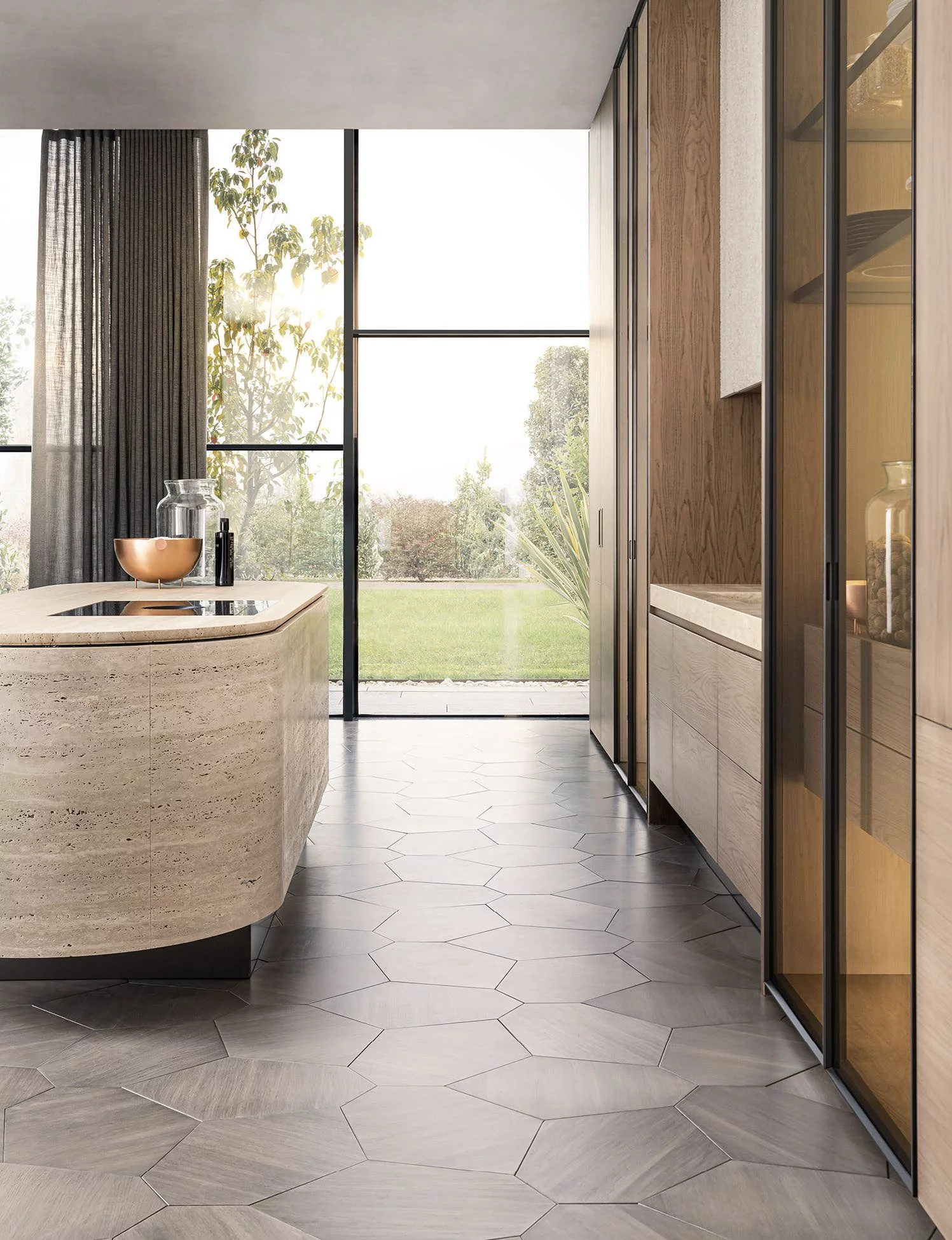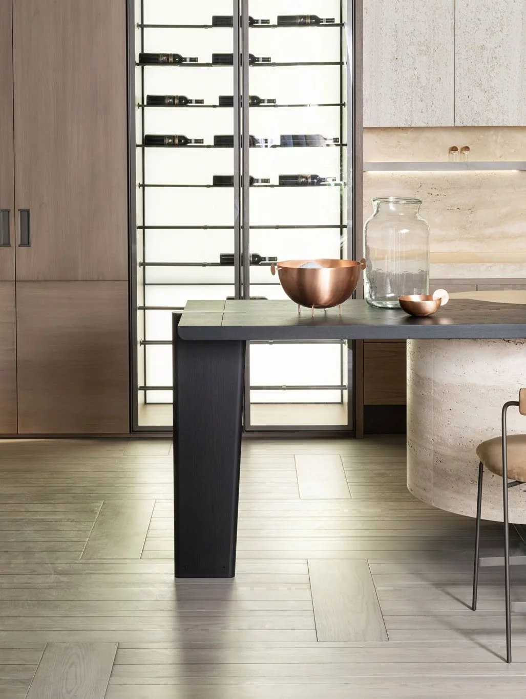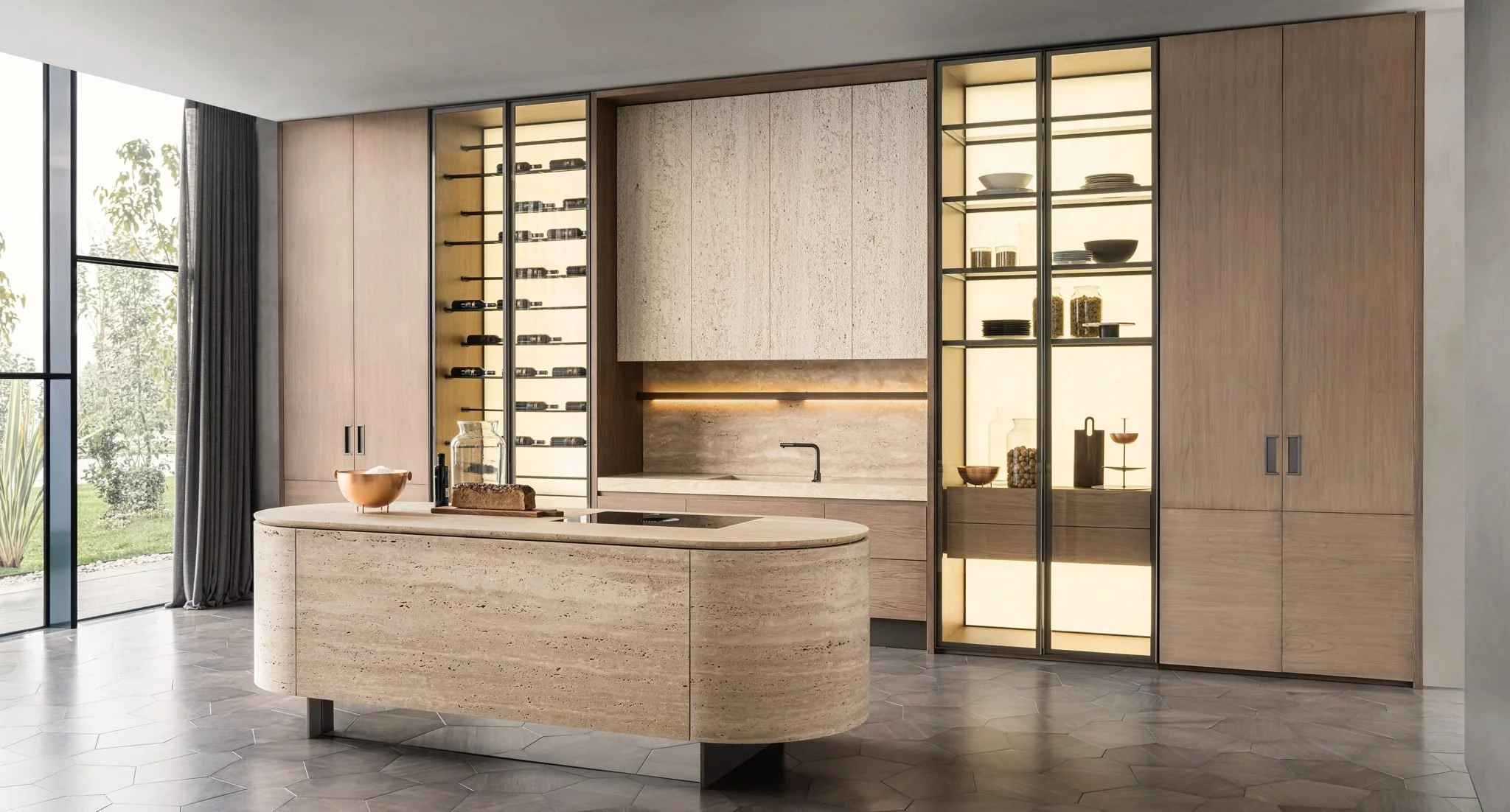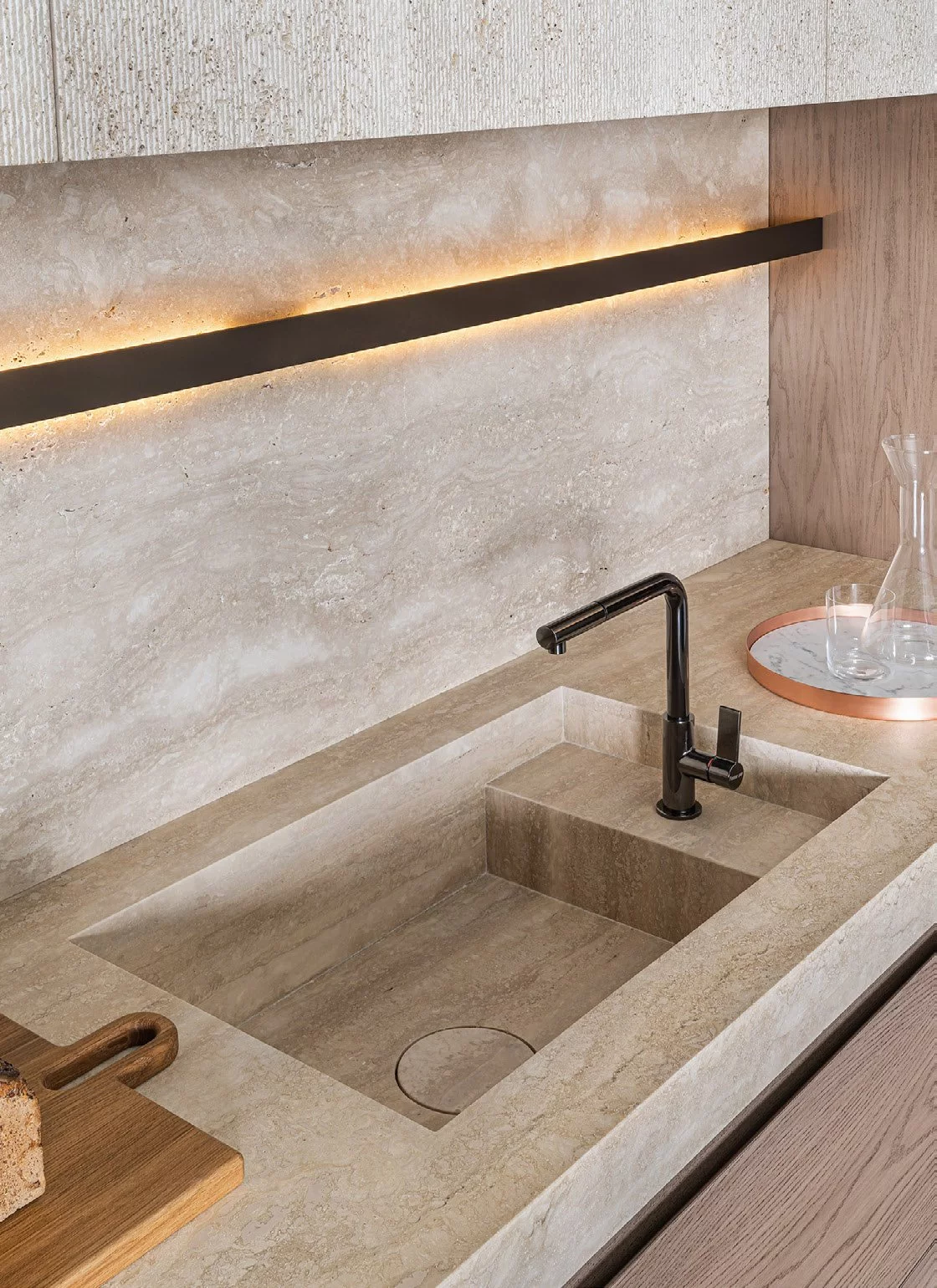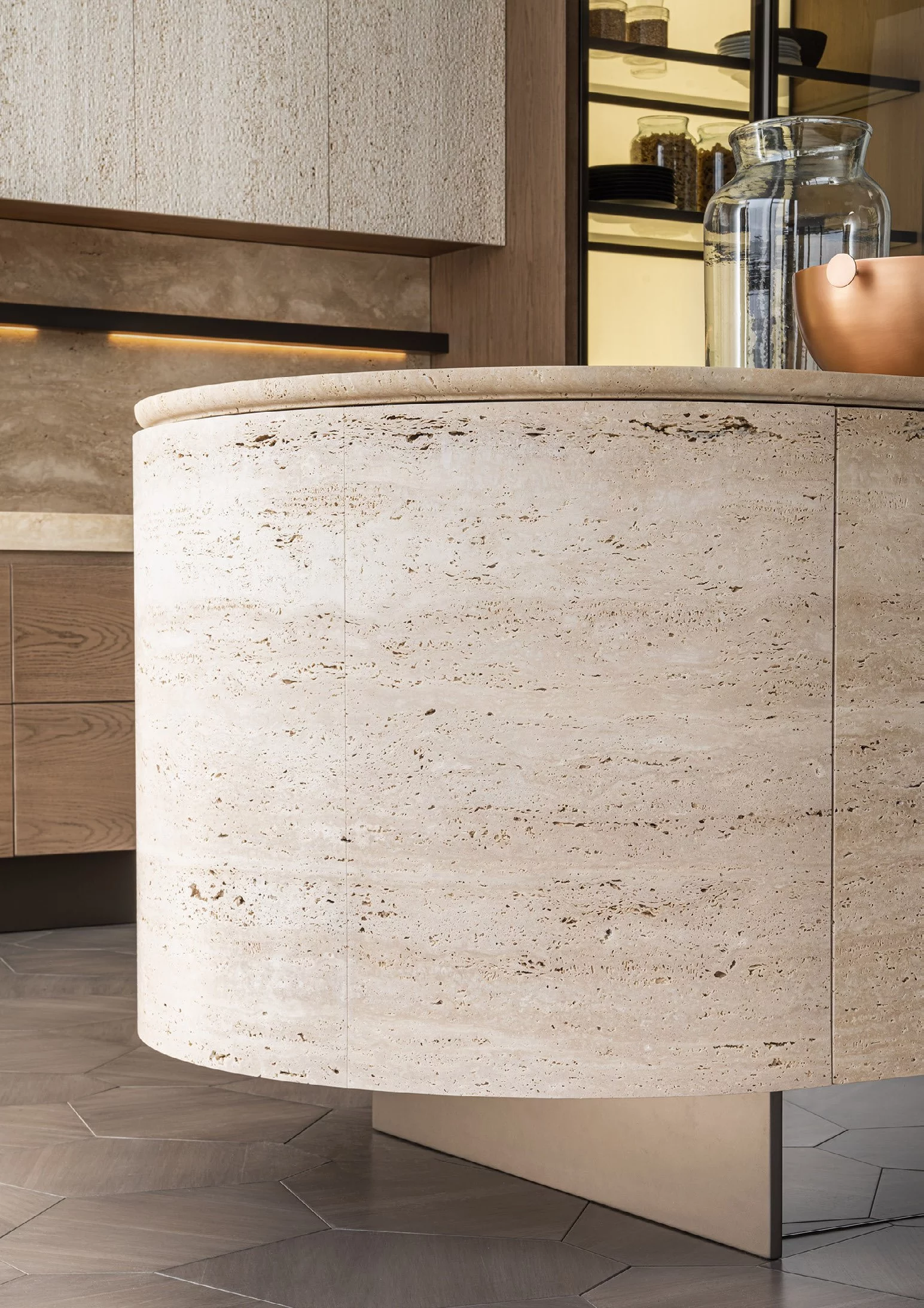 Кухня Vogue представляет собой воплощение гармонии между функциональностью и эстетикой, современным стилем и уютом, изысканностью и строгостью. В создании этой кухни бренд Shake поднимает планку дизайна на новый уровень, переосмысливая и творчески преображая материалы, технологии и формы. Высокие шкафы из дерева T158 в оттенке бискотто впечатляют своей изысканностью, а витрины с металлической рамой и прозрачным стеклом добавляют современный шик. Напольные базы, также выполненные из дерева T158 бискотто, обеспечивают не только функциональность, но и элегантность пространства. Подвесные ящики с раздвижными дверцами, обитые мрамором Травертин полосатым, добавляют штрих утонченного роскоши, создавая впечатляющий ансамбль, который впишется в любой современный интерьер.