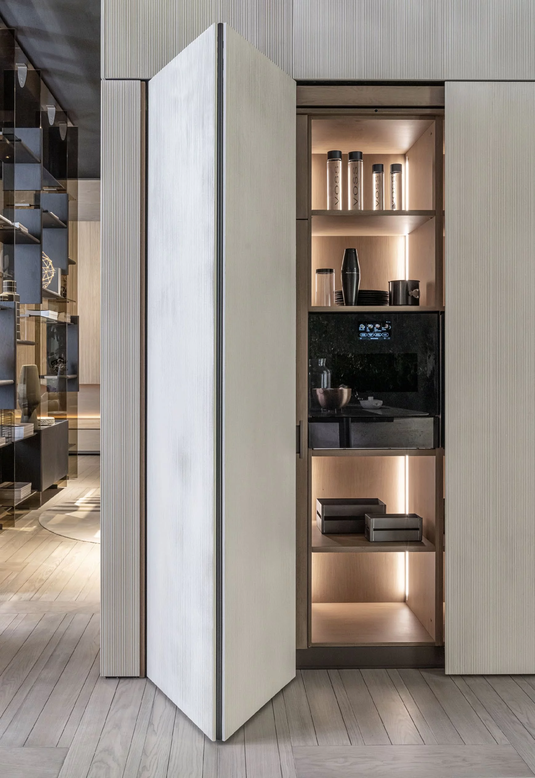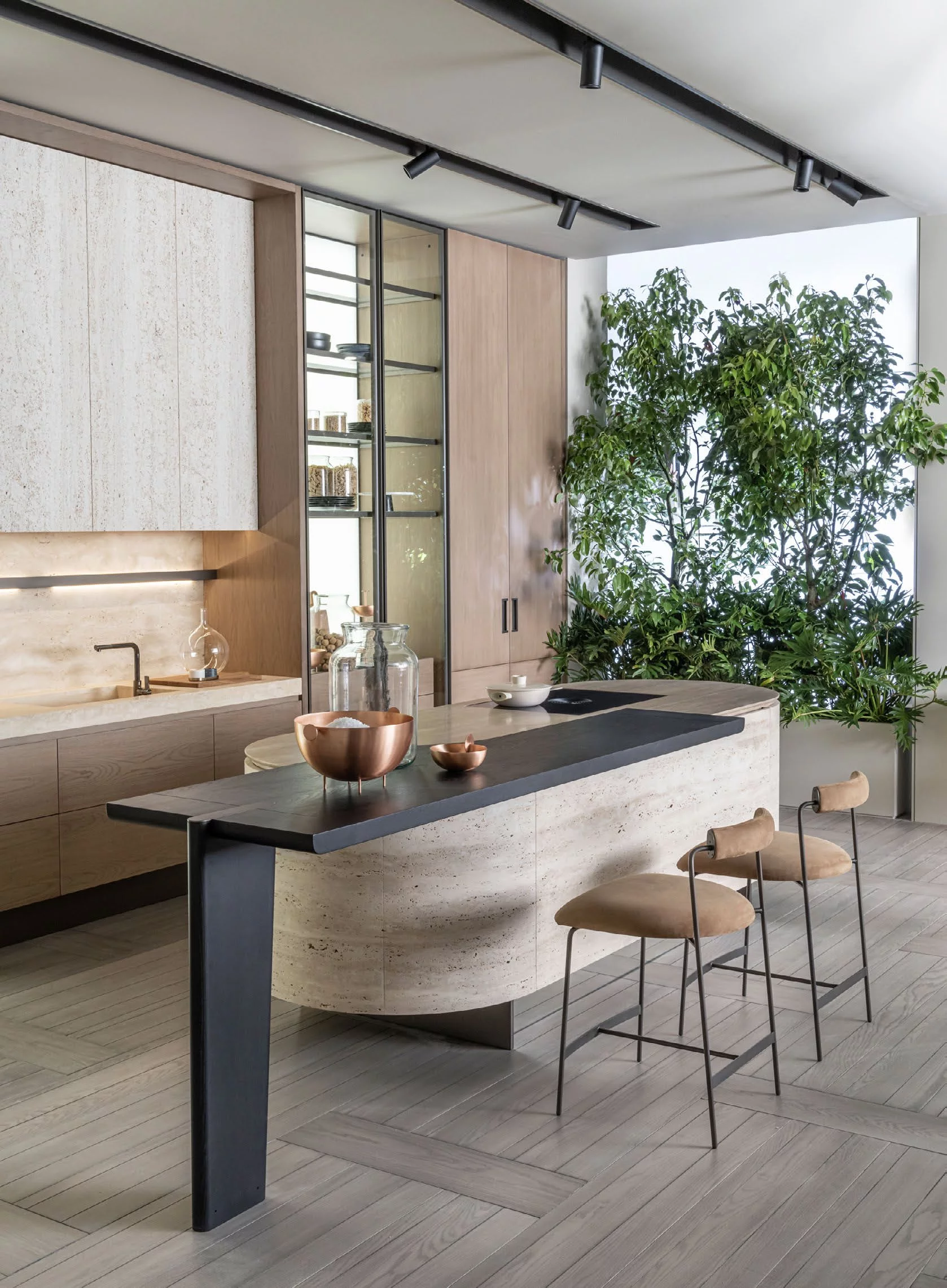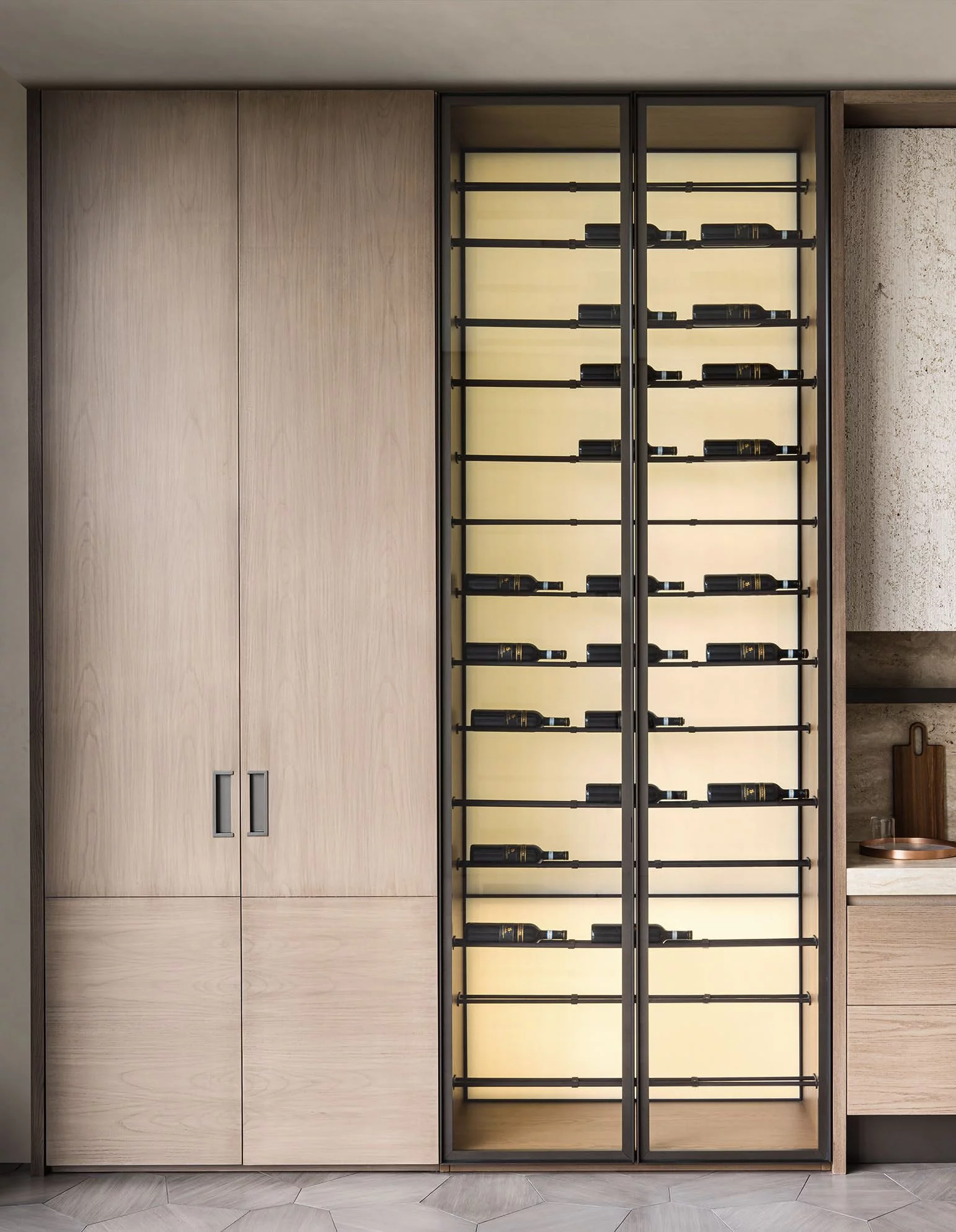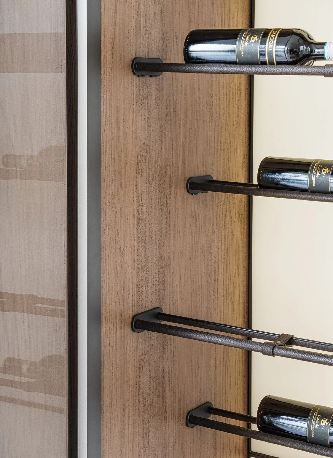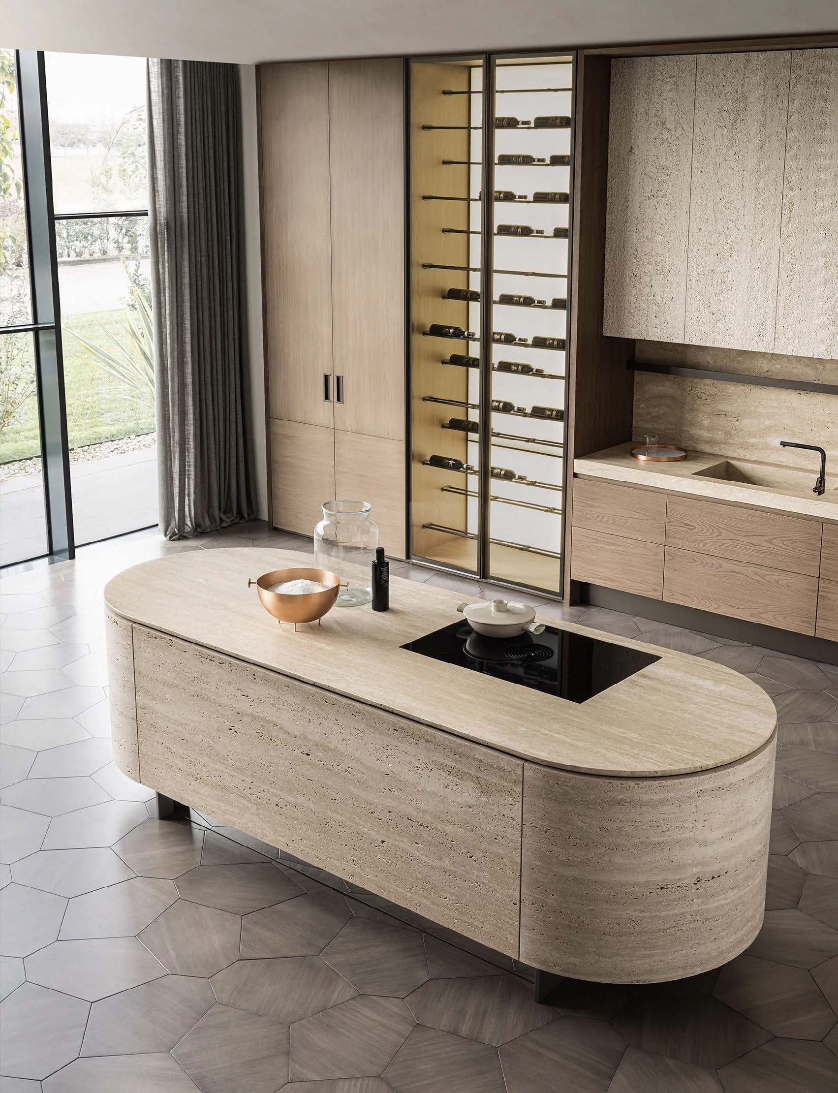 Кухня Vogue представляет собой воплощение гармонии между функциональностью и эстетикой, современным стилем и уютом, изысканностью и строгостью. В создании этой кухни бренд Shake поднимает планку дизайна на новый уровень, переосмысливая и творчески преображая материалы, технологии и формы. Высокие шкафы из дерева T158 в оттенке бискотто впечатляют своей изысканностью, а витрины с металлической рамой и прозрачным стеклом добавляют современный шик. Напольные базы, также выполненные из дерева T158 бискотто, обеспечивают не только функциональность, но и элегантность пространства. Подвесные ящики с раздвижными дверцами, обитые мрамором Травертин полосатым, добавляют штрих утонченного роскоши, создавая впечатляющий ансамбль, который впишется в любой современный интерьер.
