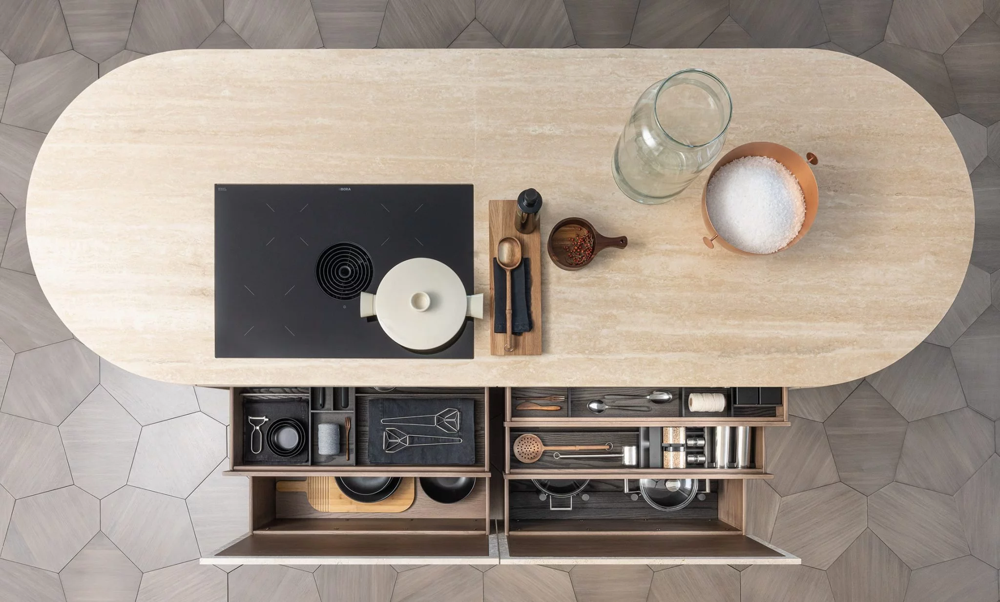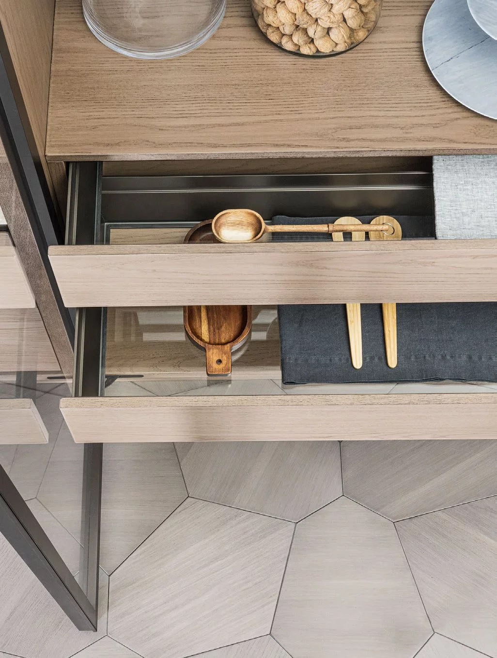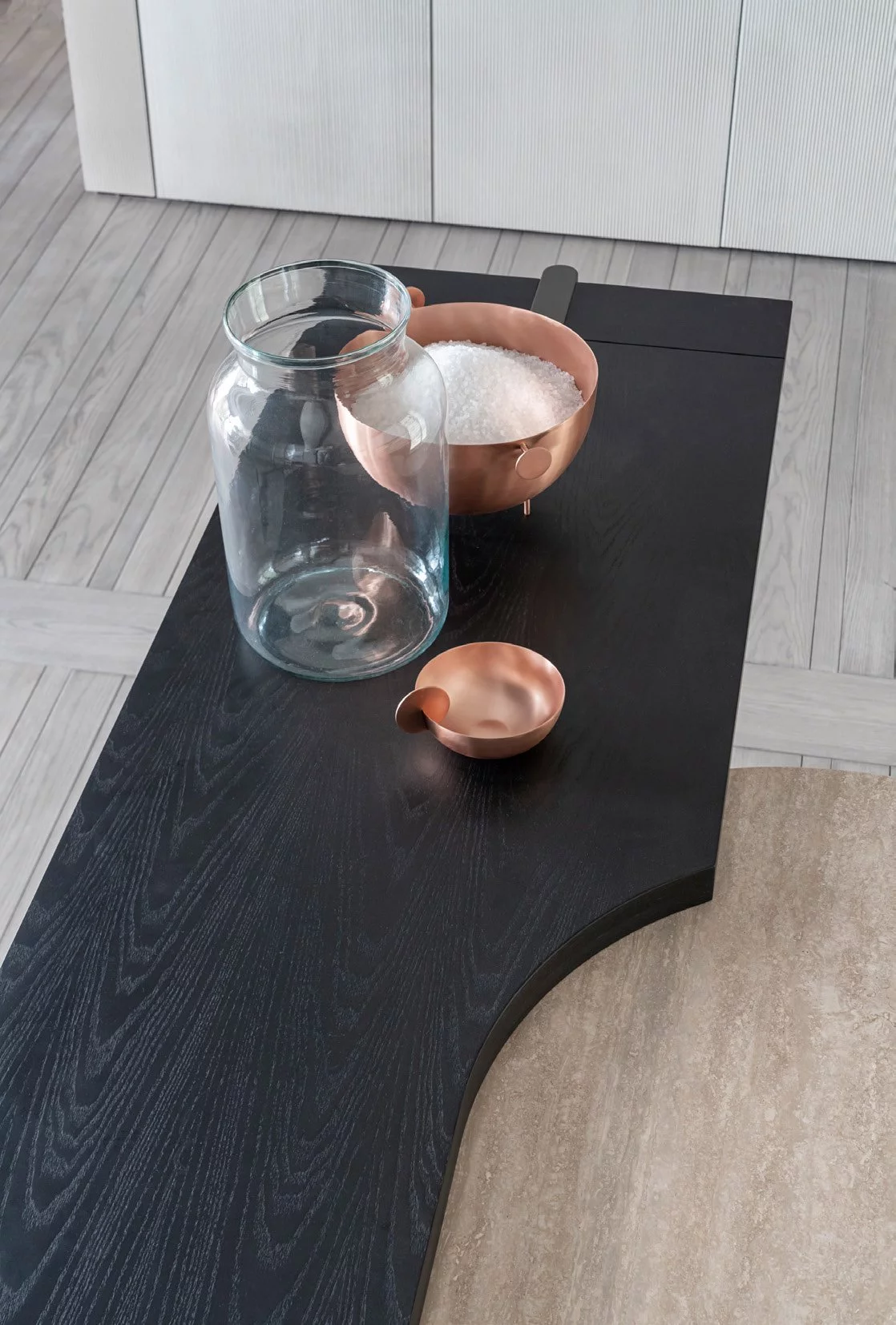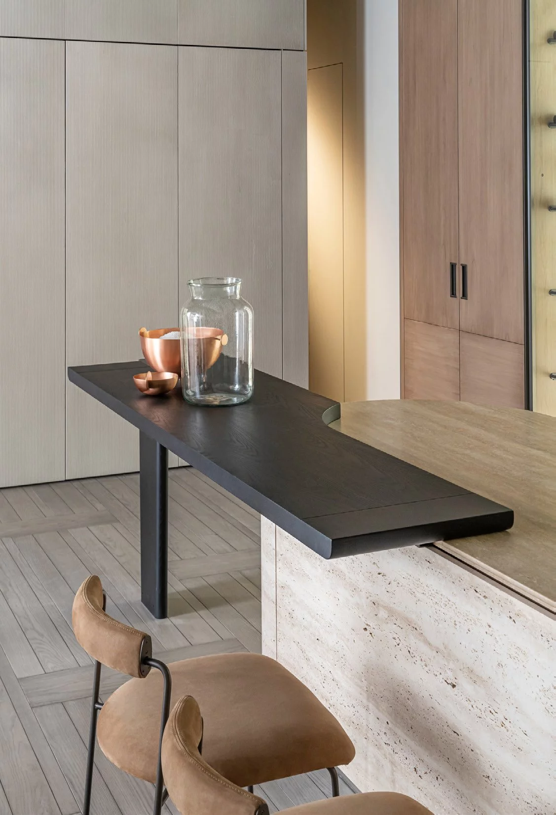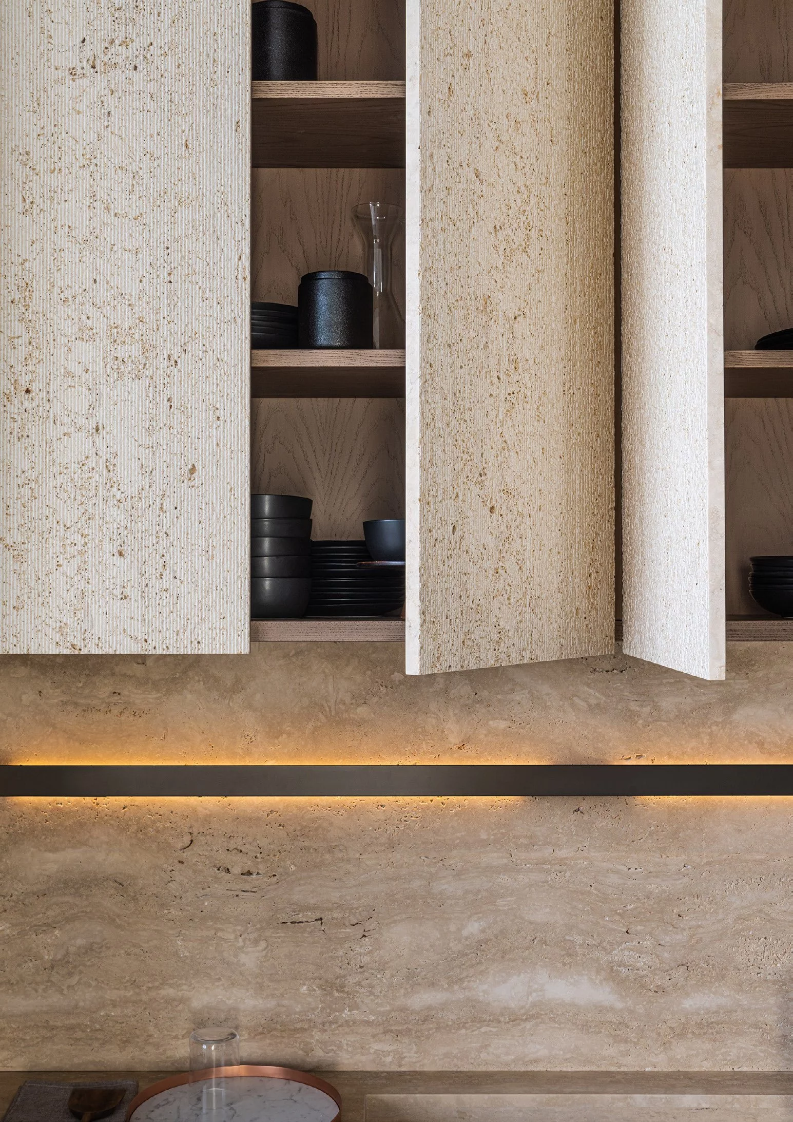 Кухня Vogue представляет собой воплощение гармонии между функциональностью и эстетикой, современным стилем и уютом, изысканностью и строгостью. В создании этой кухни бренд Shake поднимает планку дизайна на новый уровень, переосмысливая и творчески преображая материалы, технологии и формы. Высокие шкафы из дерева T158 в оттенке бискотто впечатляют своей изысканностью, а витрины с металлической рамой и прозрачным стеклом добавляют современный шик. Напольные базы, также выполненные из дерева T158 бискотто, обеспечивают не только функциональность, но и элегантность пространства. Подвесные ящики с раздвижными дверцами, обитые мрамором Травертин полосатым, добавляют штрих утонченного роскоши, создавая впечатляющий ансамбль, который впишется в любой современный интерьер.