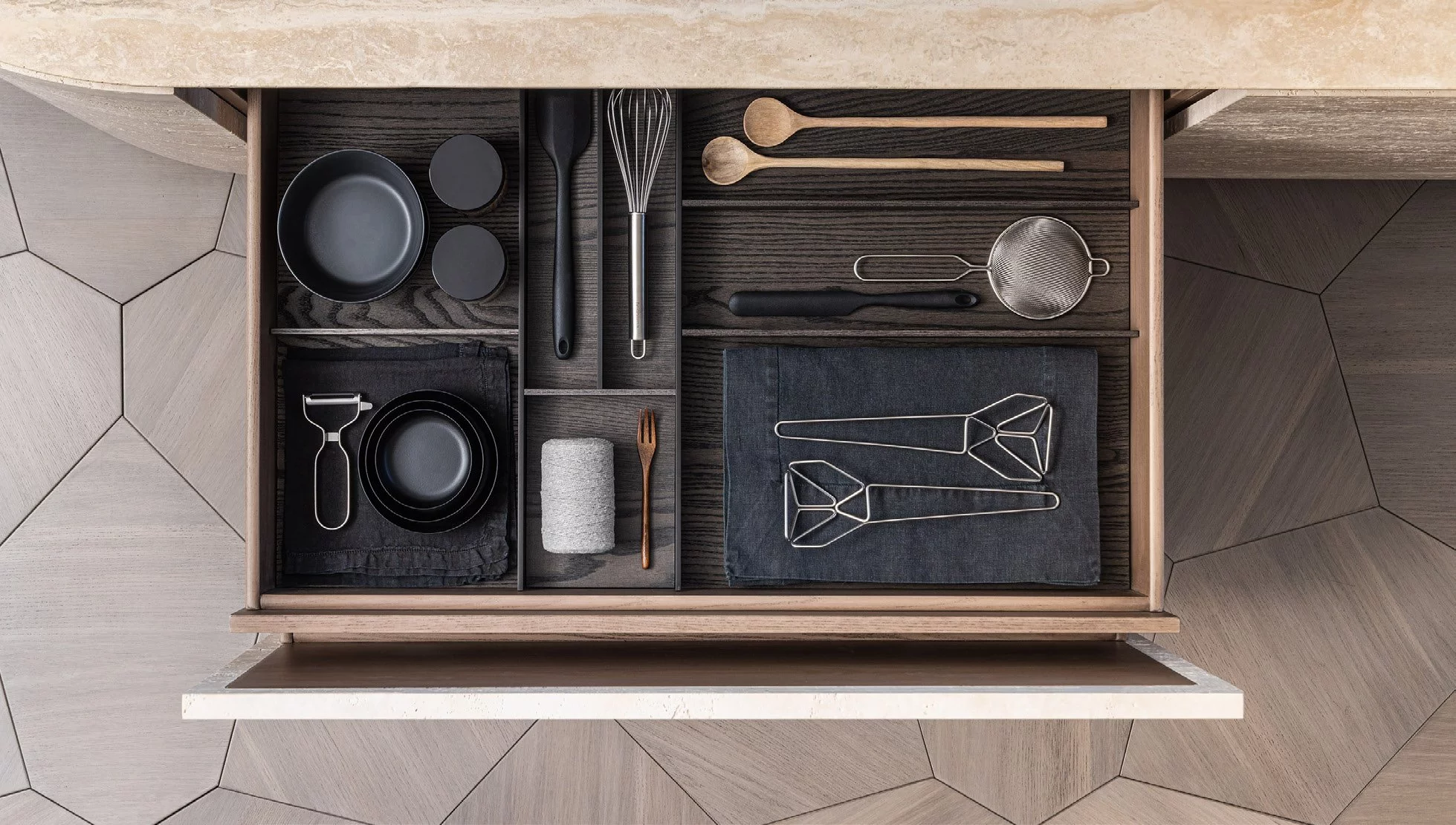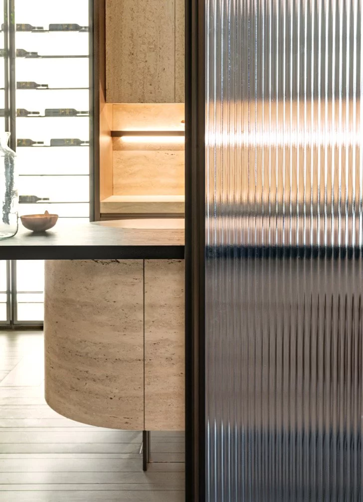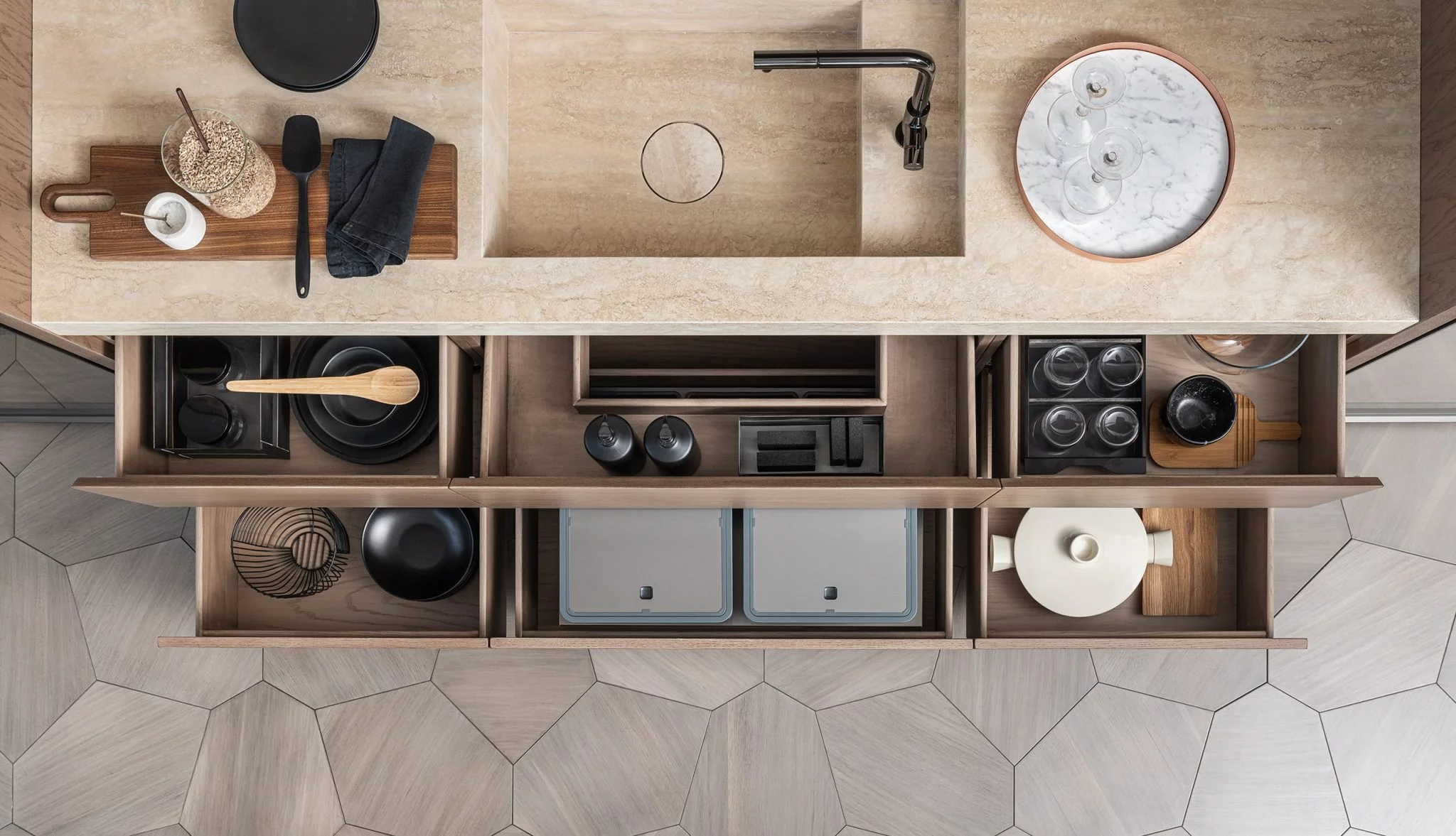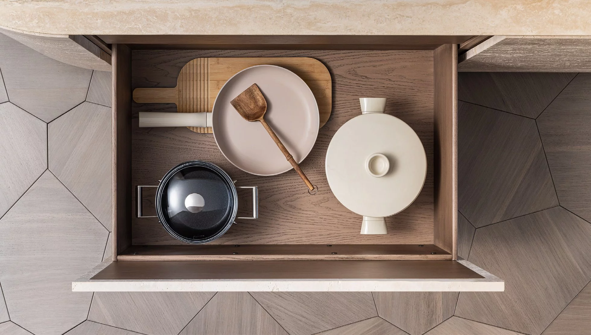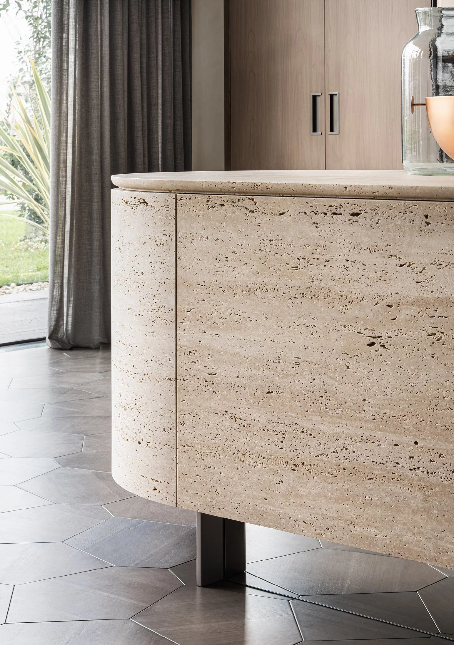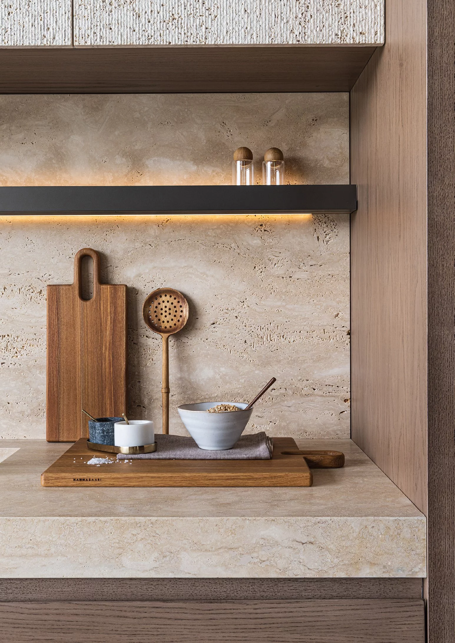 Кухня Vogue представляет собой воплощение гармонии между функциональностью и эстетикой, современным стилем и уютом, изысканностью и строгостью. В создании этой кухни бренд Shake поднимает планку дизайна на новый уровень, переосмысливая и творчески преображая материалы, технологии и формы. Высокие шкафы из дерева T158 в оттенке бискотто впечатляют своей изысканностью, а витрины с металлической рамой и прозрачным стеклом добавляют современный шик. Напольные базы, также выполненные из дерева T158 бискотто, обеспечивают не только функциональность, но и элегантность пространства. Подвесные ящики с раздвижными дверцами, обитые мрамором Травертин полосатым, добавляют штрих утонченного роскоши, создавая впечатляющий ансамбль, который впишется в любой современный интерьер.