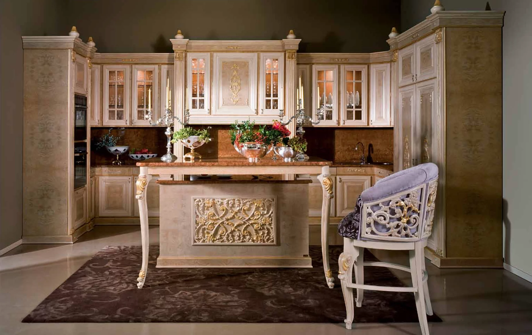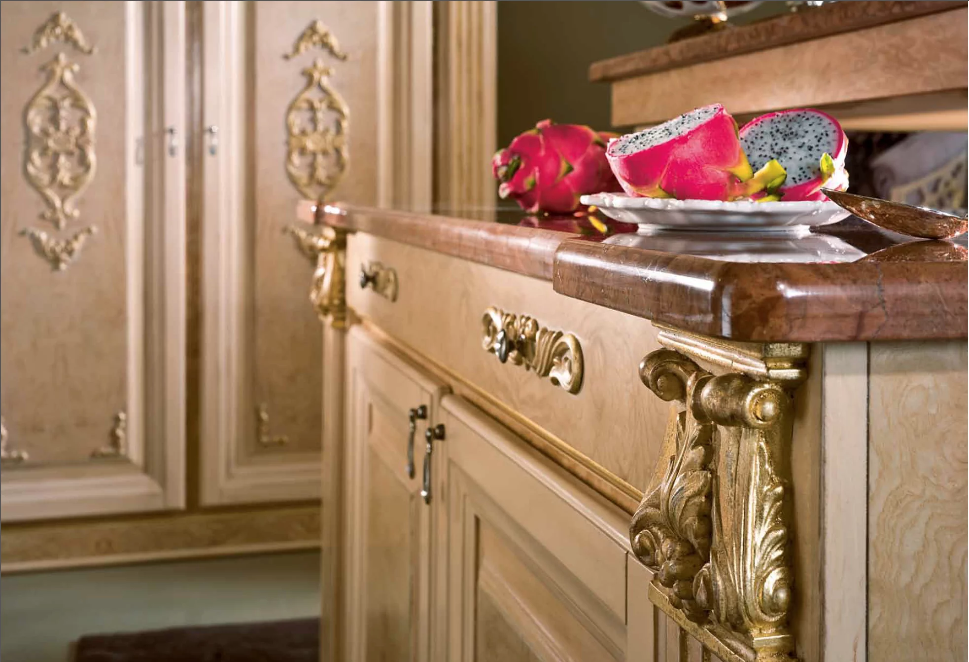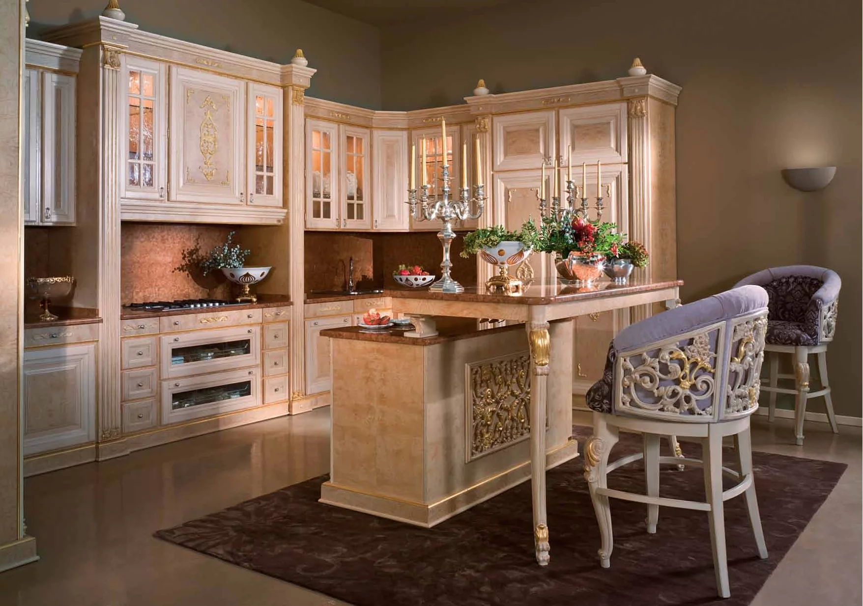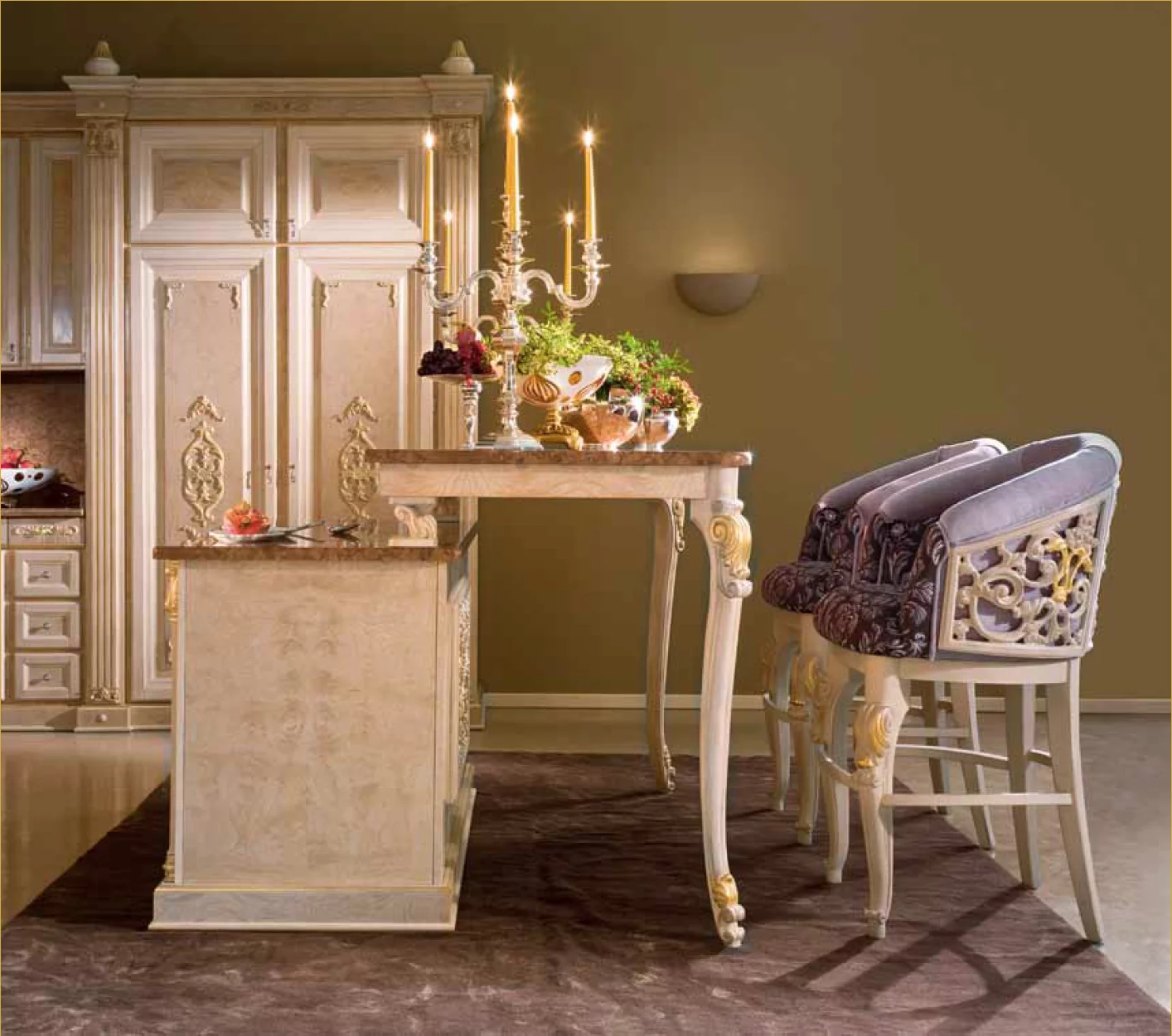 Необычайно красивая кухня Visions Du Gout Medoc от фабрики Socci Anchise — истинный эталон классического гарнитура, который приблизит любой интерьер к высокому дворцовому стилю. В этой уникальной модели заключено сочетание традиционных решений мебельного дела и современных модных тенденций. Кухня не только радует своим эстетичным внешним видом, но и очень удобна благодаря большому количеству шкафчиков и полок. Также впечатляет высокий, как барная стойка, обеденный стол и дополняющие его мягкие стулья. Кухня Visions Du Gout Medoc выполнена из ценных пород дерева, что обеспечивает надежность мебели, и предлагается в цветовом решении "crema" с оригинальной отделкой золотой палитры.