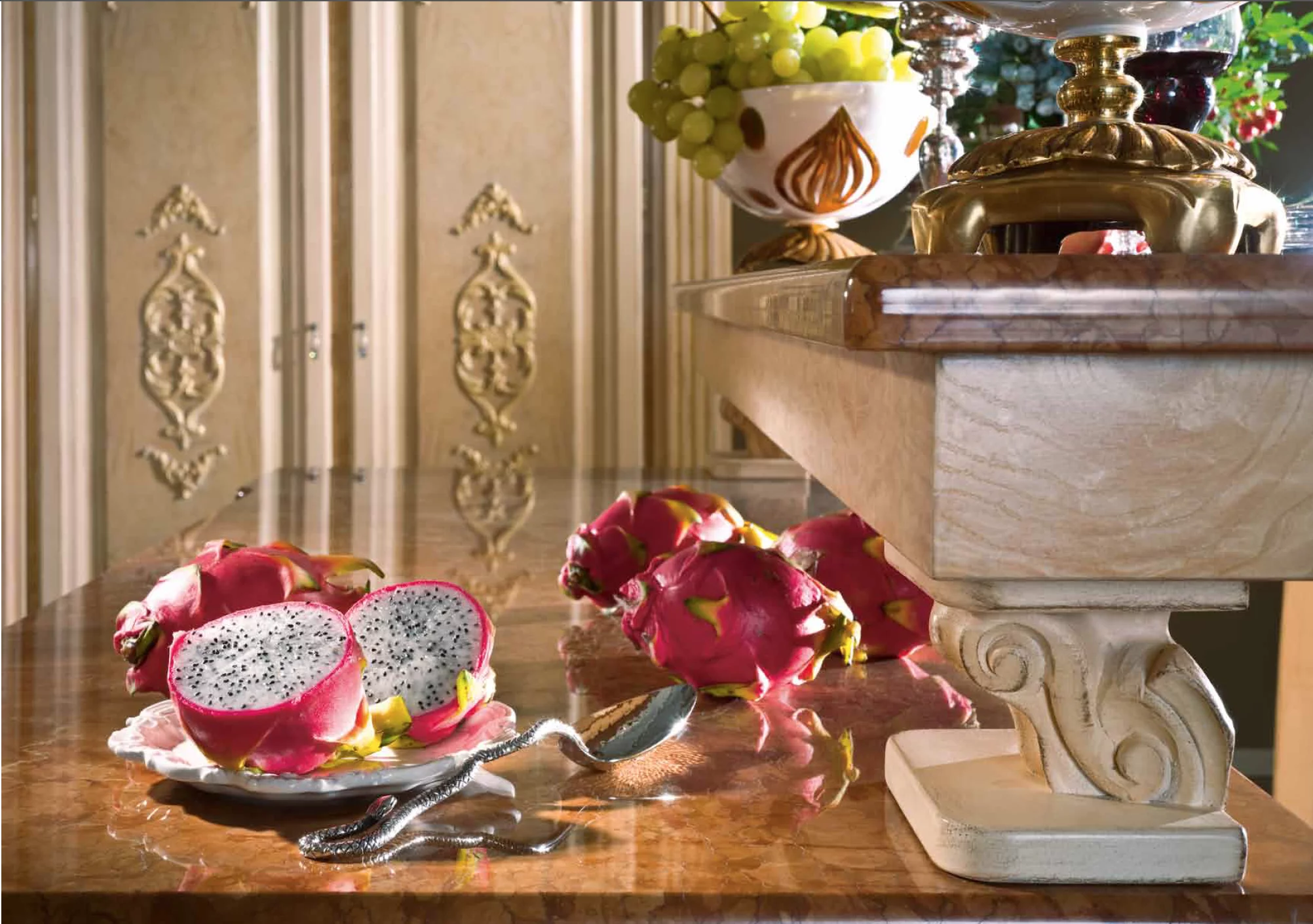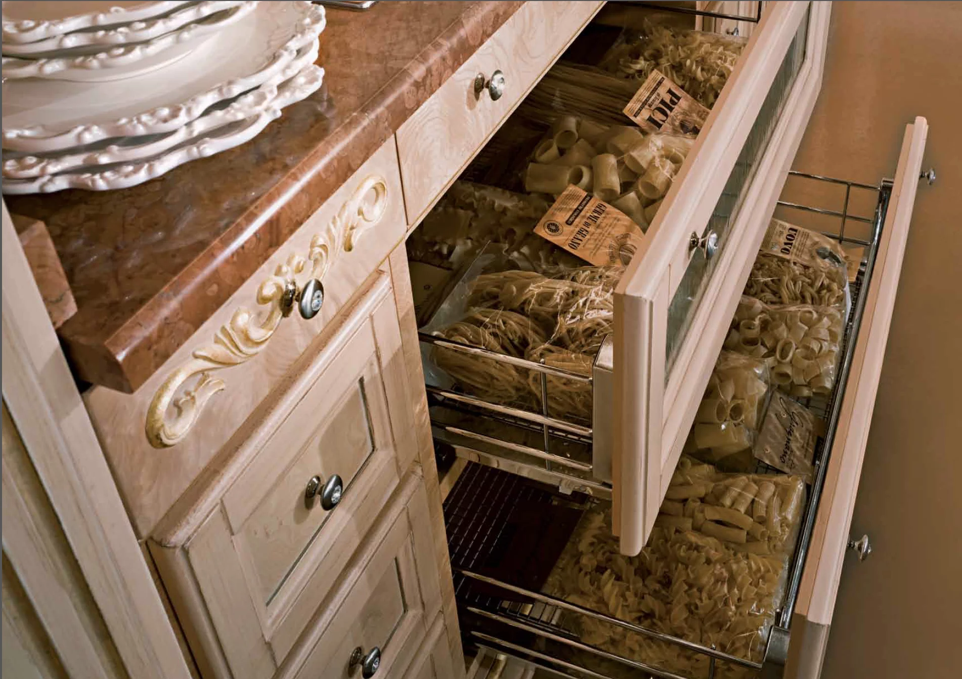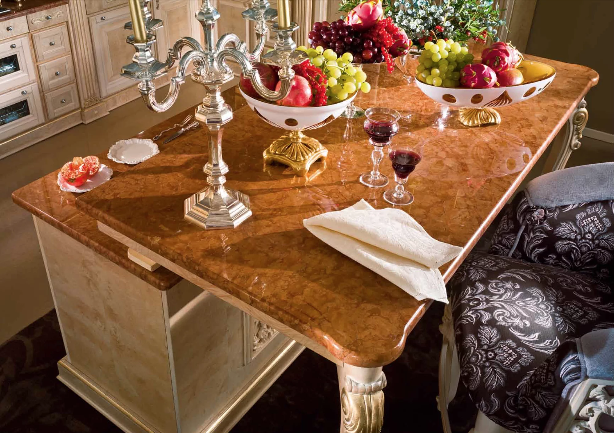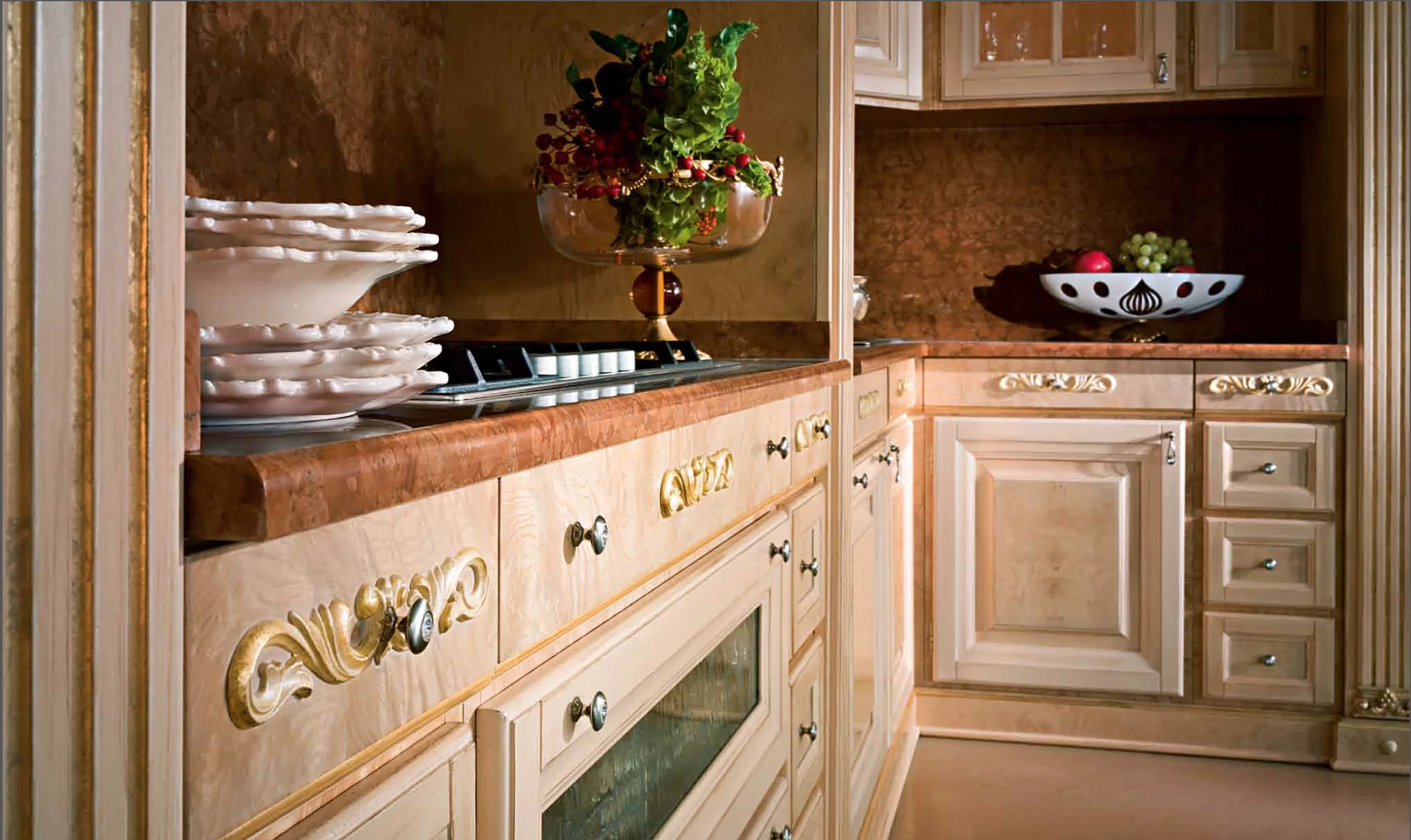 Необычайно красивая кухня Visions Du Gout Medoc от фабрики Socci Anchise — истинный эталон классического гарнитура, который приблизит любой интерьер к высокому дворцовому стилю. В этой уникальной модели заключено сочетание традиционных решений мебельного дела и современных модных тенденций. Кухня не только радует своим эстетичным внешним видом, но и очень удобна благодаря большому количеству шкафчиков и полок. Также впечатляет высокий, как барная стойка, обеденный стол и дополняющие его мягкие стулья. Кухня Visions Du Gout Medoc выполнена из ценных пород дерева, что обеспечивает надежность мебели, и предлагается в цветовом решении "crema" с оригинальной отделкой золотой палитры.