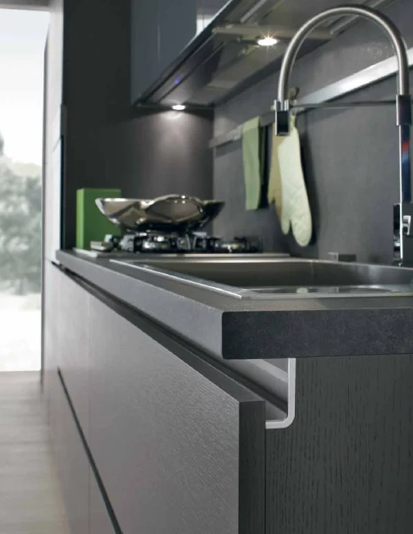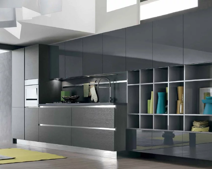 Кухня Allegra родилась из стремления создать такой интерьер, который будет максимально удобен для современных людей, живущих быстрой, насыщенной жизнью. Вся рабочая зона объединена в прямой остров, который визуально кажется монолитным. Навесные шкафы заменены открытыми полками для максимально быстрого доступа к их содержимому.