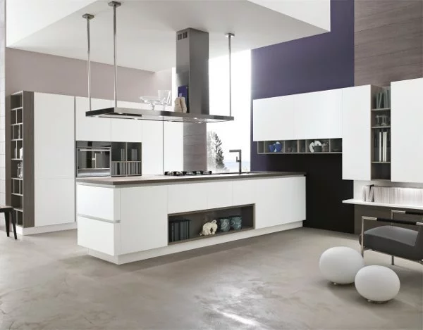 Кухня Allegra родилась из стремления создать такой интерьер, который будет максимально удобен для современных людей, живущих быстрой, насыщенной жизнью. Вся рабочая зона объединена в прямой остров, который визуально кажется монолитным. Навесные шкафы заменены открытыми полками для максимально быстрого доступа к их содержимому.