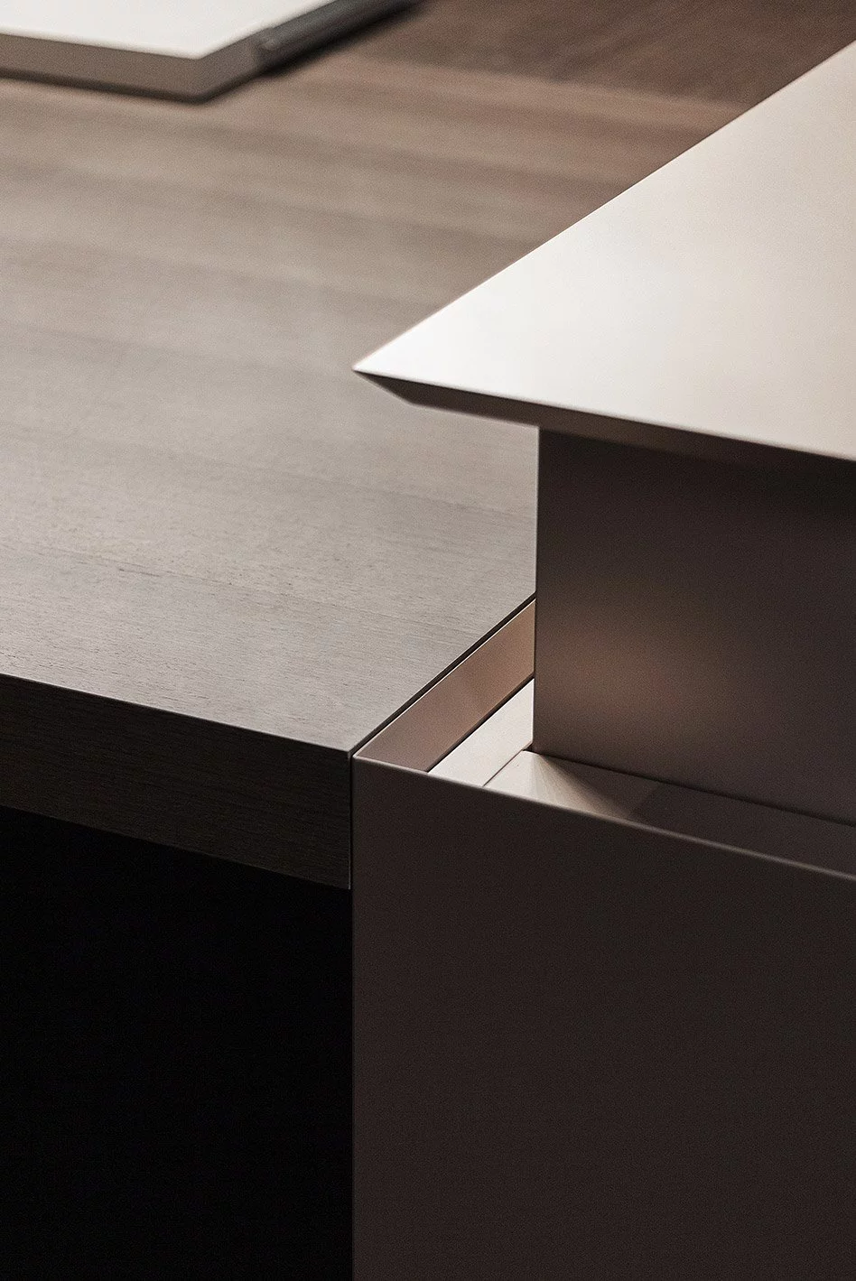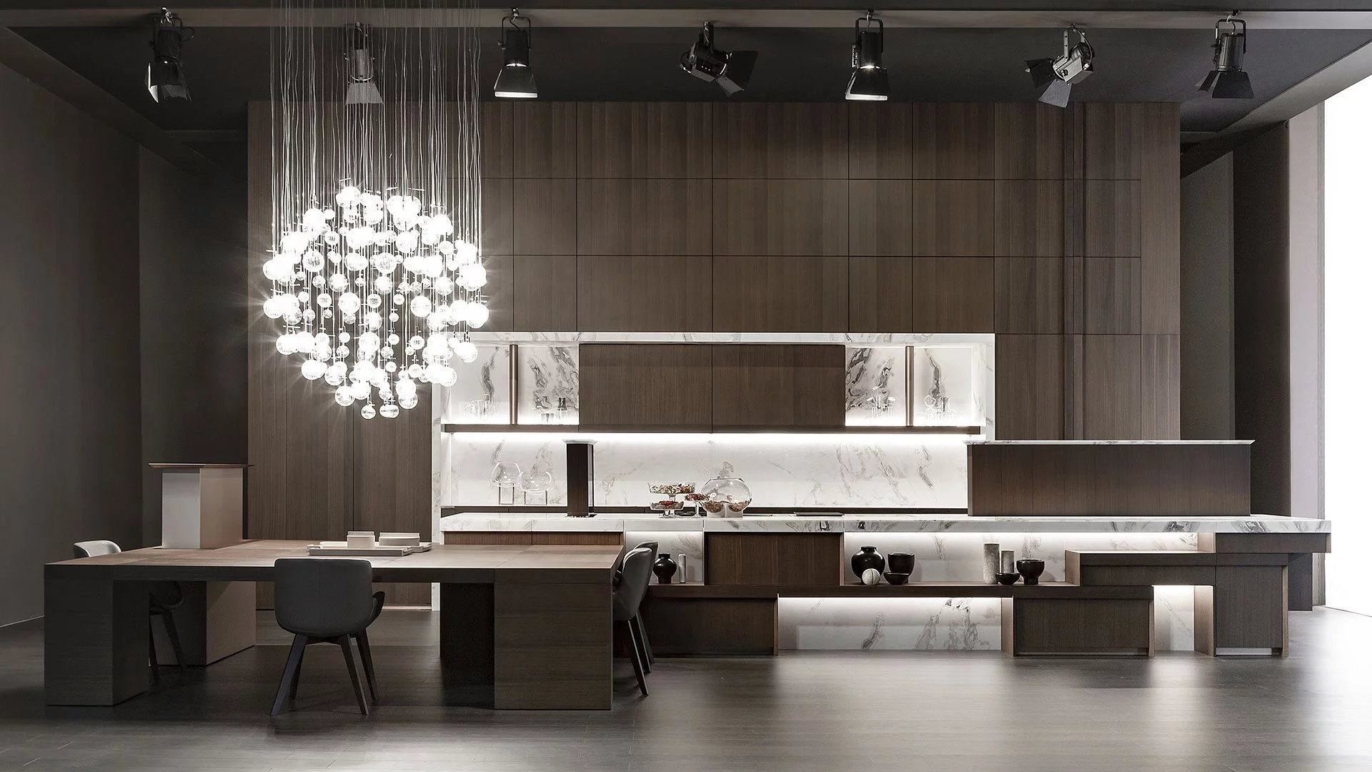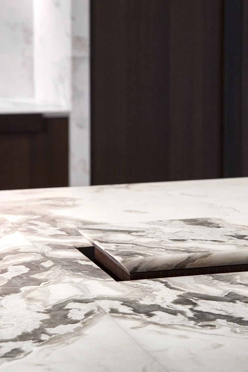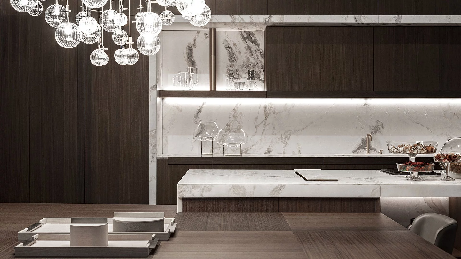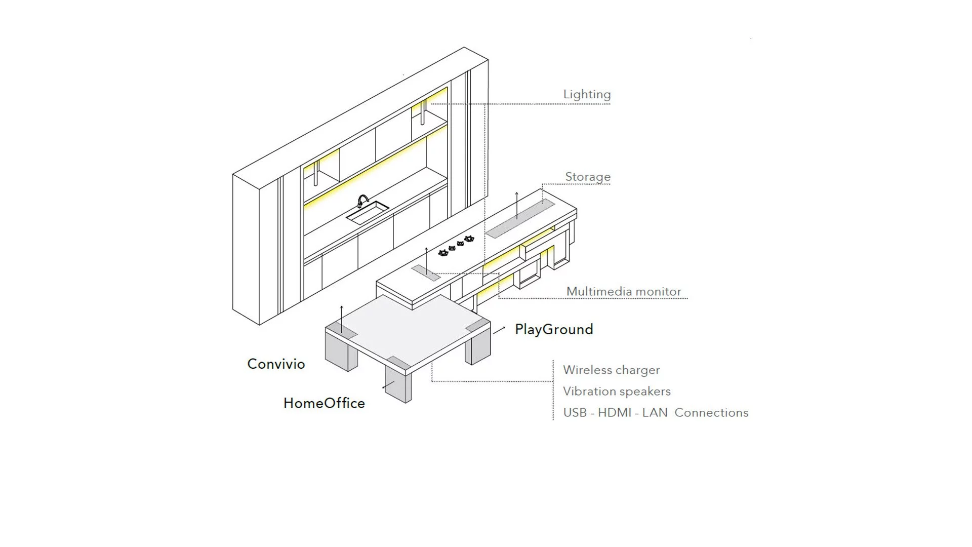 Встреча высокого ручного труда и скрытой домотики происходит на островке, который вмещает два скрытых объема. Один содержит монитор, который может поворачиваться лицом к столу или островку, а другой, рядом с кухонной плитой, предназначен для обширной библиотеки специй и кухонных принадлежностей. Стол оснащен функциональными элементами, становясь местом сбора и общения, работы, игр и развлечений. Оборудование HomeOffice позволяет хранить портативный компьютер, мышь, клавиатуру, блокноты, ручки, а также оборудовано розетками и USB-портами; контейнер PlayGround предназначен для хранения консолей, планшетов, рисовальных принадлежностей; механизм Convivio содержит аксессуары для коктейлей, бокалы и бутылки.