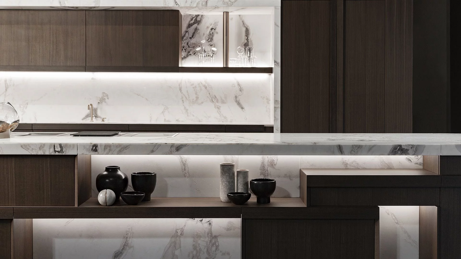 Гармония материальных деталей - вот ключевой аспект проектного подхода Avignon, сфокусированного на деконструкции. Он создает гармоничное движение объемов и углублений, способствуя сочетанию материалов. Два основных материала в Avignon: волнистое дерево эвкалипта и мрамор Dover White. Эвкалипт с матовой отделкой, полученный из сертифицированных FSC пород деревьев, выражает мелкие волны регулярных и параллельных вен при падении света на поверхности. Мрамор Dover White с плавными формами в оттенках серого и молочно-белого. Стилистической изюминкой проекта является цифра 7,5, выражающая важные толщины в сантиметрах столешницы, столов и спинок, а также крупных ручек, размещенных горизонтально или вертикально на дверцах и фасадах.