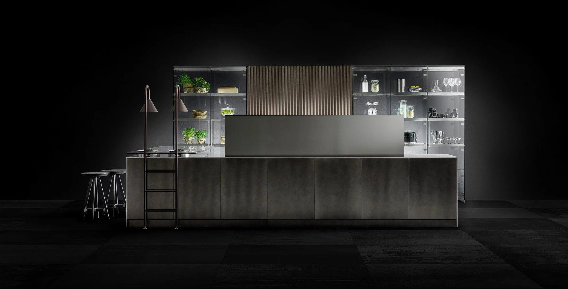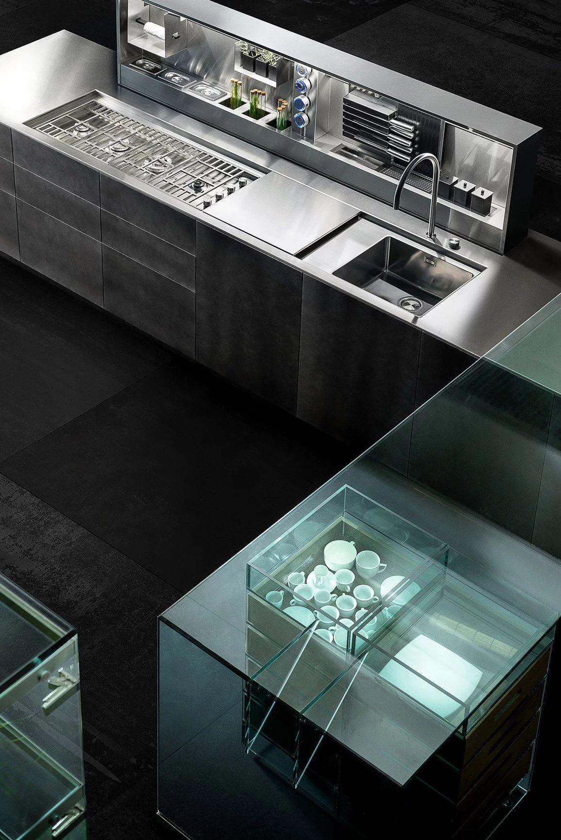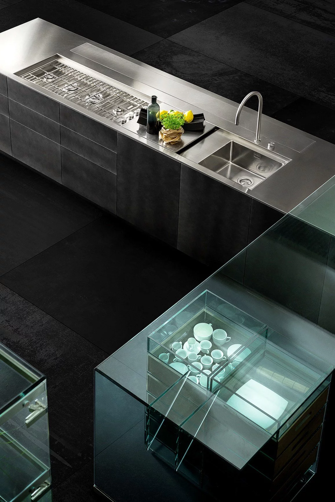 Рабочая зона острова имеет линейную горизонтальную форму куба. Раковина и плита скрыты под столешницей кухни D90/12-D90/TP , но в то же время находятся всегда «под рукой». Стеклянный столик соединен с рабочим островом под углом 90⁰, создавая удобное пространство для завтрака или быстрого перекуса.