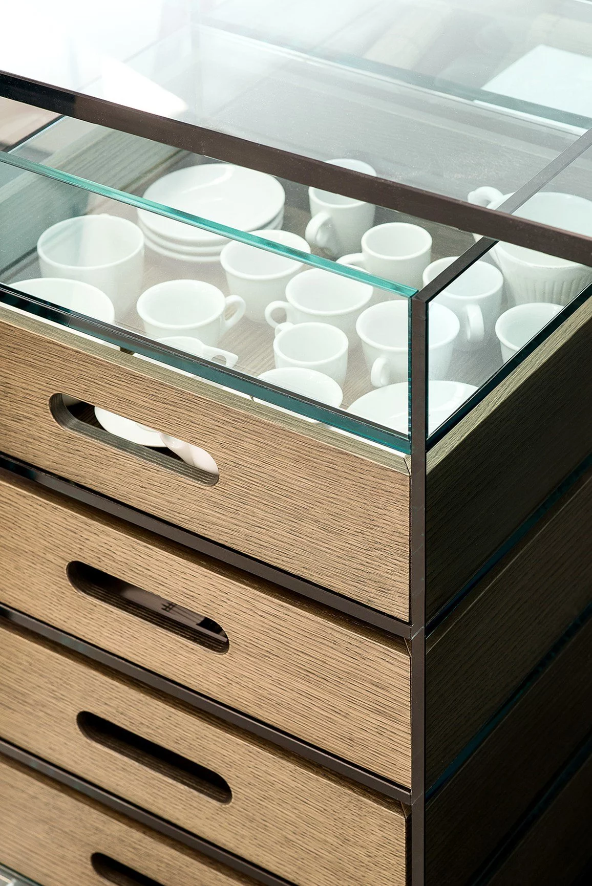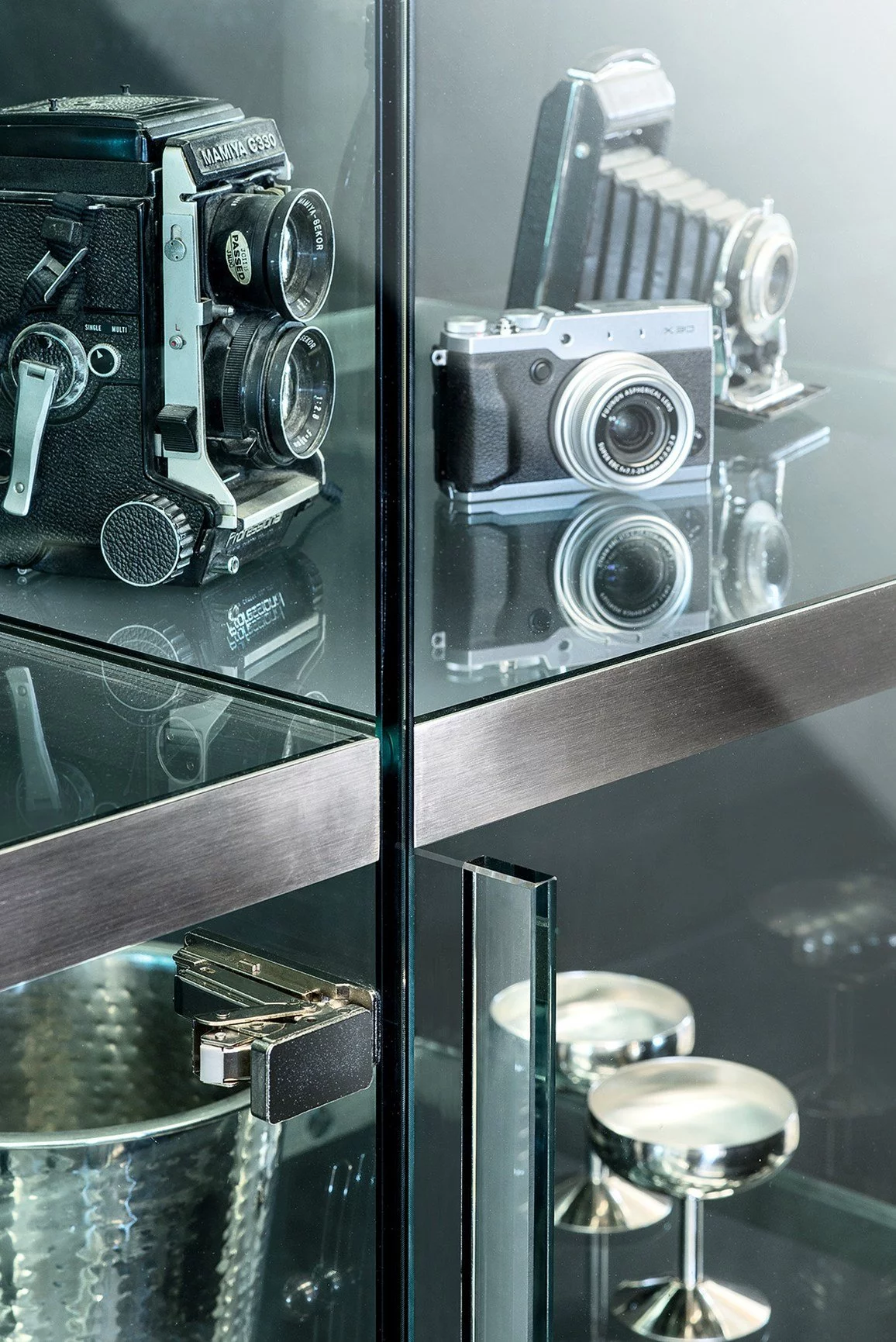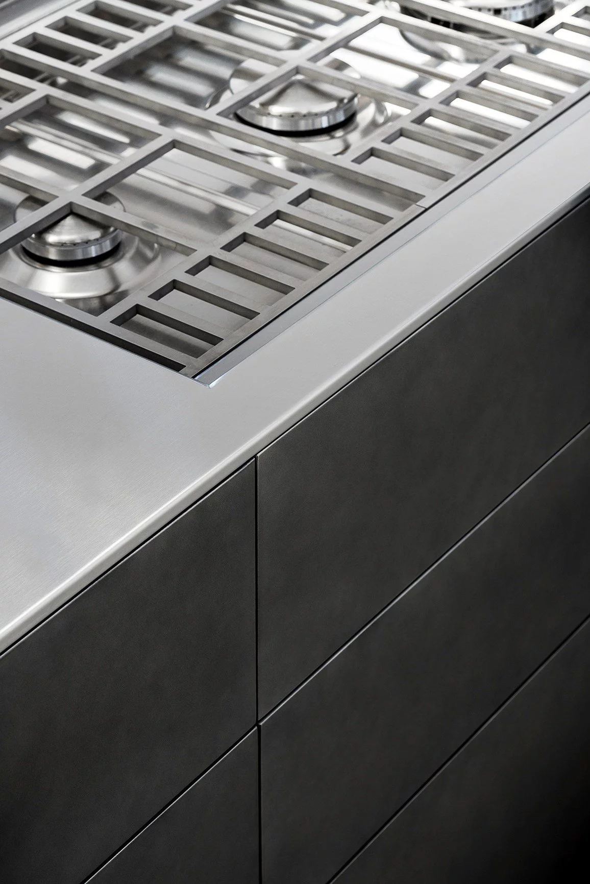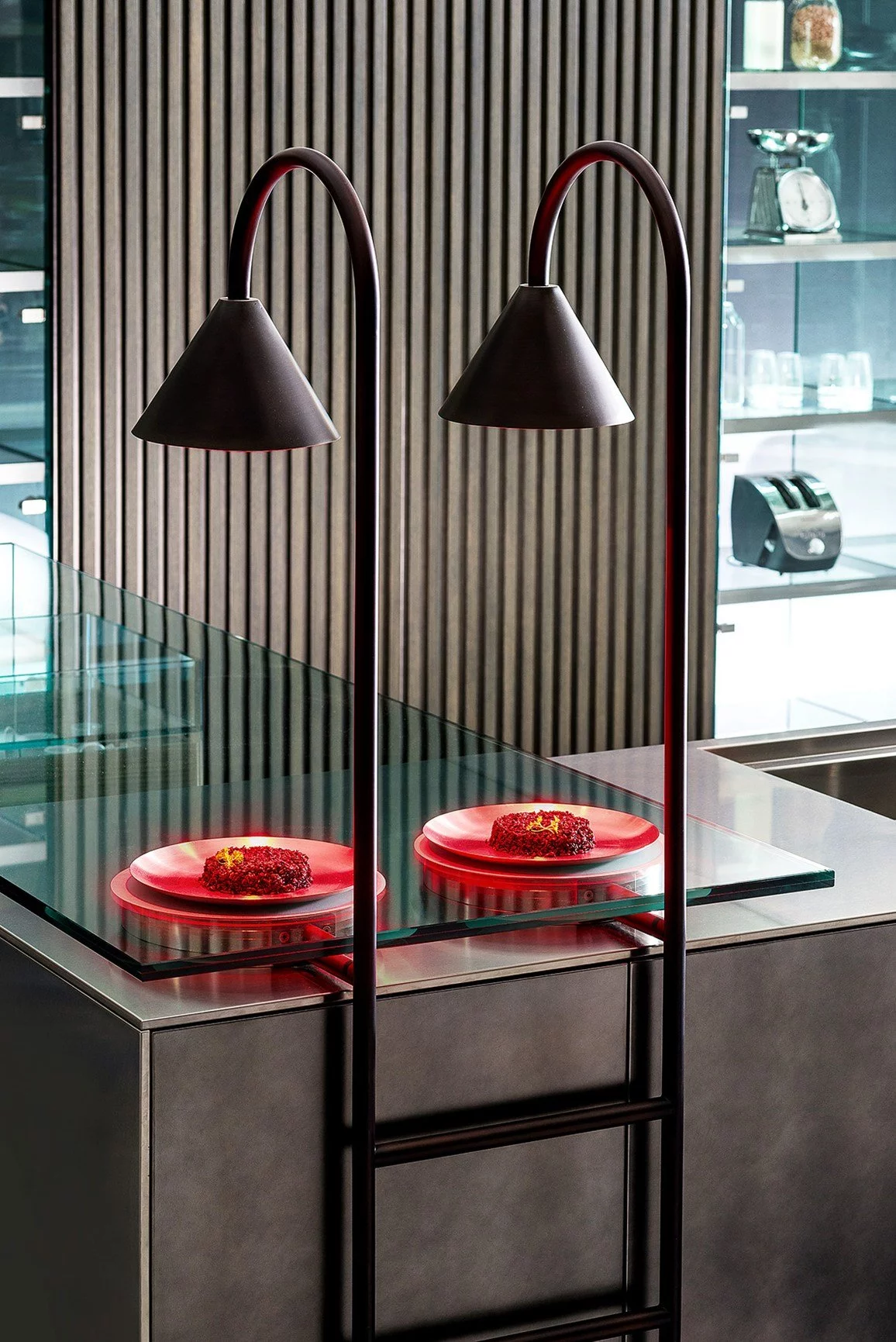 Рабочая зона острова имеет линейную горизонтальную форму куба. Раковина и плита скрыты под столешницей кухни D90/12-D90/TP , но в то же время находятся всегда «под рукой». Стеклянный столик соединен с рабочим островом под углом 90⁰, создавая удобное пространство для завтрака или быстрого перекуса.