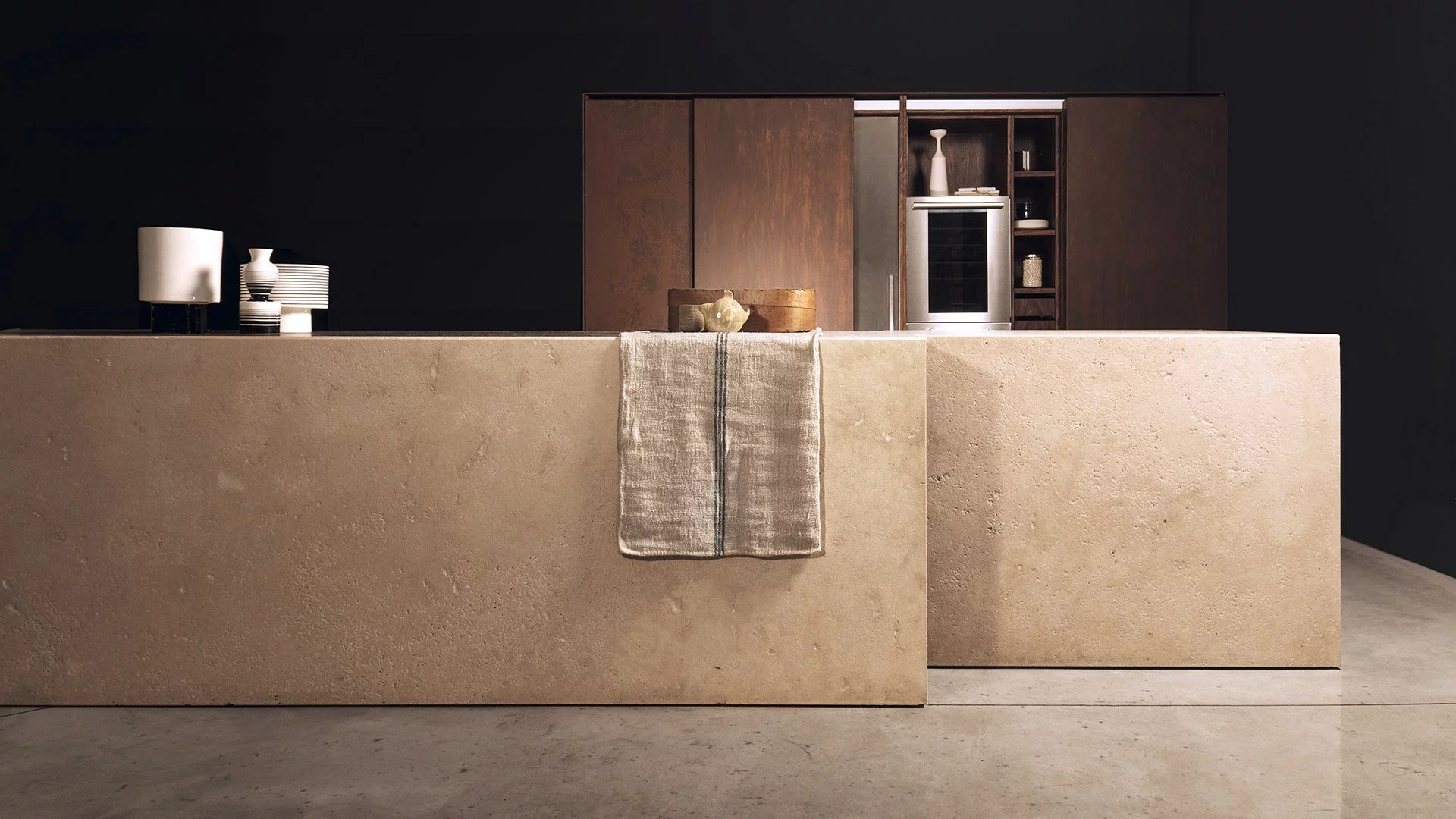 Кухня Petra подчёркивает стремление фабрики ТМ Italia оставаться первыми в сфере инновационных технологий мебельной индустрии. Модель выполнена из прочного натурального камня травертина, стали, многослойной натуральной древесины, а также кориана и стекла.