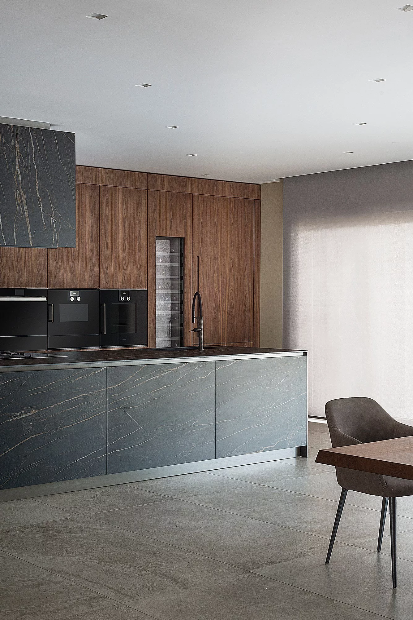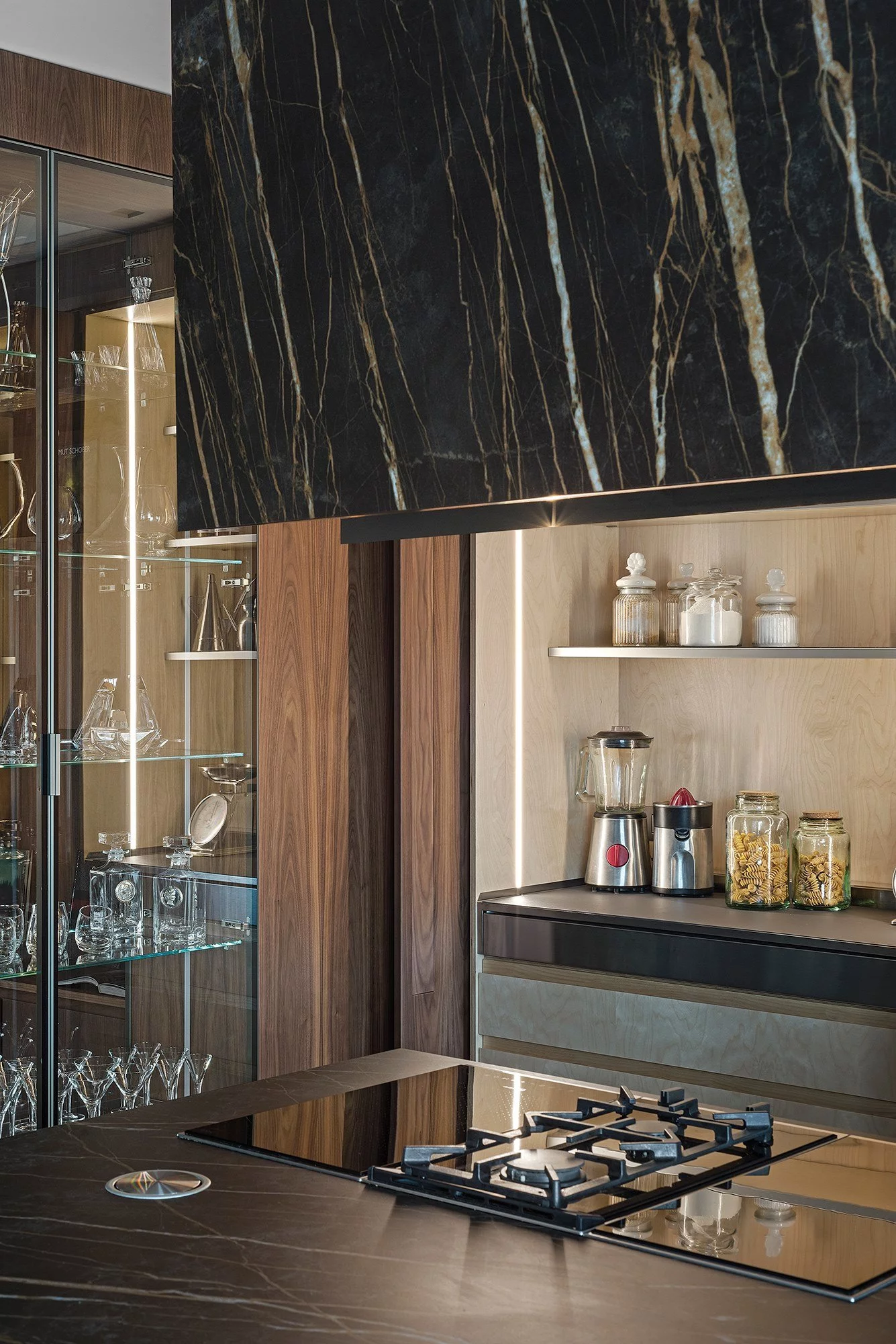 В остров внедрена мойка, также на нём установлена варочная поверхность, над которой находится вытяжка. Модуль выполнен в отделке под тёмный мрамор со светлыми прожилками. Фасады глухие со скрытыми ручками.