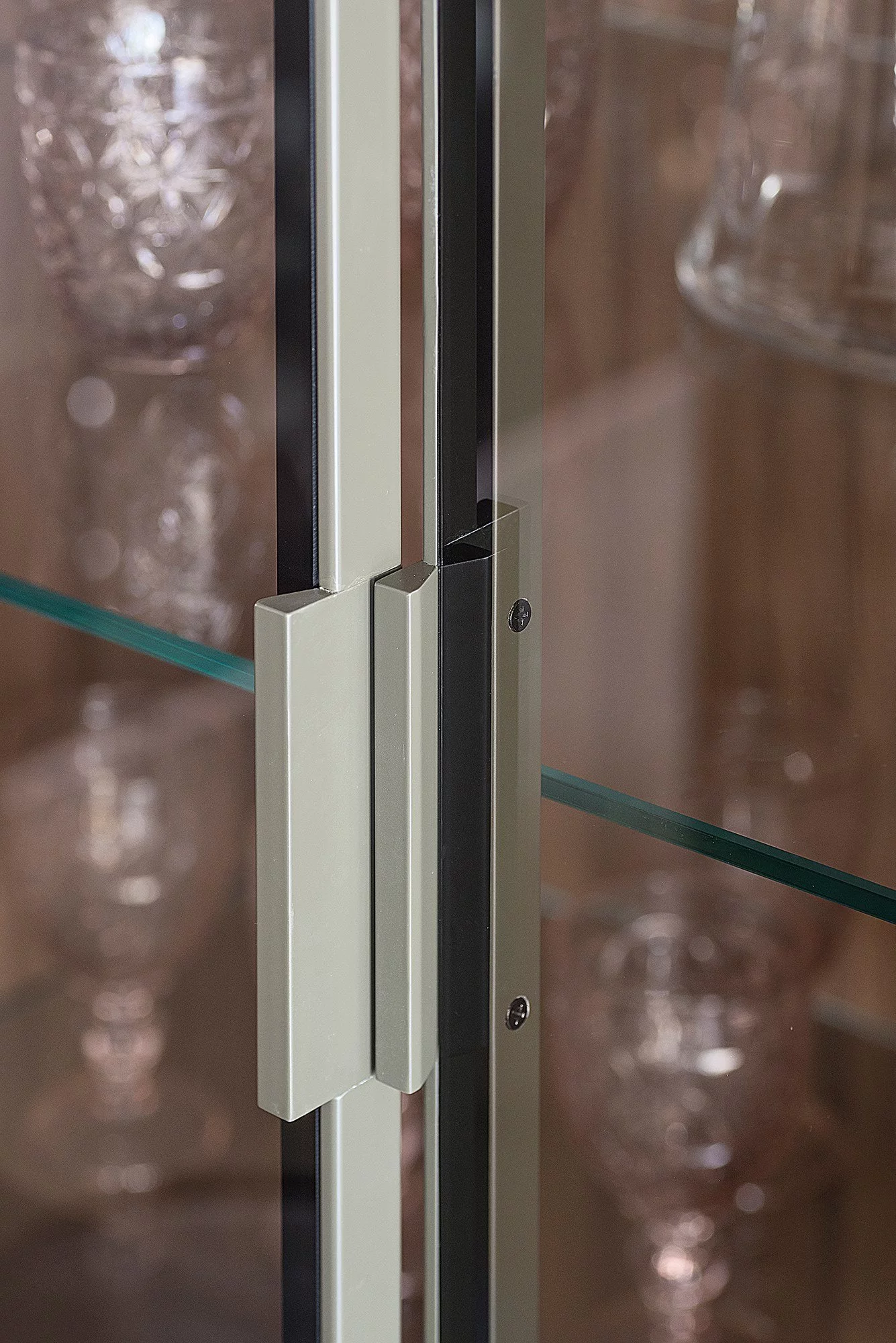 Кухня T45/D90 состоит из двух частей: пристеновой композиции и отдельно стоящего острова. Линейная композиция, занимающая всю высоту стены, характеризуется глухими фасадами из массива. Между шкафами находится стеклянная витрина, предназначенная для хранения посуды. Рядом с ней можно интегрировать кухонную бытовую технику. Кроме этого, здесь располагается винный шкаф.