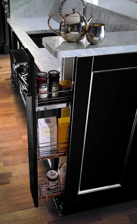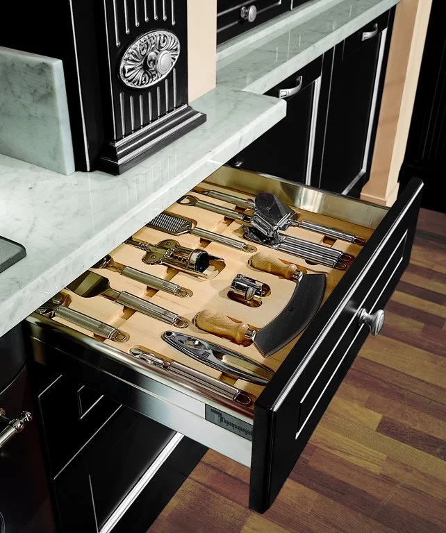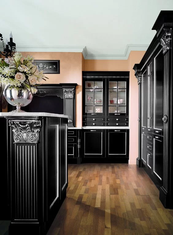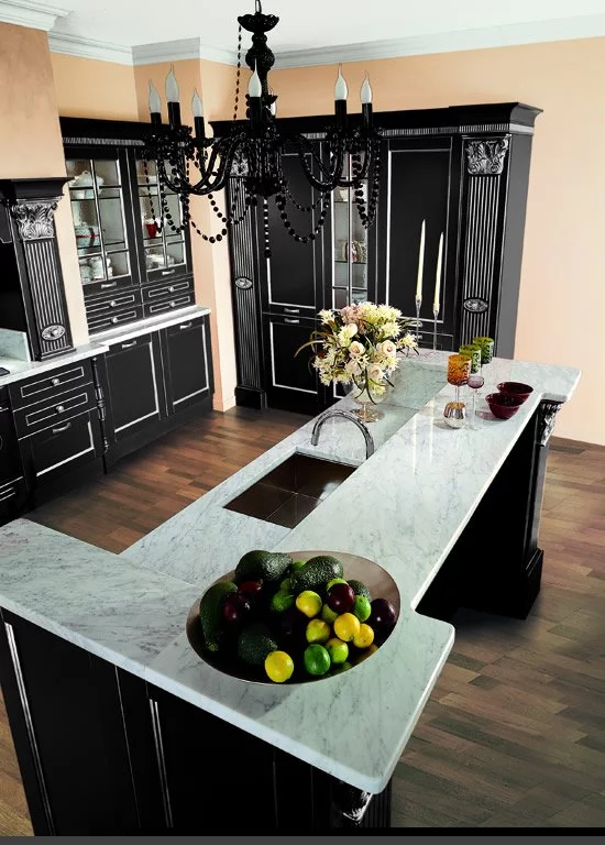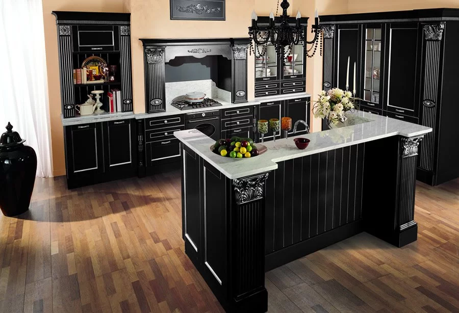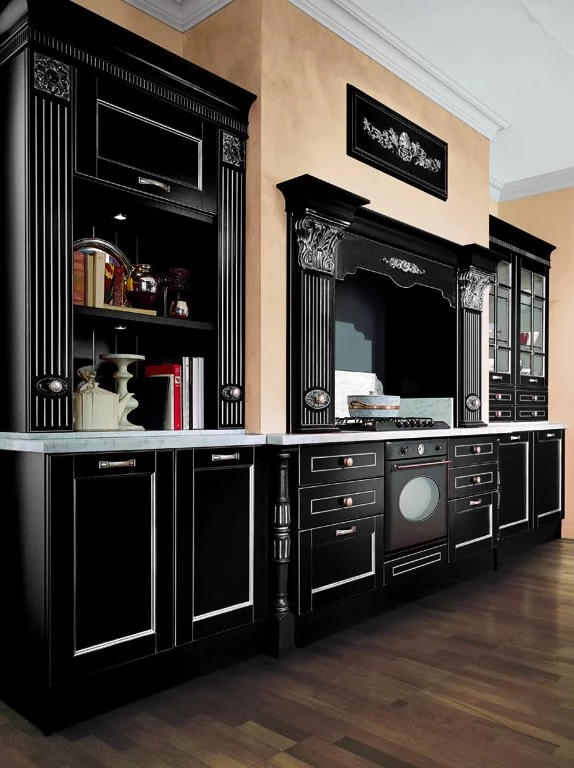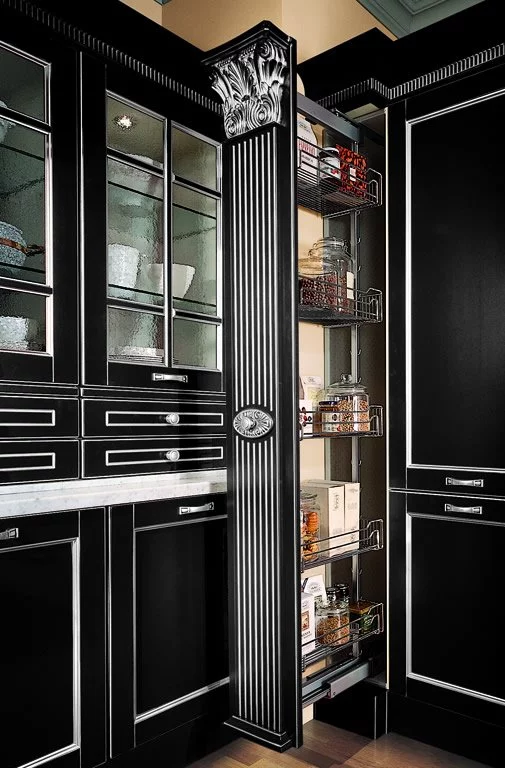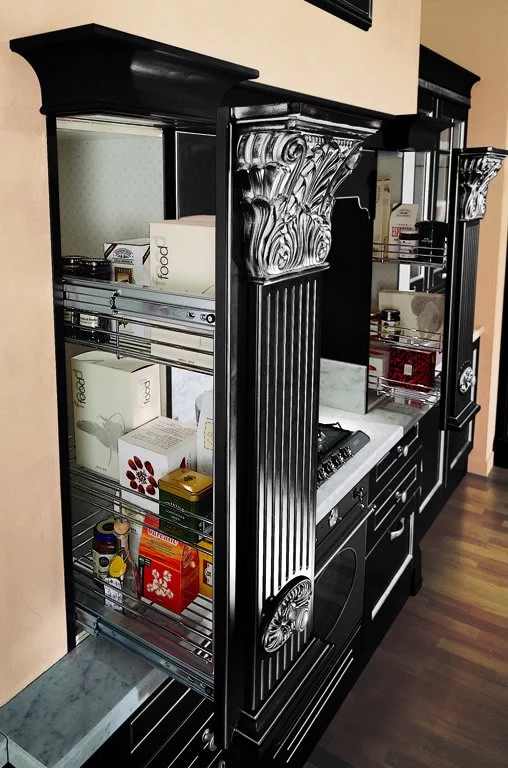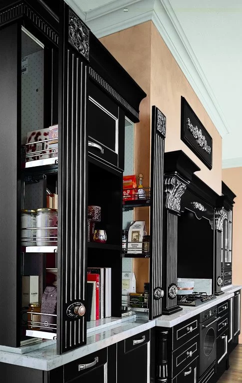 Утончённая классическая кухня Solaria Laccata от мебельной фабрики Италии Tomassi Cucine создана лучшими дизайнерами в стиле ампир. Для её изготовления был выбран массив ореха элитных пород, цвет которого великолепно сочетается с инкрустацией на фасаде. Особого восхищения заслуживают декоративные колонны, для изготовления которых применялся ручной труд дизайнеров Tomassi Cucine. Каркас и внутренние полки кухни Solaria Laccata — ДСП высокого качества.