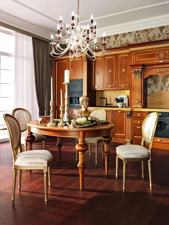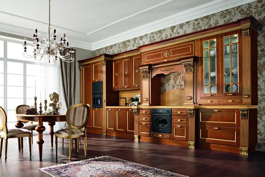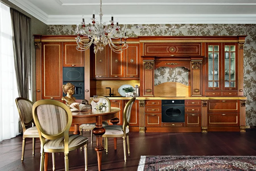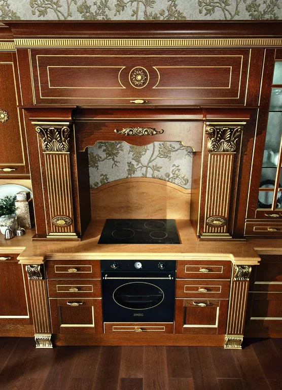 Классическая кухня Solaria Rovere итальянской фабрики Tomassi Cucine выполнена в лучших традициях стиля ампир. Материалом для великолепной модели послужил массив дуба дорогих пород, который дарит гарнитуру от Tomassi Cucine поистине роскошный вид. Изюминкой кухни являются декоративные колонны, которые вырезаны вручную из дерева. Фасады для данного проекта предлагаются в двух вариантах: застеклённые или глухие с отделкой шпоном. Для удобства рабочая поверхность кухни Solaria Rovere выполнена из искусственного камня.
