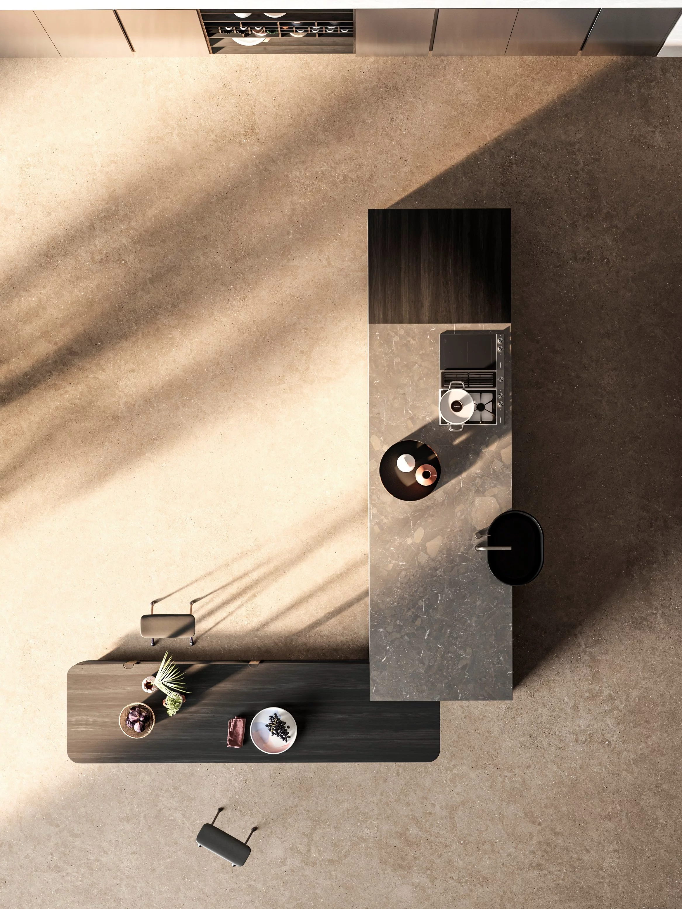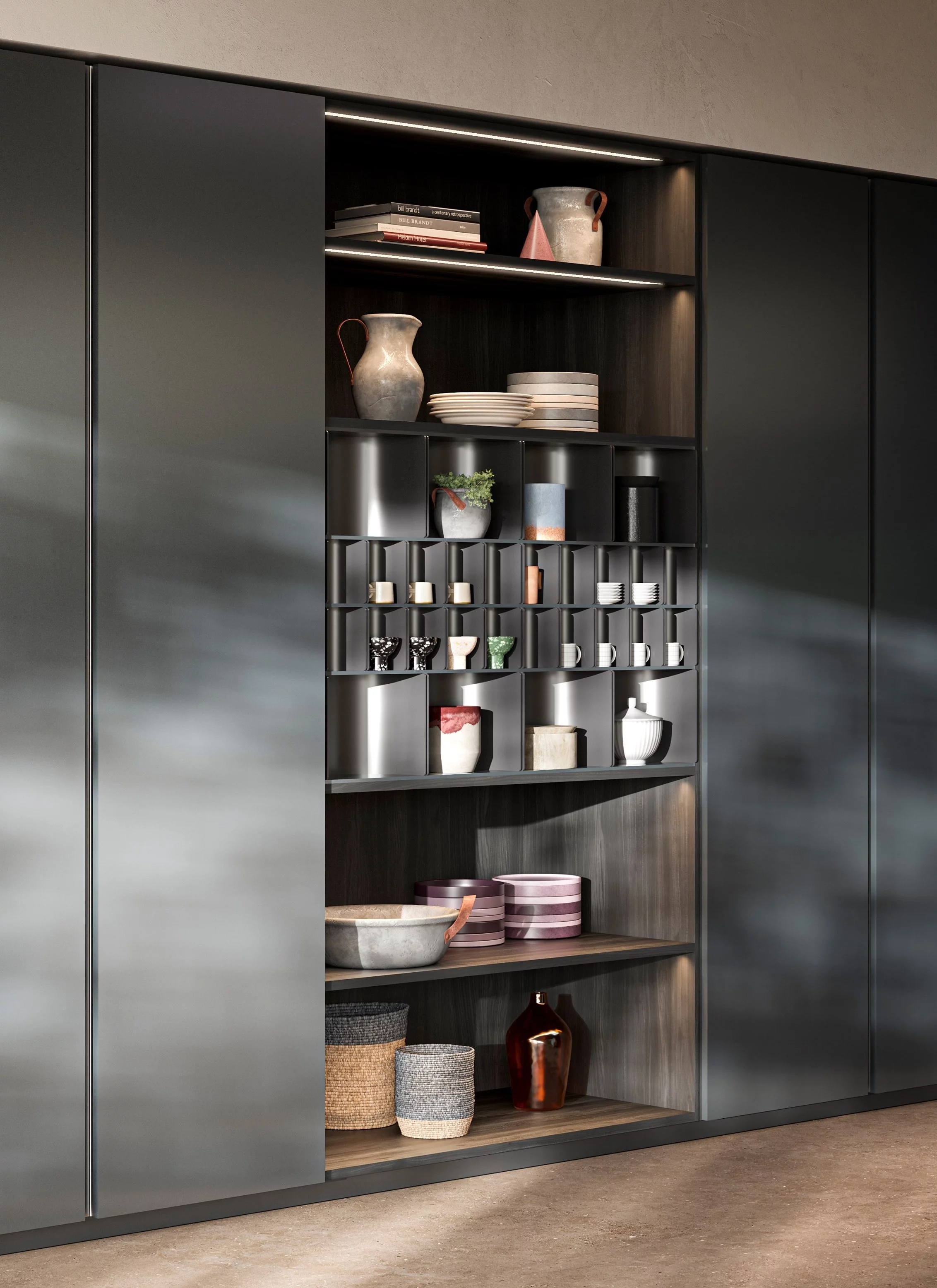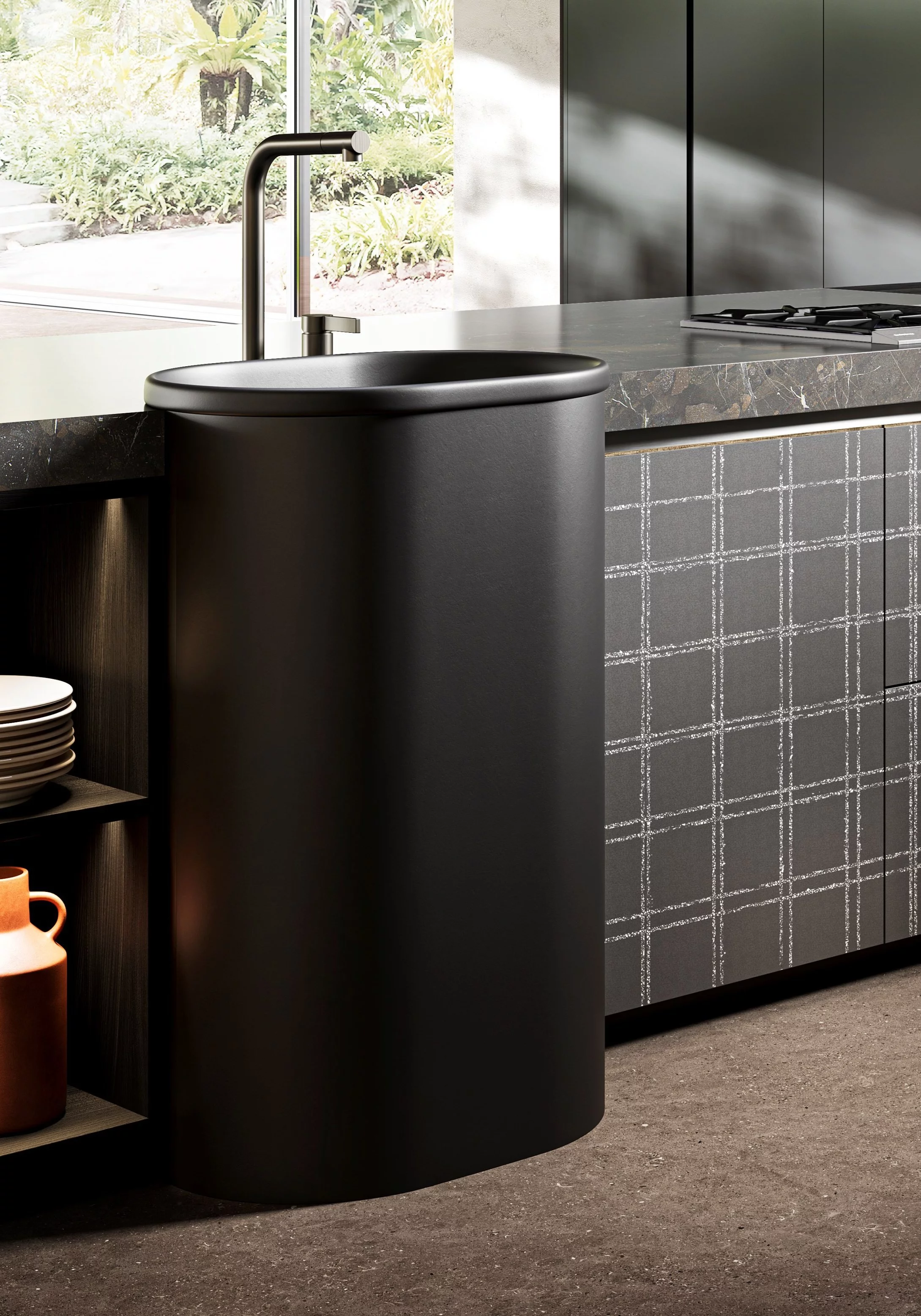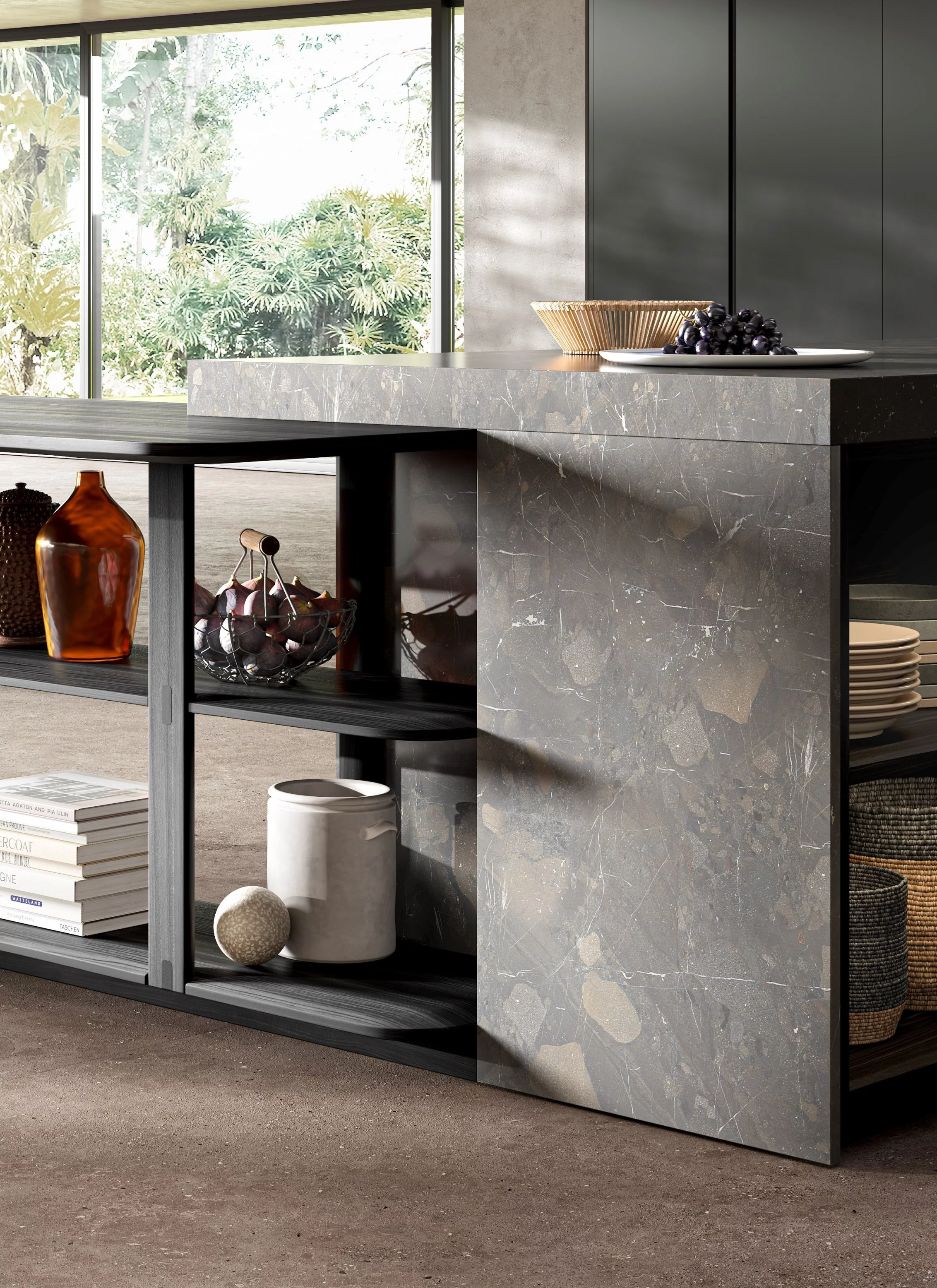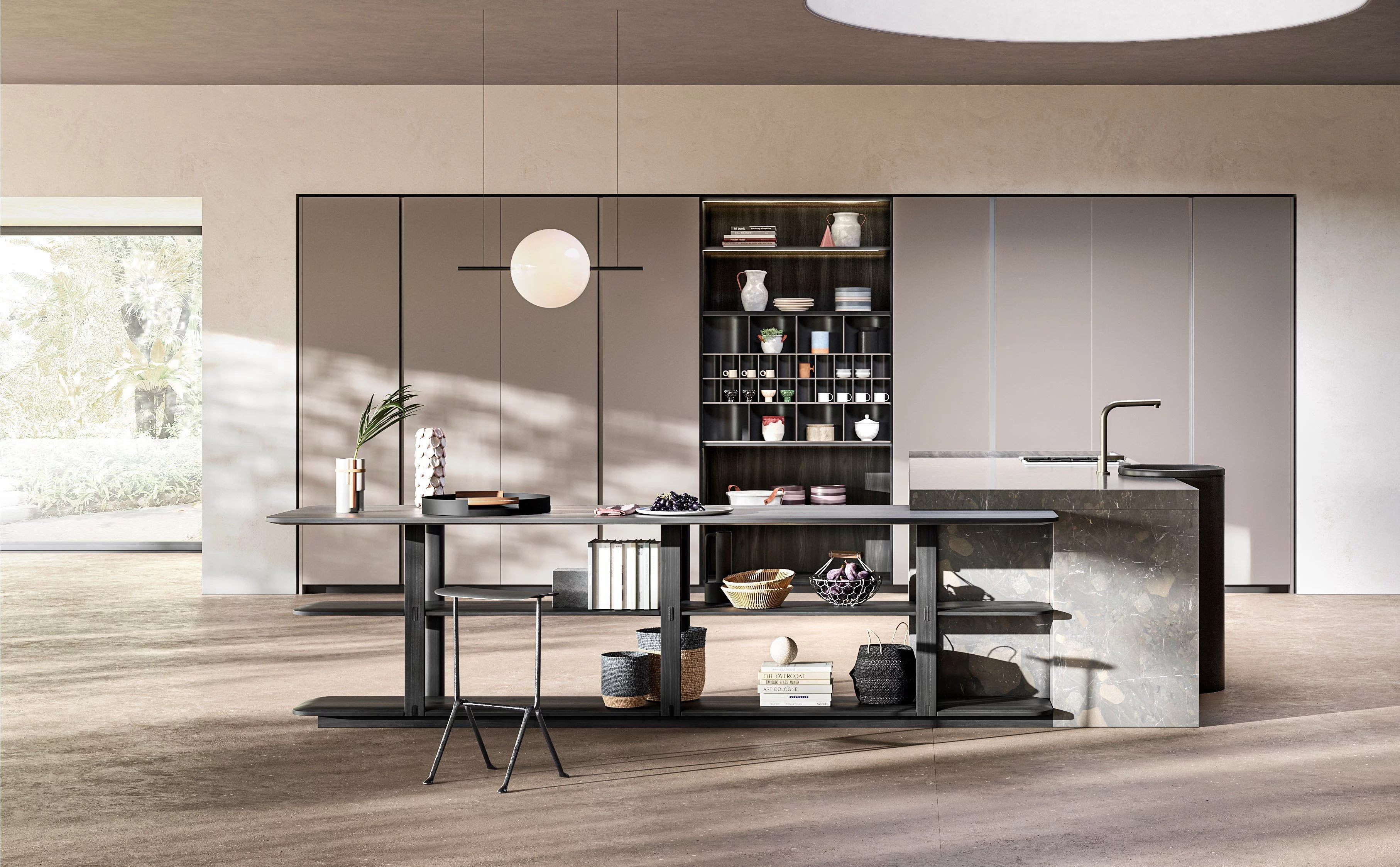 Простота, лаконичность и функциональность - это новая кухня Pinea. Массивный каменный остров с уникальной возвышающейся раковиной круглой формы в сочетании с легкой открытой композицией позволяют идеально сочетать в единое целое 2 противоположности. Монолитный ряд колонн со скрытой ручкой Gola разделяет открытая секция с закругленными нишами под аксессуары и открытыми полками. Каркасы напольных баз и колонн полностью шпонированны. Благодатям задвижным дверям реинтранте бытовую технику получилось скрыть от посторонних глаз. Заказчику предлагает огромный выбор отделок: матовая или глянцевая покраска, натуральные шпоны и камни. Срок производства: 60-90 календарных дней. 100% Made in Italy.