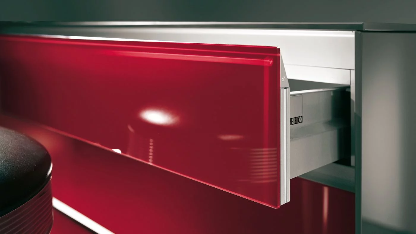 Здесь применен удобный механизм выдвижных ящиков. Холодильник и другая бытовая техника спрятаны за раздвижной стенкой.