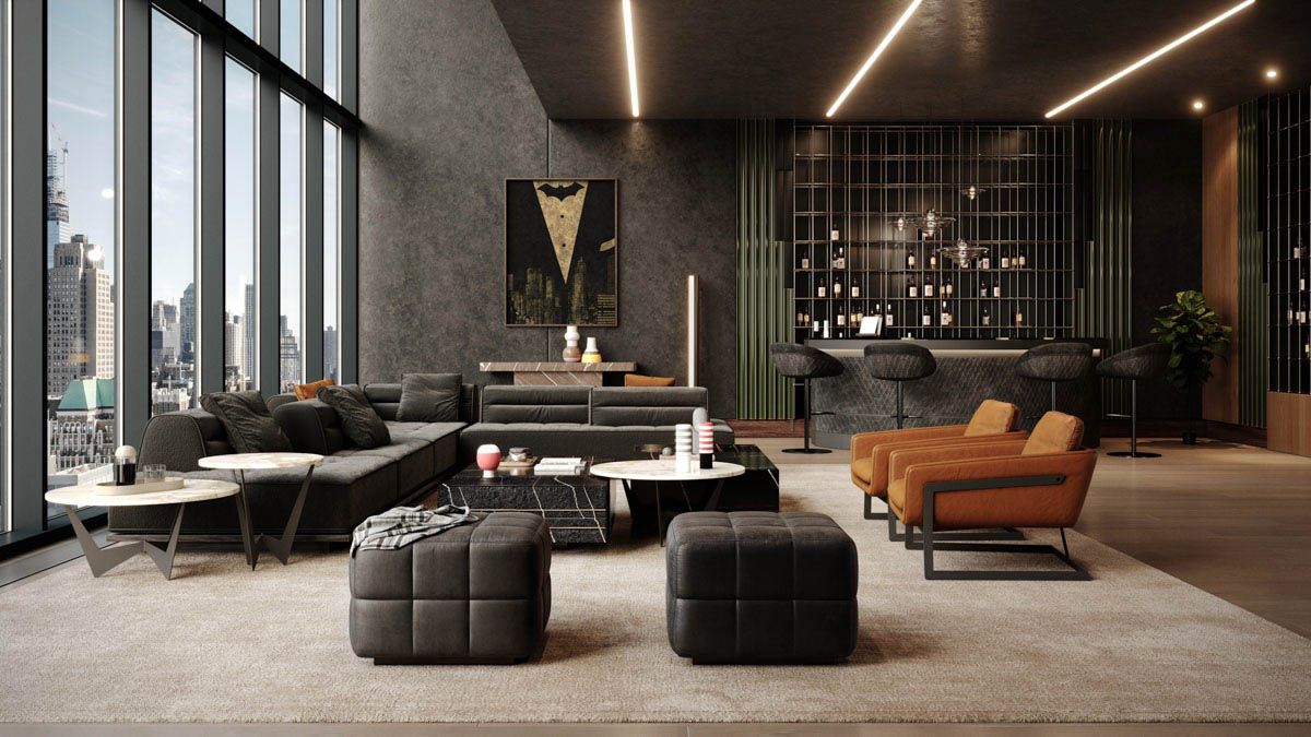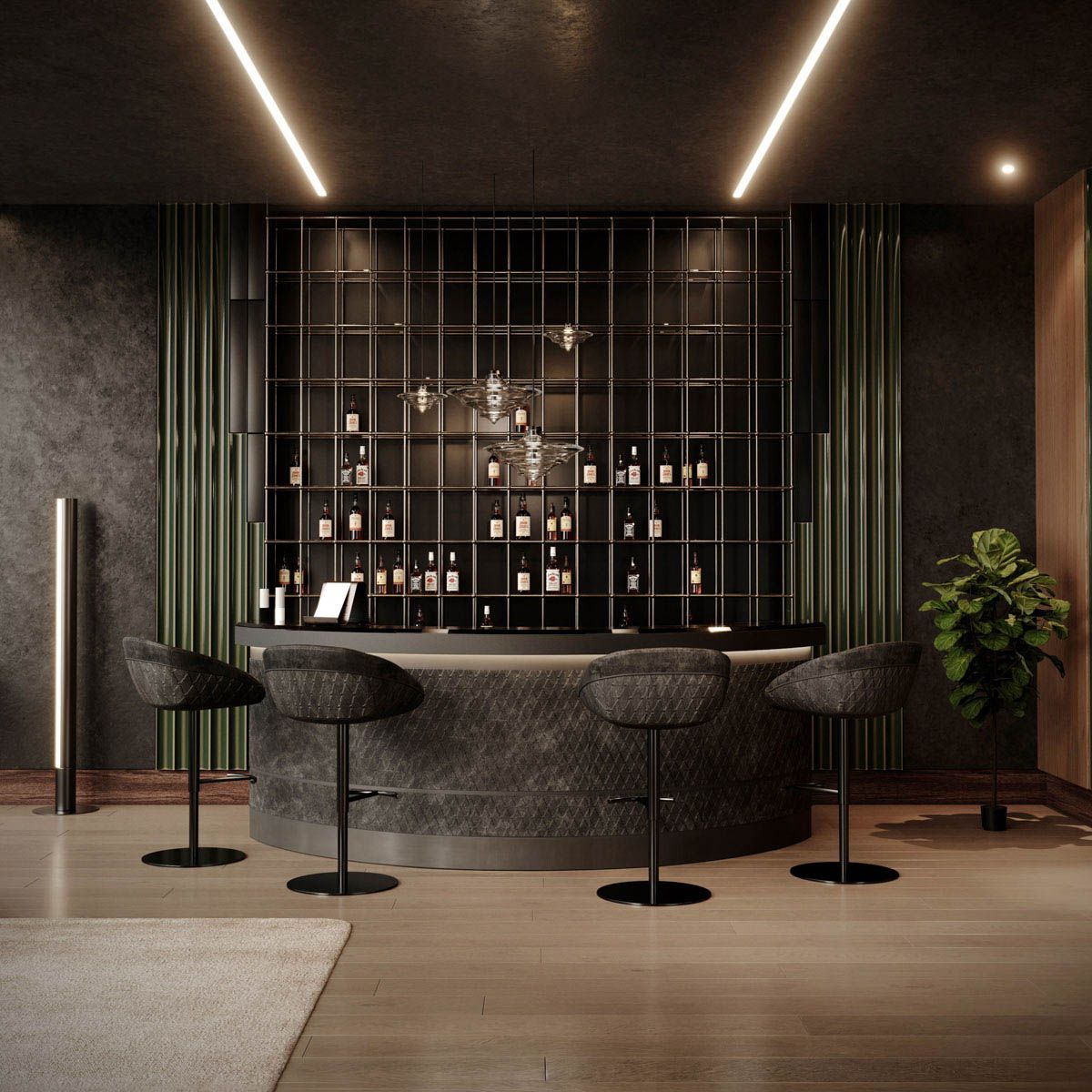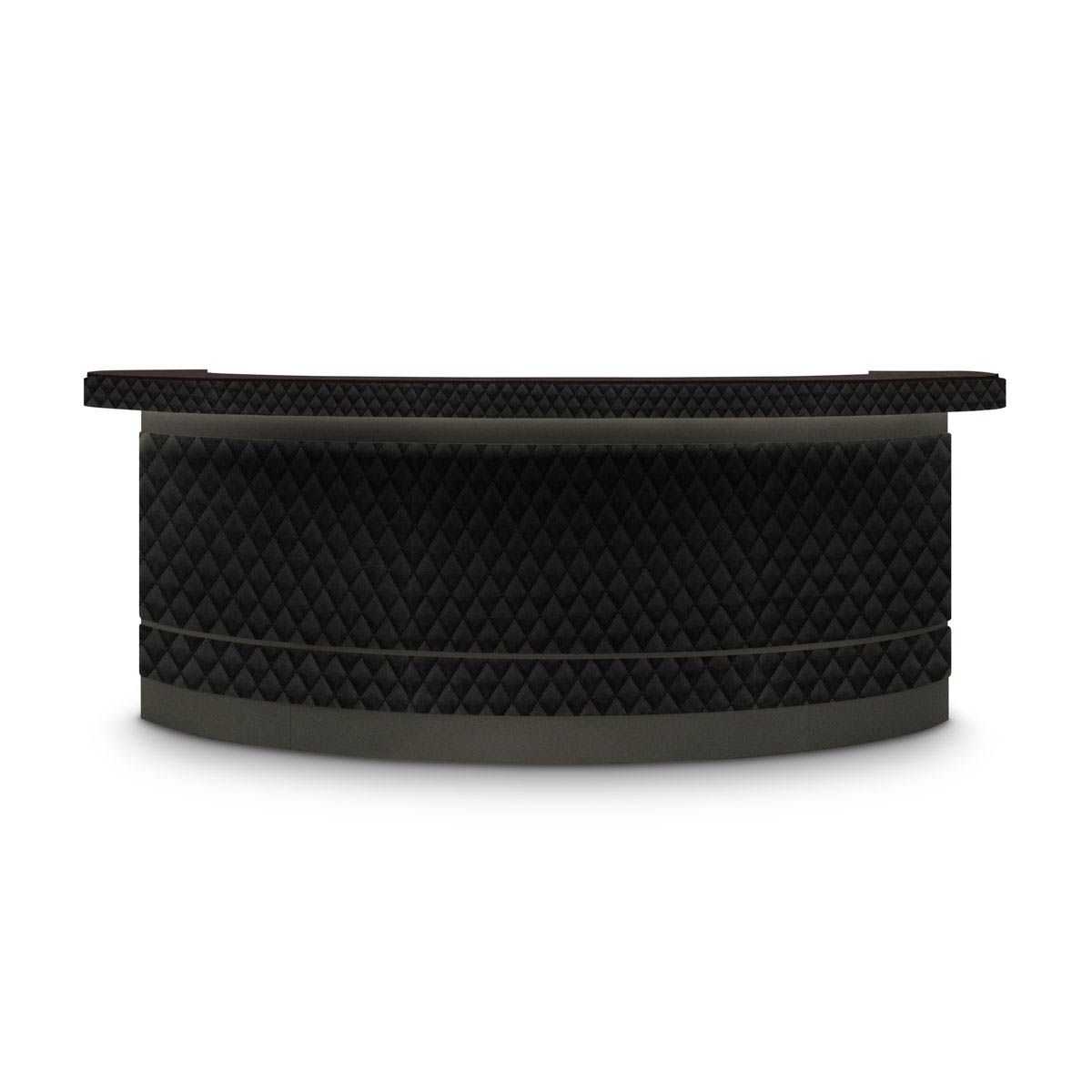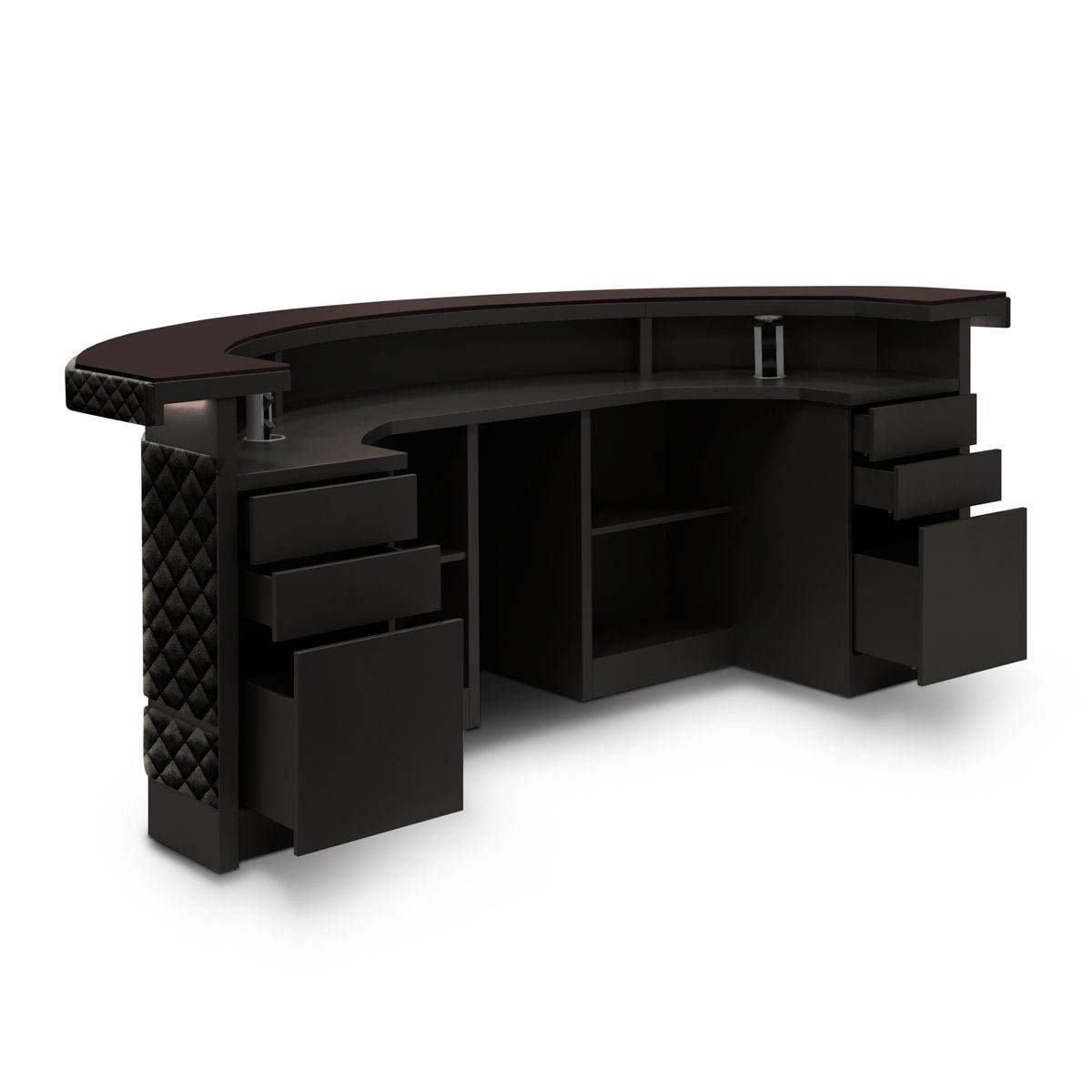 Столешница из зеркального материала оттенка Fumé, фронтальная панель отделана кожей Kobe цвета Black, конструкция, рама столешницы, основание и вставки — в лакированной отделке Steel Delabré, предусмотрена LED-подсветка под столешницей.