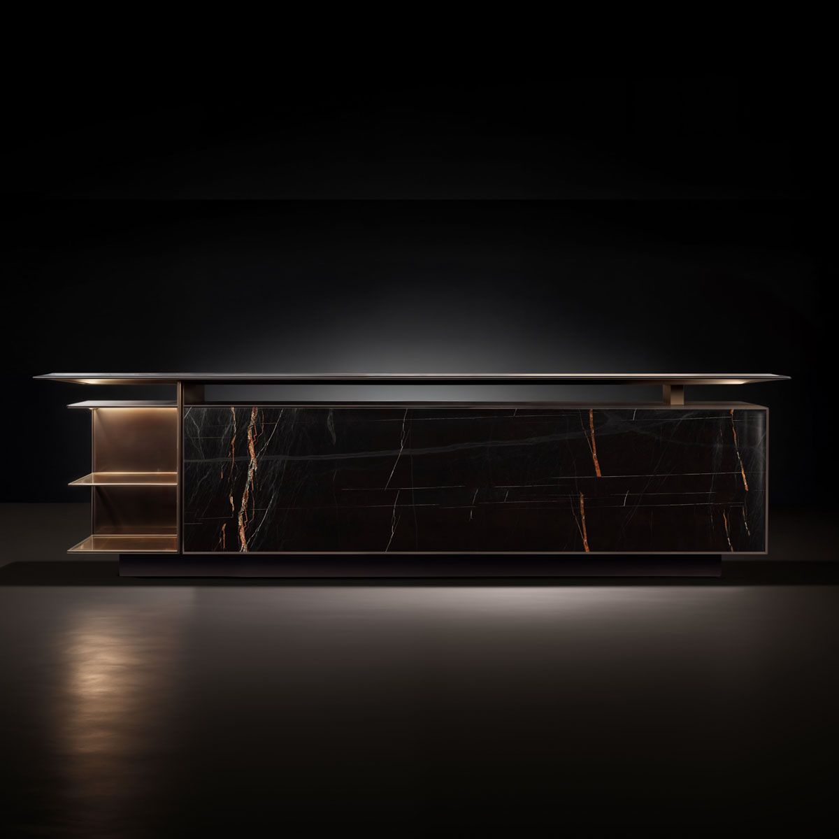 Столешница, верхние панели выдвижных ящиков и основание выполнены в лакированной отделке оттенка Smoke 7500. Нижняя часть столешницы, внутренняя конструкция и полки оформлены в лакированном цвете Brass. Фасадная панель изготовлена из керамики с текстурой мрамора Sahara Noir.