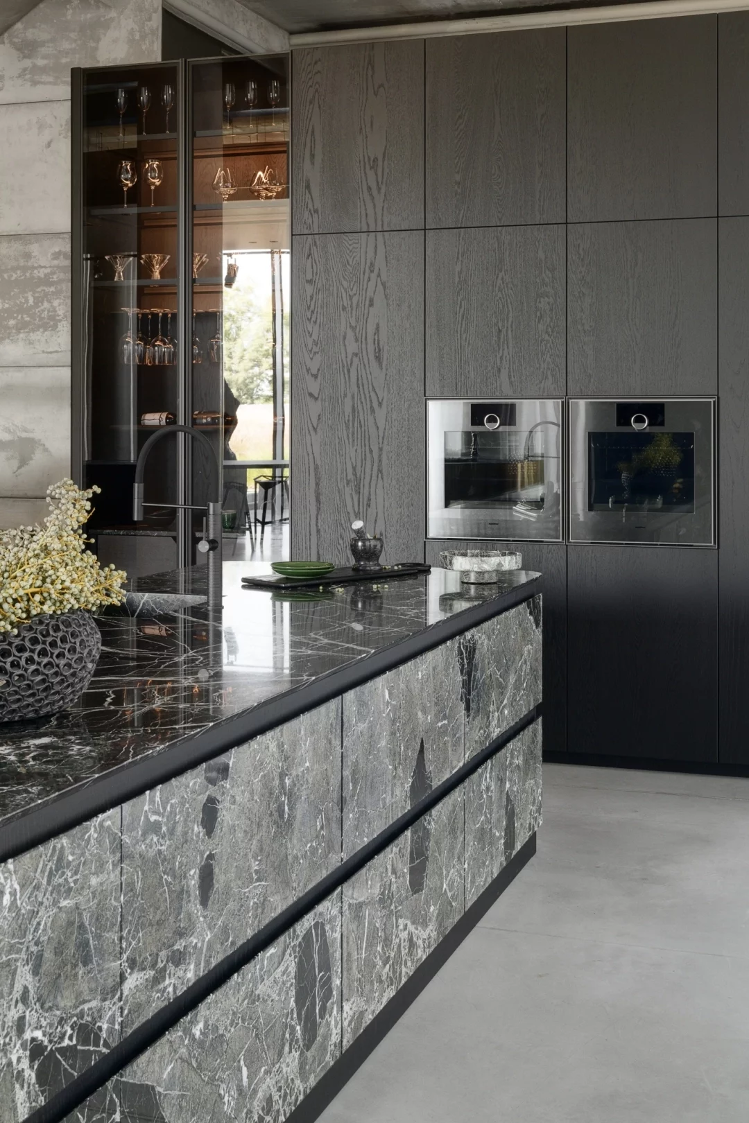 Остров - главное украшение кухни. Его фасады выполнены из мрамора, установленного на основу, покрытую шпоном из дуба. Камень обработан по технологии Ipogeo® от Margraf - часть поверхности отполирована, а другая оставлена грубой, с естественной фактурой, как у скалы. Каждая панель подобрана так, чтобы рисунок мрамора плавно переходил с одной на другую, создавая цельный природный узор. Тот же мрамор используется и на рабочей поверхности, где блестящие и матовые участки создают красивый контраст и подчёркивают природный характер кухни.