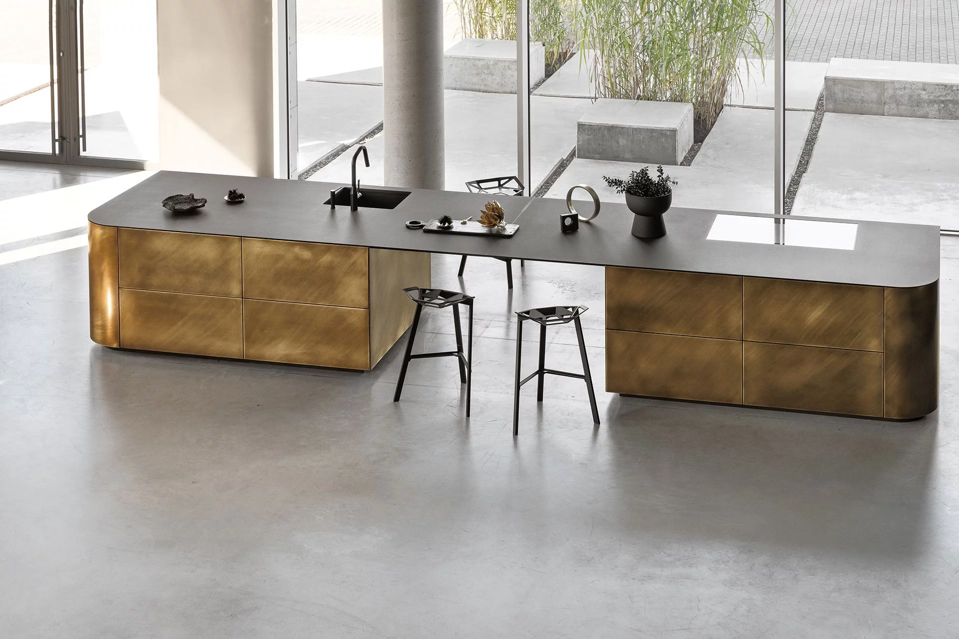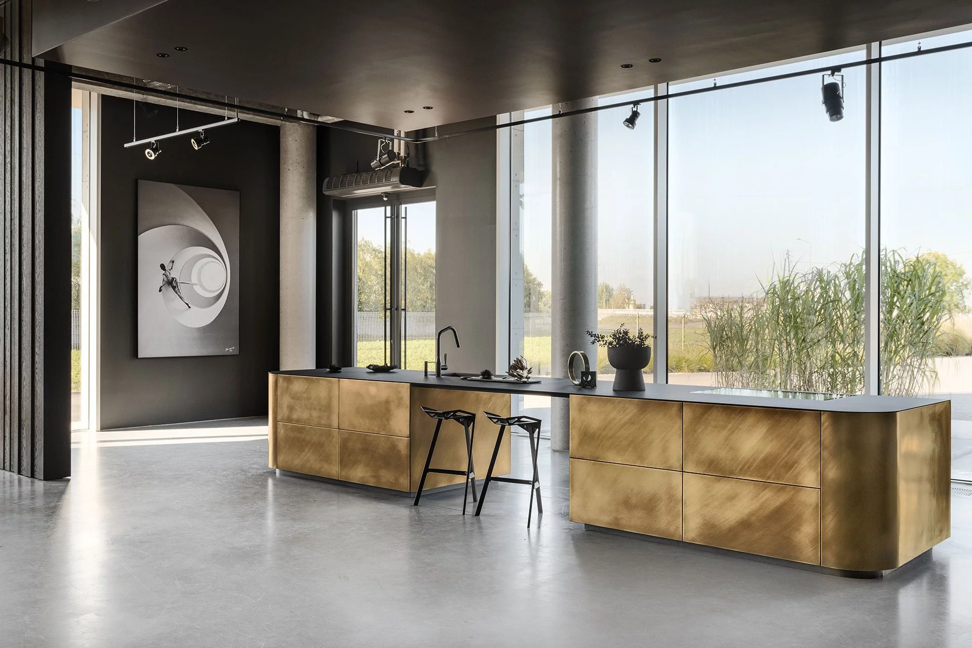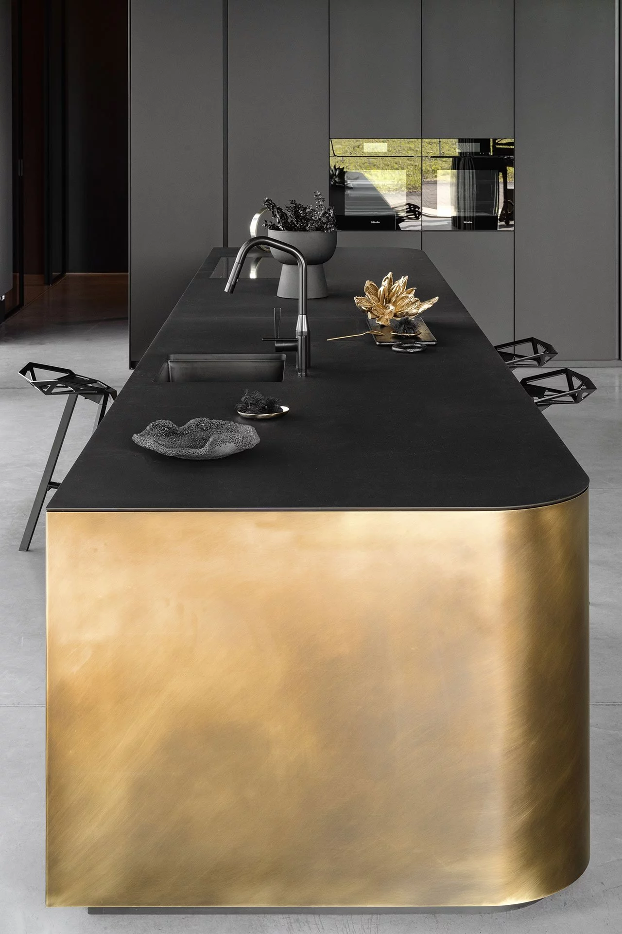 Кухня MET вдохновлена эстетикой 1950-х годов XX века, отраженной в характерных округлых краях мебели, особенно выраженных в форме кухонного острова. Внимание привлекает не только форма мебели, но и благородное сияние латунных фасадов, изготовленных вручную и защищенных специальной технологией от потери своей первоначальной привлекательности. Мастерство ручной работы позволяет идеально сочетать столешницу с металлическими фасадами, а также создавать элегантные угловые ручки. Заметным элементом стали боковины ящиков, получившие новый вид отделки с эффектом стекловолокна. Глубокий матово-черный оттенок появляется на столешнице из материала Lapitec и присутствует на лакированных фасадах высоких шкафов, в которых расположены духовки и морозильная камера. Met – это гармония сатинированного металлического блеска и глубокого матового черного, монументальные формы, сочетающиеся с легкостью современных линий.