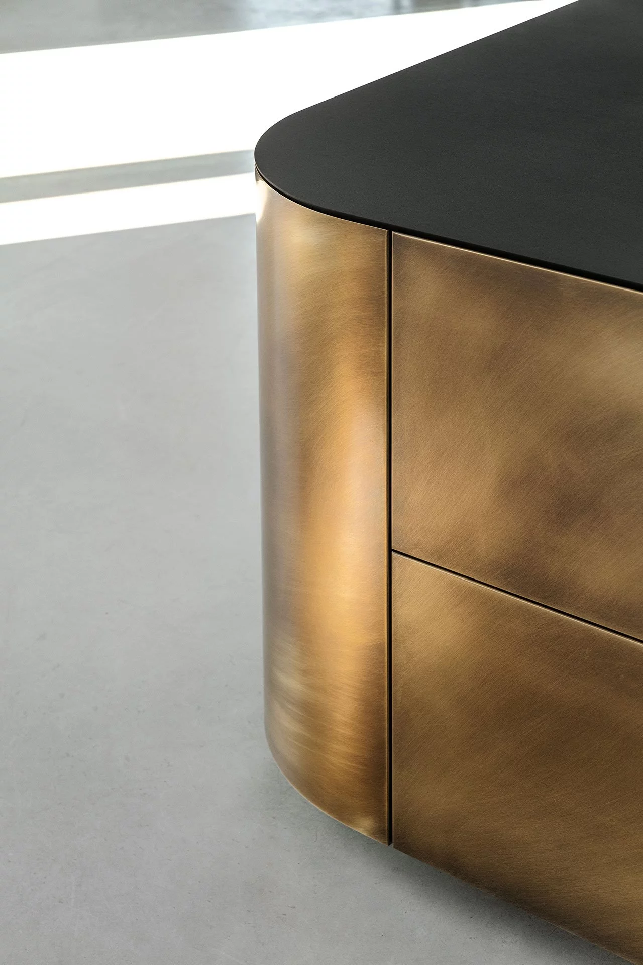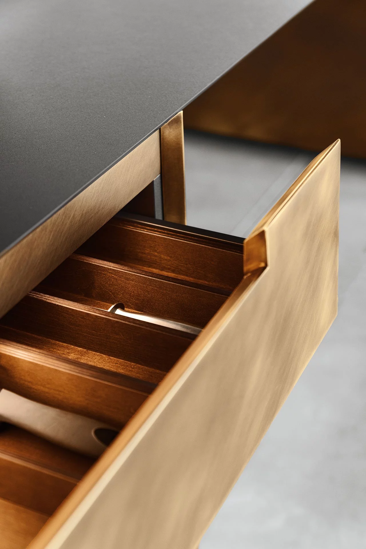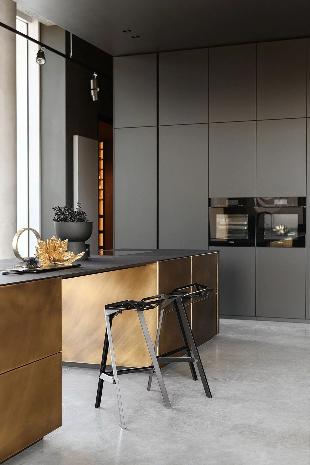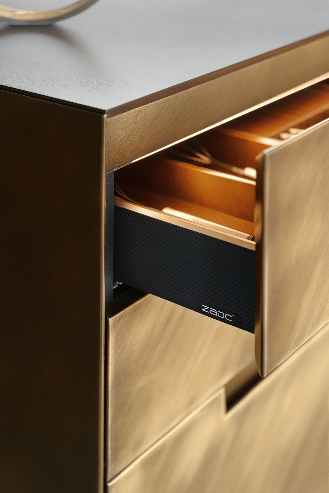 Кухня MET вдохновлена эстетикой 1950-х годов XX века, отраженной в характерных округлых краях мебели, особенно выраженных в форме кухонного острова. Внимание привлекает не только форма мебели, но и благородное сияние латунных фасадов, изготовленных вручную и защищенных специальной технологией от потери своей первоначальной привлекательности. Мастерство ручной работы позволяет идеально сочетать столешницу с металлическими фасадами, а также создавать элегантные угловые ручки. Заметным элементом стали боковины ящиков, получившие новый вид отделки с эффектом стекловолокна. Глубокий матово-черный оттенок появляется на столешнице из материала Lapitec и присутствует на лакированных фасадах высоких шкафов, в которых расположены духовки и морозильная камера. Met – это гармония сатинированного металлического блеска и глубокого матового черного, монументальные формы, сочетающиеся с легкостью современных линий.