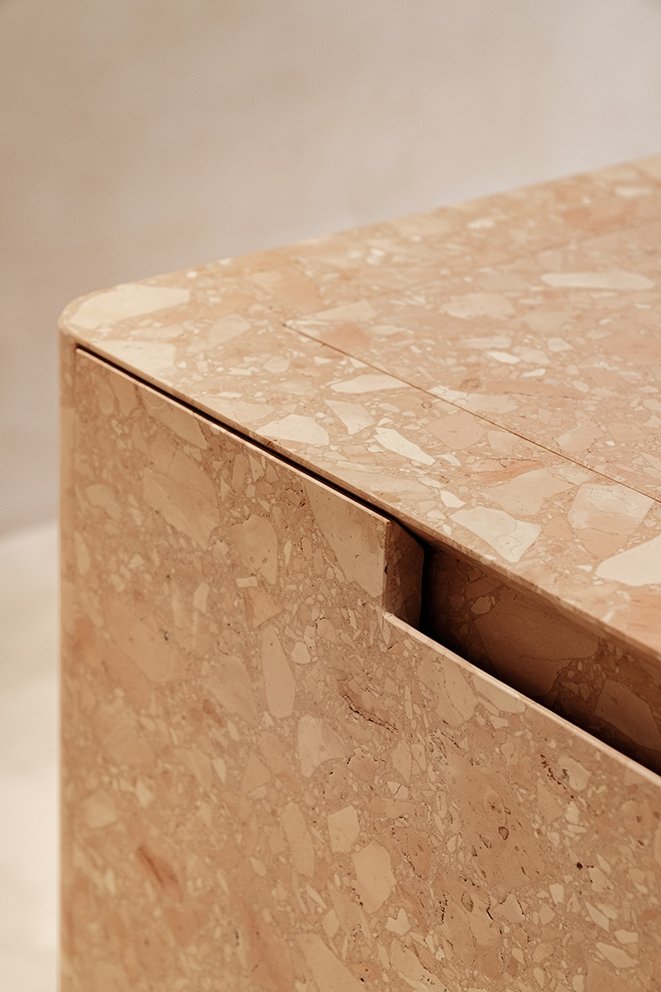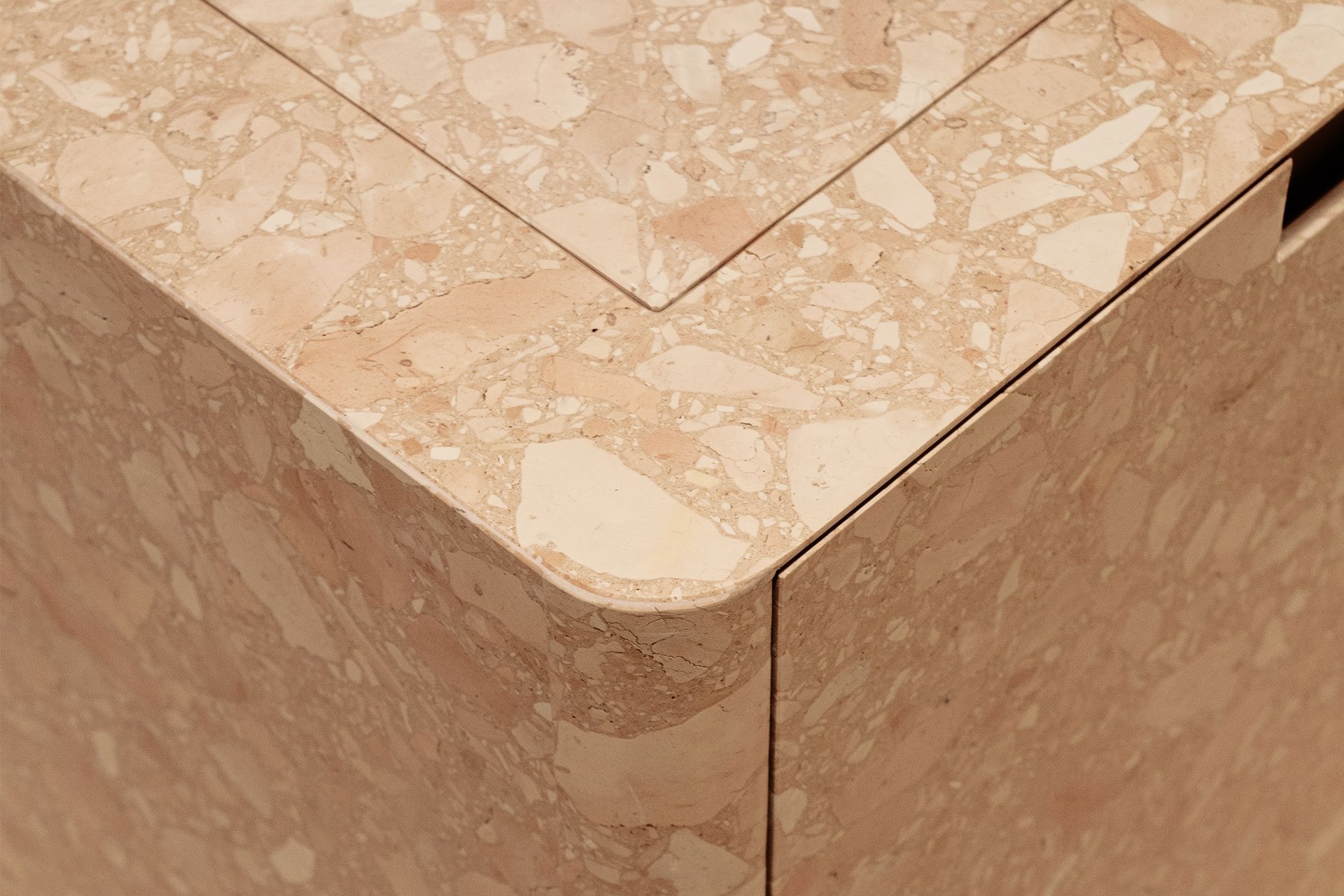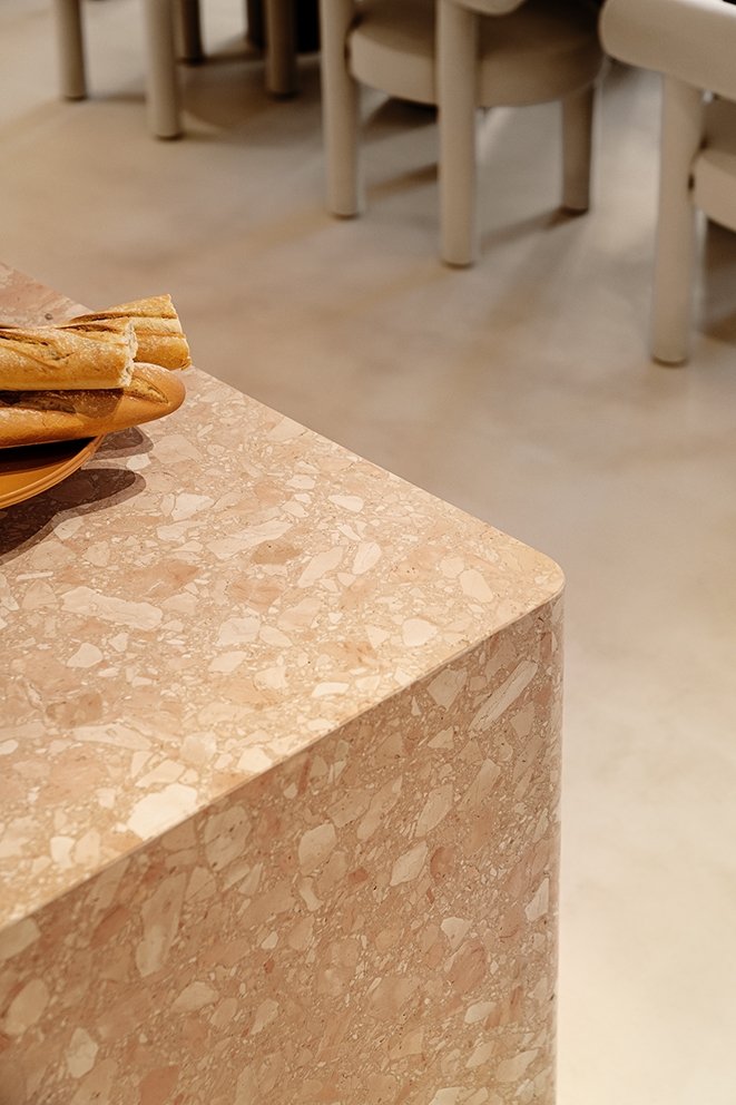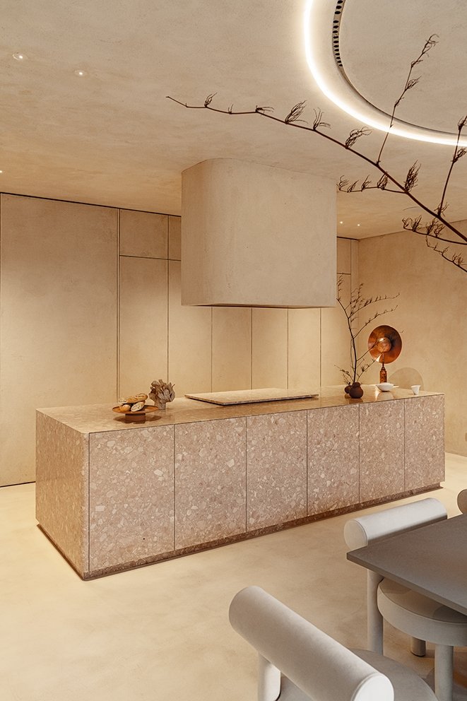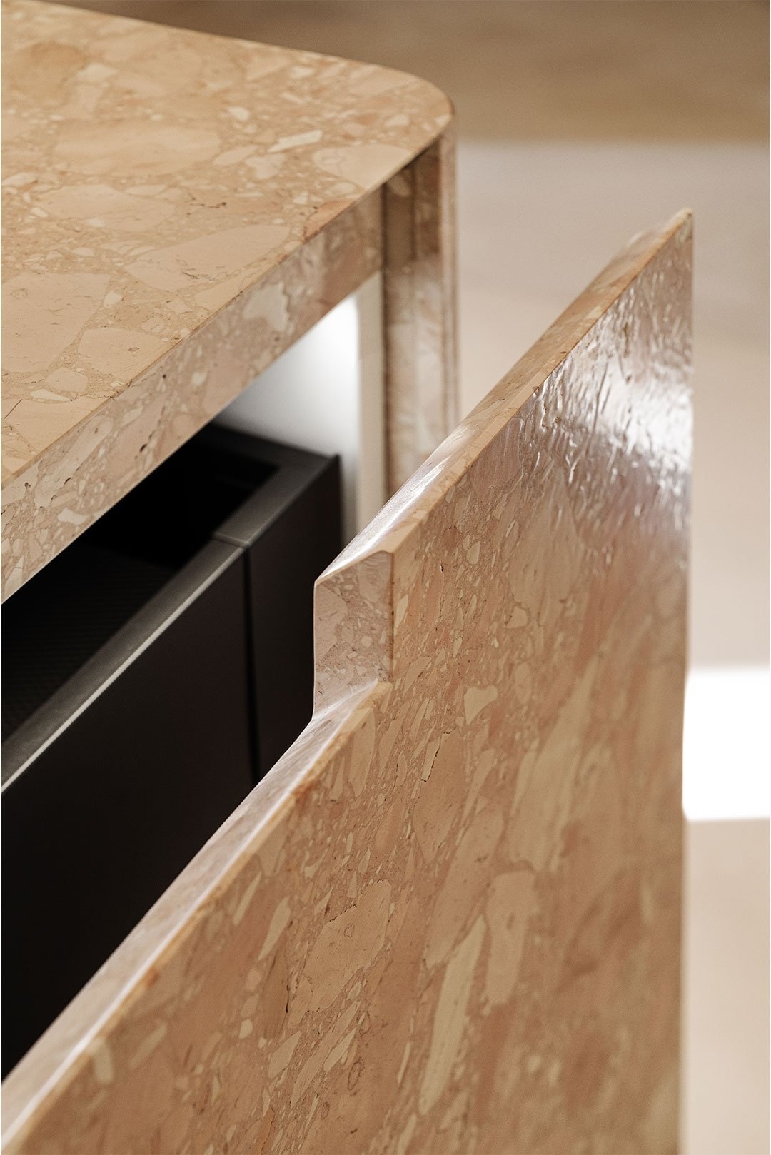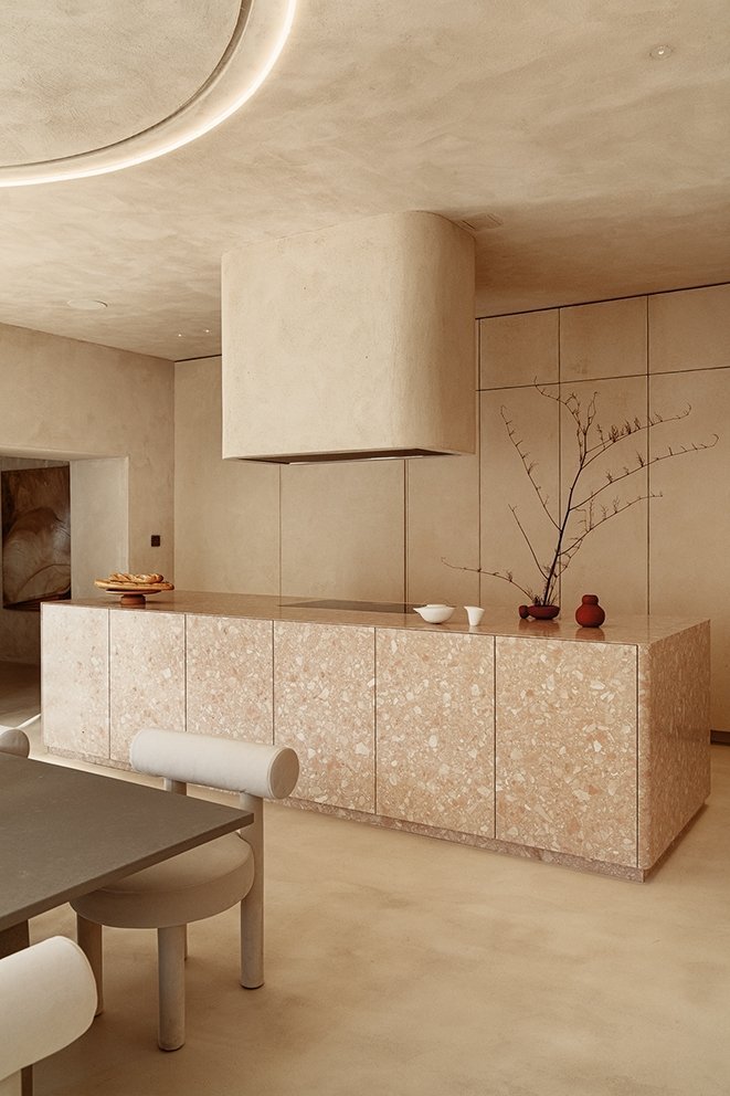 Главный элемент — остров с мягко закруглёнными углами. Его плавные линии подчёркивают современный стиль кухни. Все поверхности, включая фасады и выдвижные ящики, покрыты прочным мраморным конгломератом, что придаёт мебели аккуратный и цельный вид.
