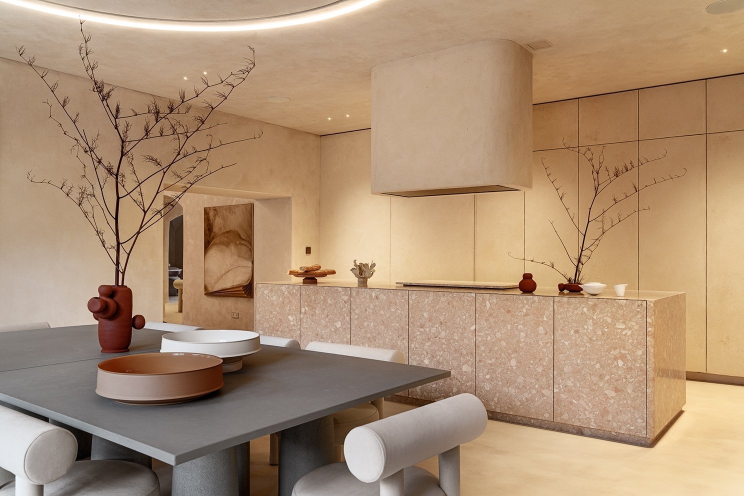 Высокие шкафы незаметно вписываются в интерьер. Они оснащены встроенными дверцами-пеналами, за которыми скрыта зона с бытовой техникой. Фасады отделаны фактурной штукатуркой, переходящей на стены, потолок и распашные двери — за ними расположена вспомогательная кухня.
