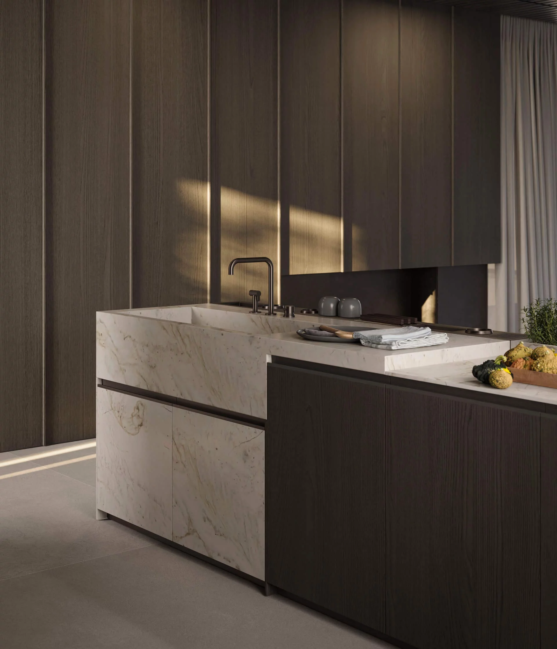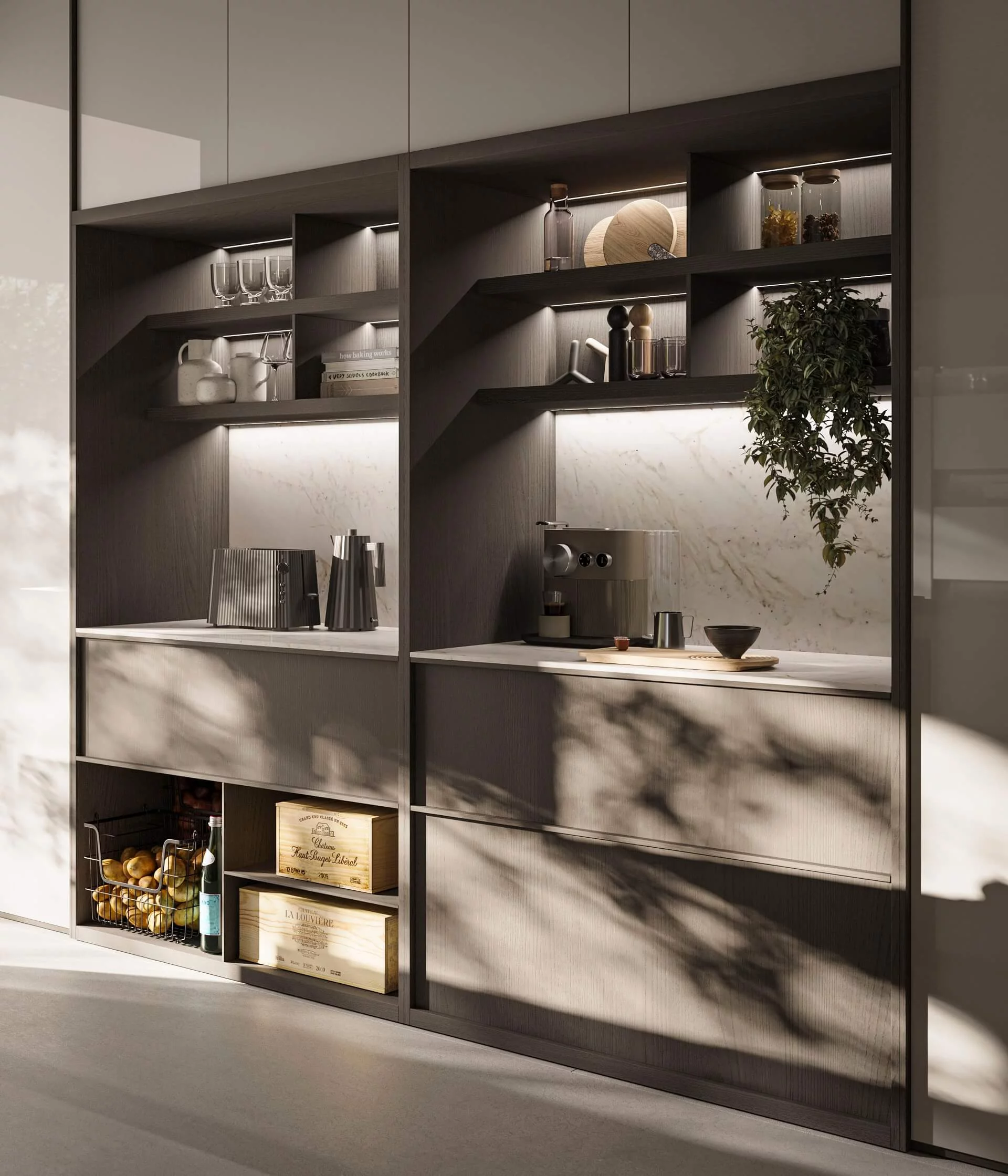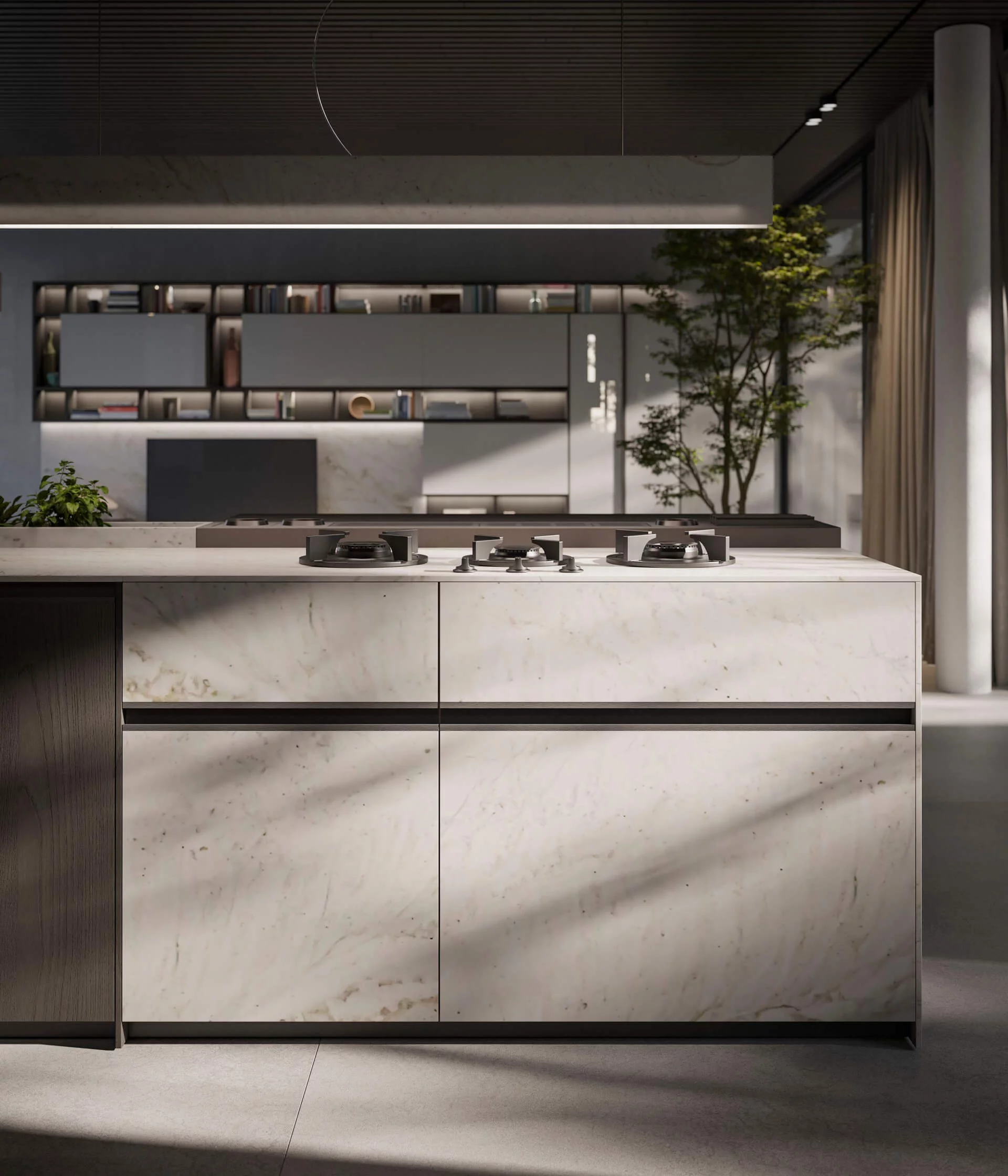 Loggia IN — это новая программа кухонь, разработанная Стефано Каваццана. Дополненная проработанной гаммой высококачественных материалов и отделок, Loggia IN предлагает бесконечные возможности для кастомизации кухонного пространства в каждом его мельчайшем деталях. Среди основных характеристик — дверца с алюминиевой рамой в отделках сатинированная сталь и черный сатин, с панелями, доступными в 8 различных отделках, и система колонн L16, которая предусматривает дверцы толщиной 16 мм с интегрированной ручкой на вертикальном крае для цельных фасадов и горизонтальной или вертикальной для фасадов колонн с несколькими дверцами.