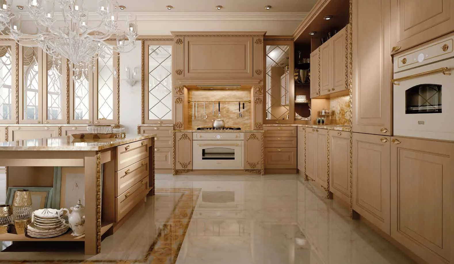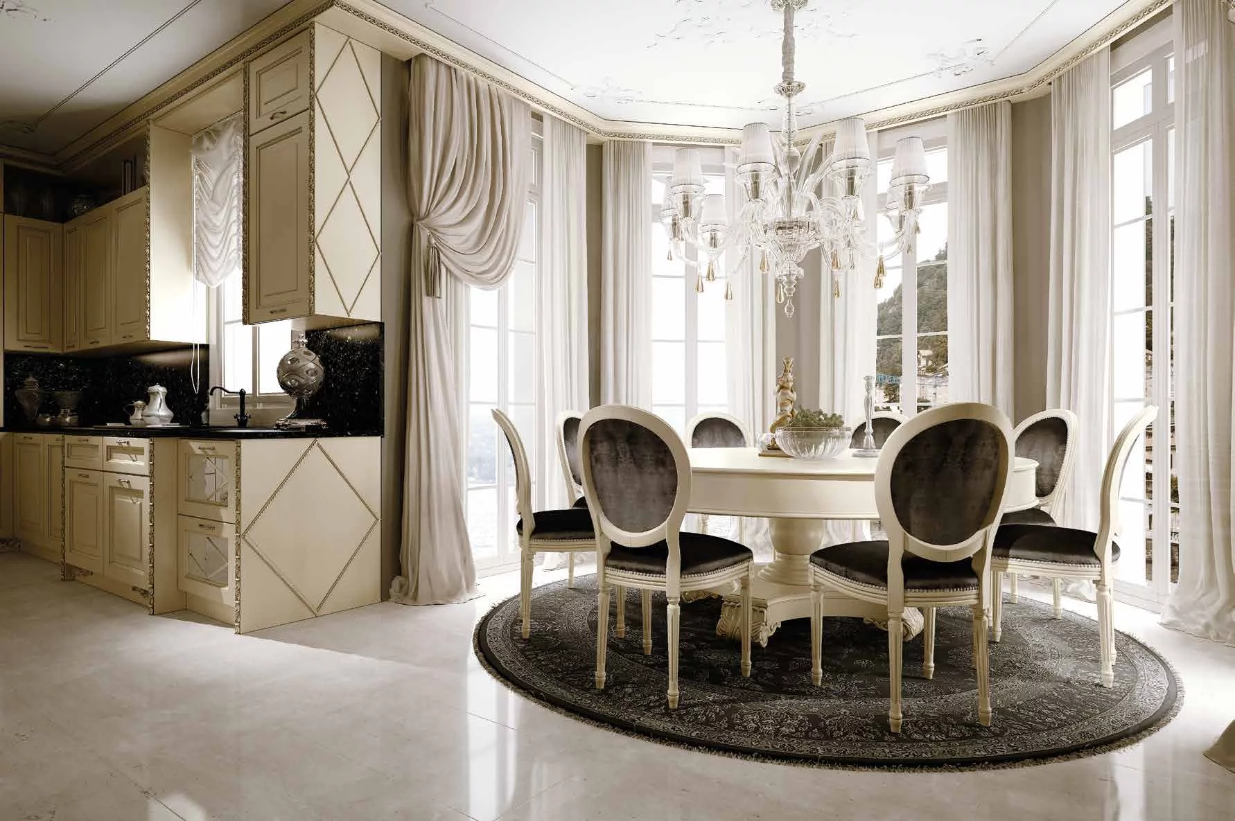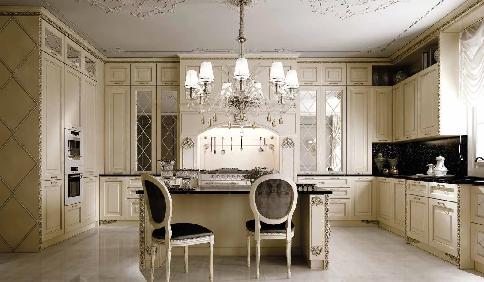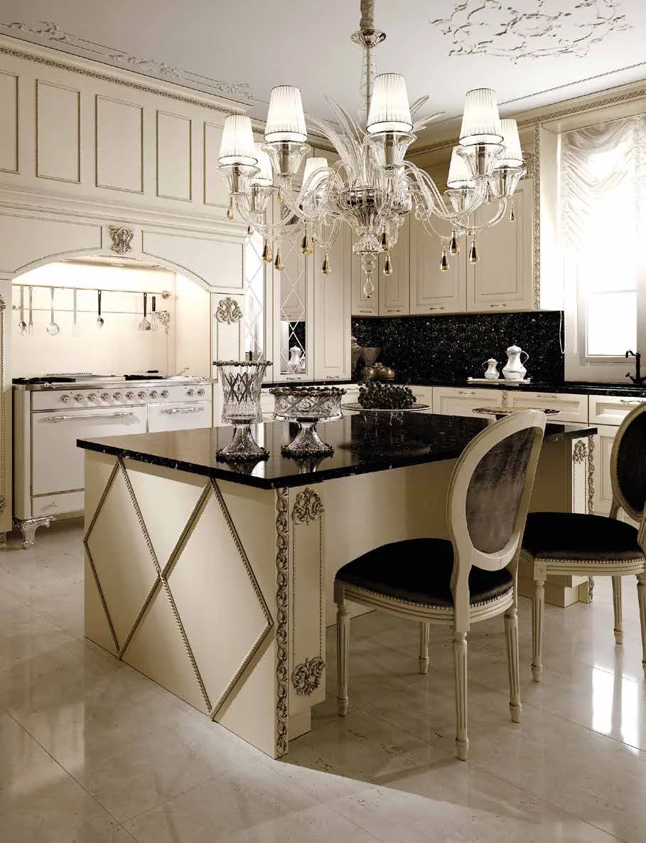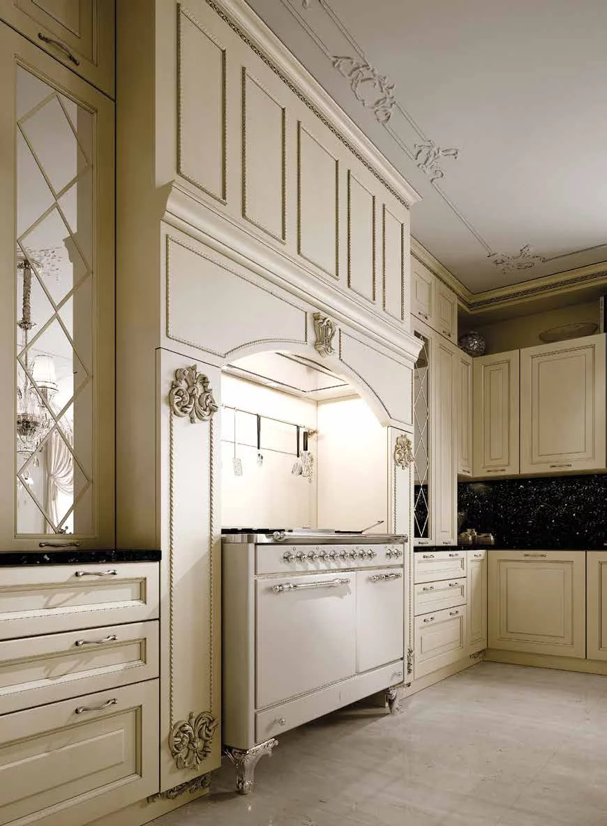 Величественные формы и неповторимые резные элементы, выполненные ручным способом, модели Chimera делают кухню уникальной и неповторимой. Фасады выполнены из массива каштана, каркас имеет полностью деревянную структуру. Предлагается большое разнообразие цветов, 6 лакированных отделок и 2 цвета древесины, уникальность которым предают патинирование и обработка под старину. Резные детали предлагаются в 3 вариантах обработки: золото, серебро и тон в тон с дверкой.