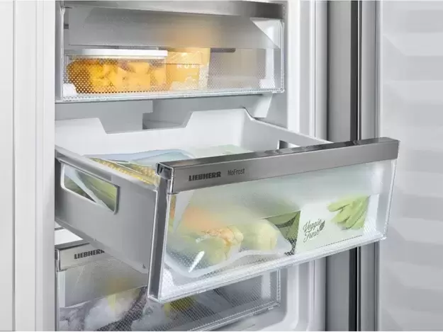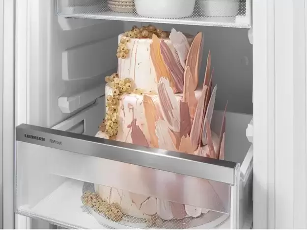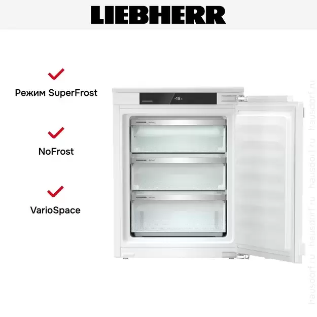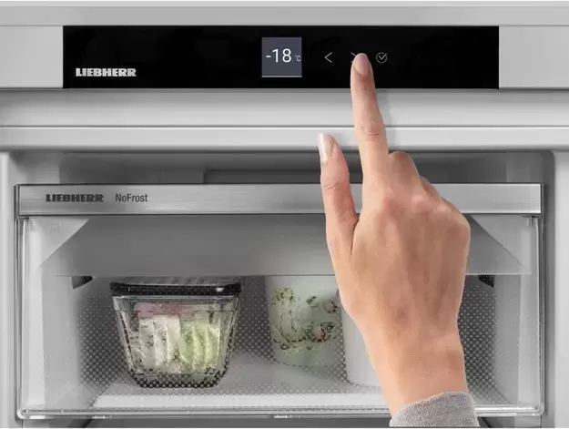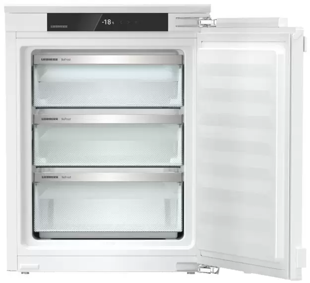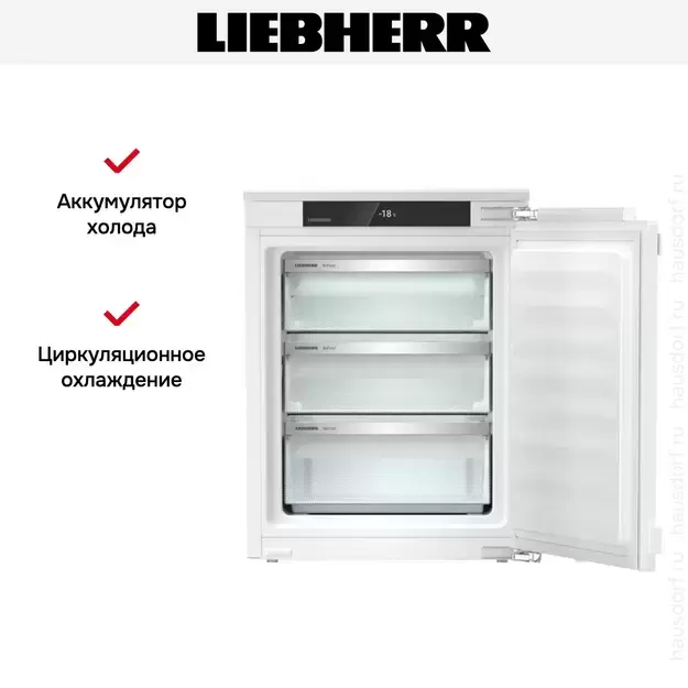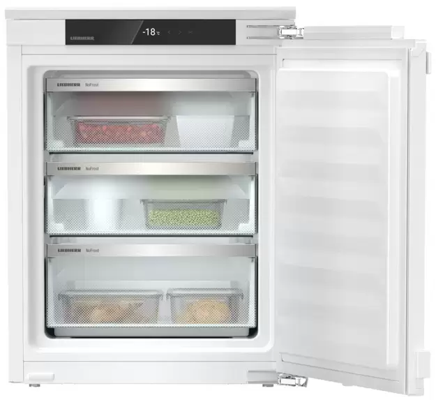 Liebherr IFNd 3503 Компактная встраиваемая морозильная камера высотой 71,2 и шириной 55,9 см скрывается за фасадом: дверь без ручки, крепление door‑on‑door (фасад до 14 кг) и угол 115° делают доступ удобным. Стальной корпус, дизайн Pure, предусмотрена мебельная вентиляция; ниша — 71,4—73×56—57×55 см. Упор двери справа, есть перевешивание; регулируемые ножки и выравнивающие планки помогают точно установить прибор. Полезные 65 л распределены между тремя выдвижными отделениями на стеклянных полках. Система Vario упрощает перестройку внутреннего пространства под упаковки разной высоты. FrostSafe поддерживает порядок и удобный доступ к запасам. Циркуляционная подача воздуха и No Frost держат камеру без наледи, поддерживая стабильный холод без необходимости ручной разморозки. Производительность — до 11 кг/сут, есть суперзаморозка для больших партий. При отключении питания автономия до 15 часов; в комплекте аккумулятор холода. Четырехзвездочный уровень и класс SN‑T для длительного хранения. Электронное управление: сенсорные кнопки, цифровой дисплей, индикация температуры и питания, сигнал открытой двери, блокировка от детей. Режимы EnergySaving, Party, Sabbath и BottleTimer расширяют сценарии — от экономии в отъезде до аккуратного охлаждения напитков. Тихая работа 36 дБ и функция SuperSilent позволяют размещать рядом с зоной отдыха. Энергопотребление — класс E, 133 кВт·ч/год; один контур на R600a и компрессор стабильно работают от 220-240 В, 50-60 Гц. Ключевые преимущества Встраивание под фасад door‑on‑door: удобный доступ, угол 115° и перевешиваемая дверь. No Frost и 11 кг/сут: без наледи, стабильная температура и ускоренное замораживание. Дополнительные режимы EnergySaving, Party, Sabbath и BottleTimer.