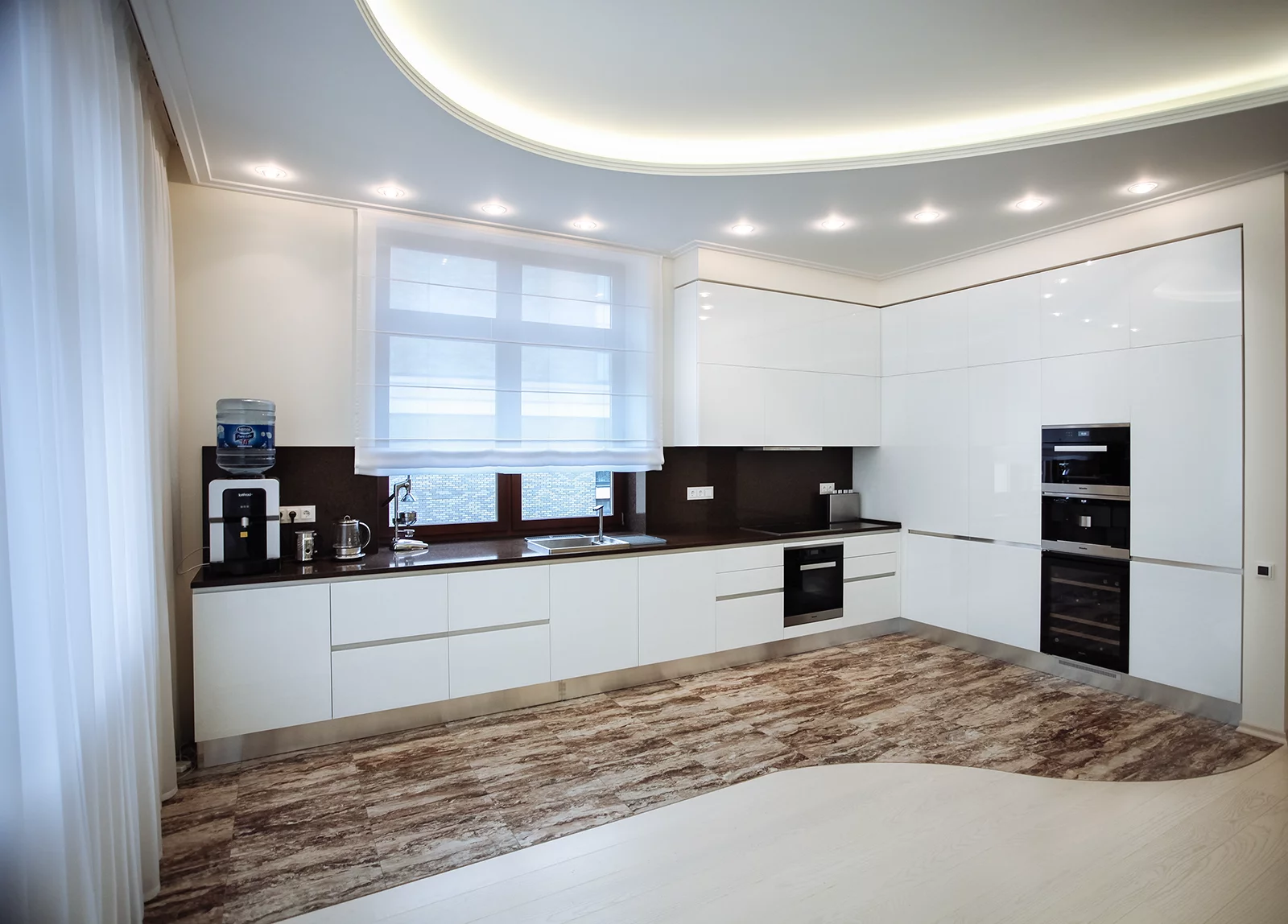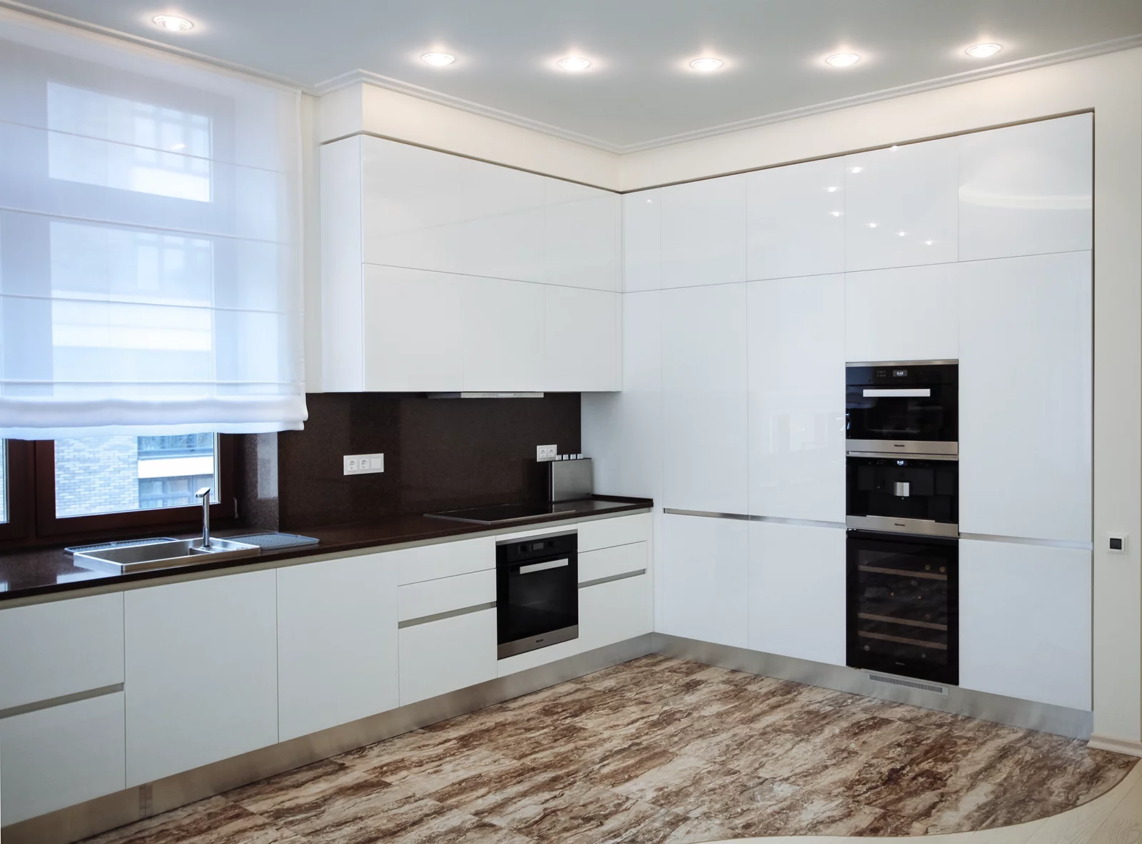 Для квартиры в Москве разработан индивидуальный проект соврменной кухни от фабрики Mittel Cucine. Плоские глянцевые фасады белого цвета имеют «продолжение» в виде ручки. Металлический цоколь и вставки между фасадами удачно дополняют композицию. Столешница и фартук выполнены из кварцевого камня. Установлен комплект бытовой техники Miele.