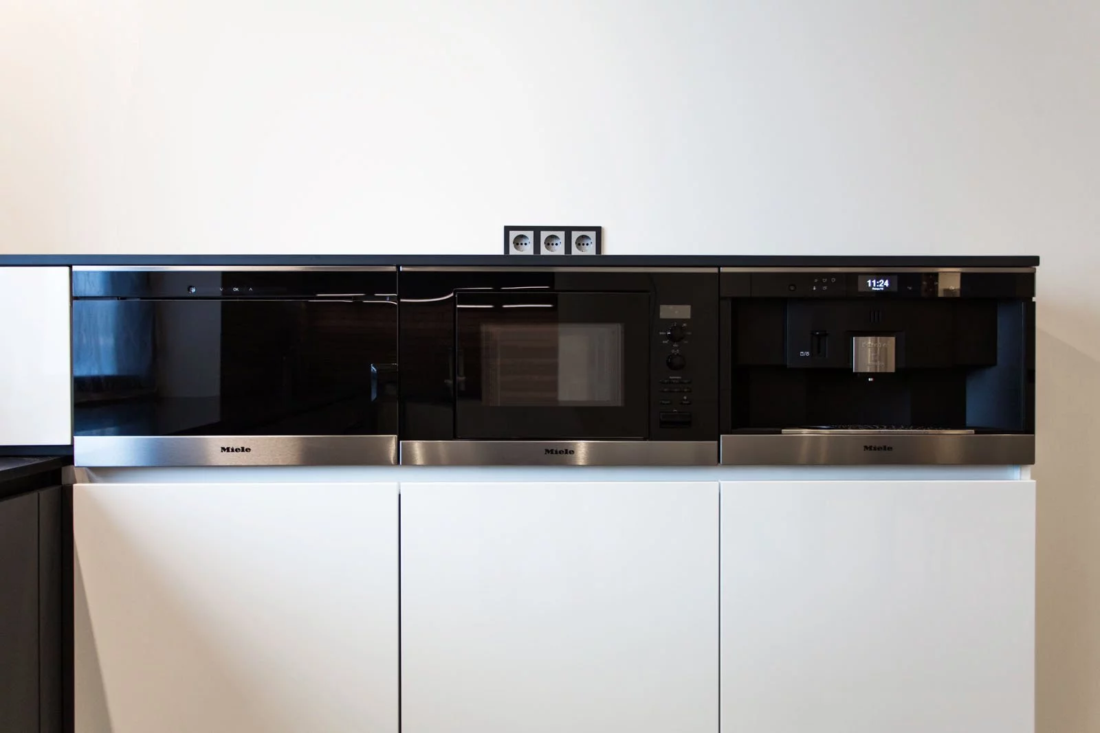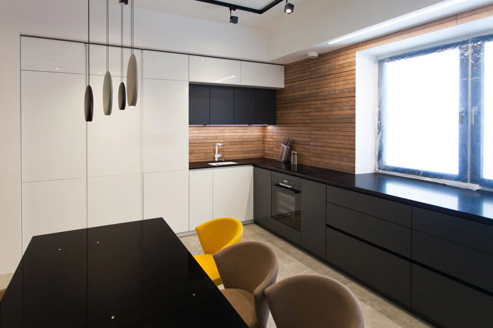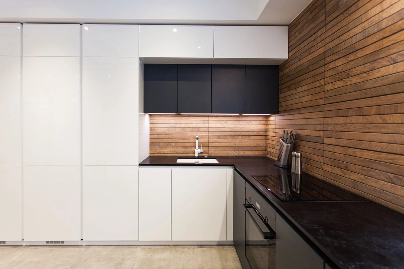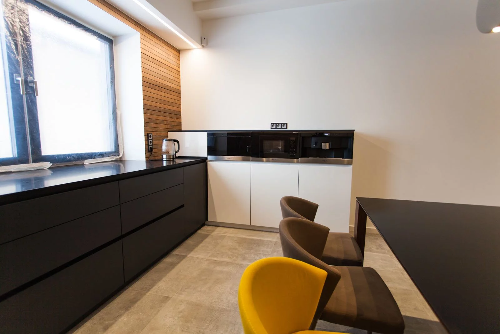 Использована фурнитура Blum премиальной линейки. В качестве ручек использован профиль Gola в 2 отделках, соответствующих цвету фасадов. Цоколь — крашеный алюминий высотой 60 мм. Кухня имеет врезную LED-подсветку с сенсорным датчиком включения.