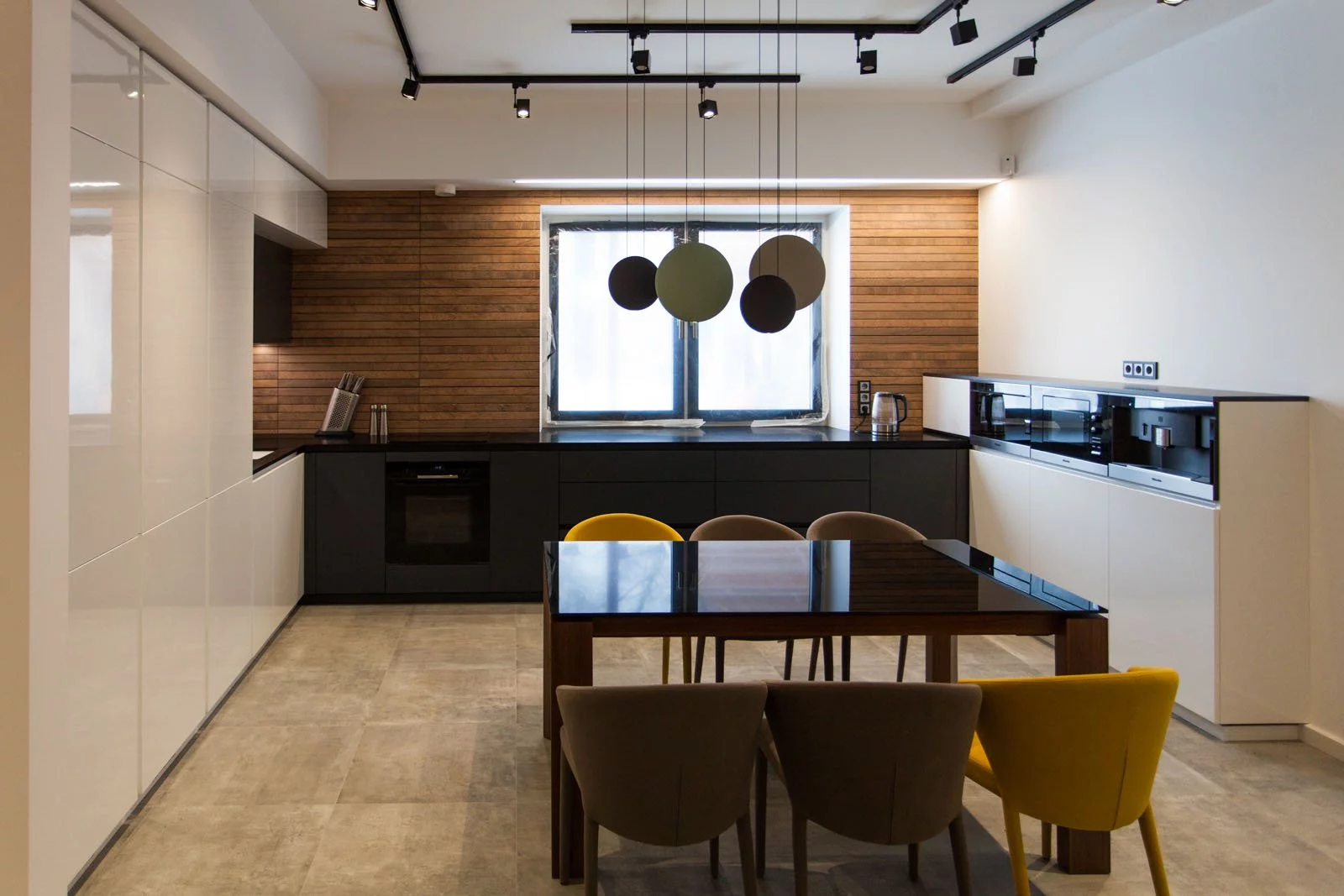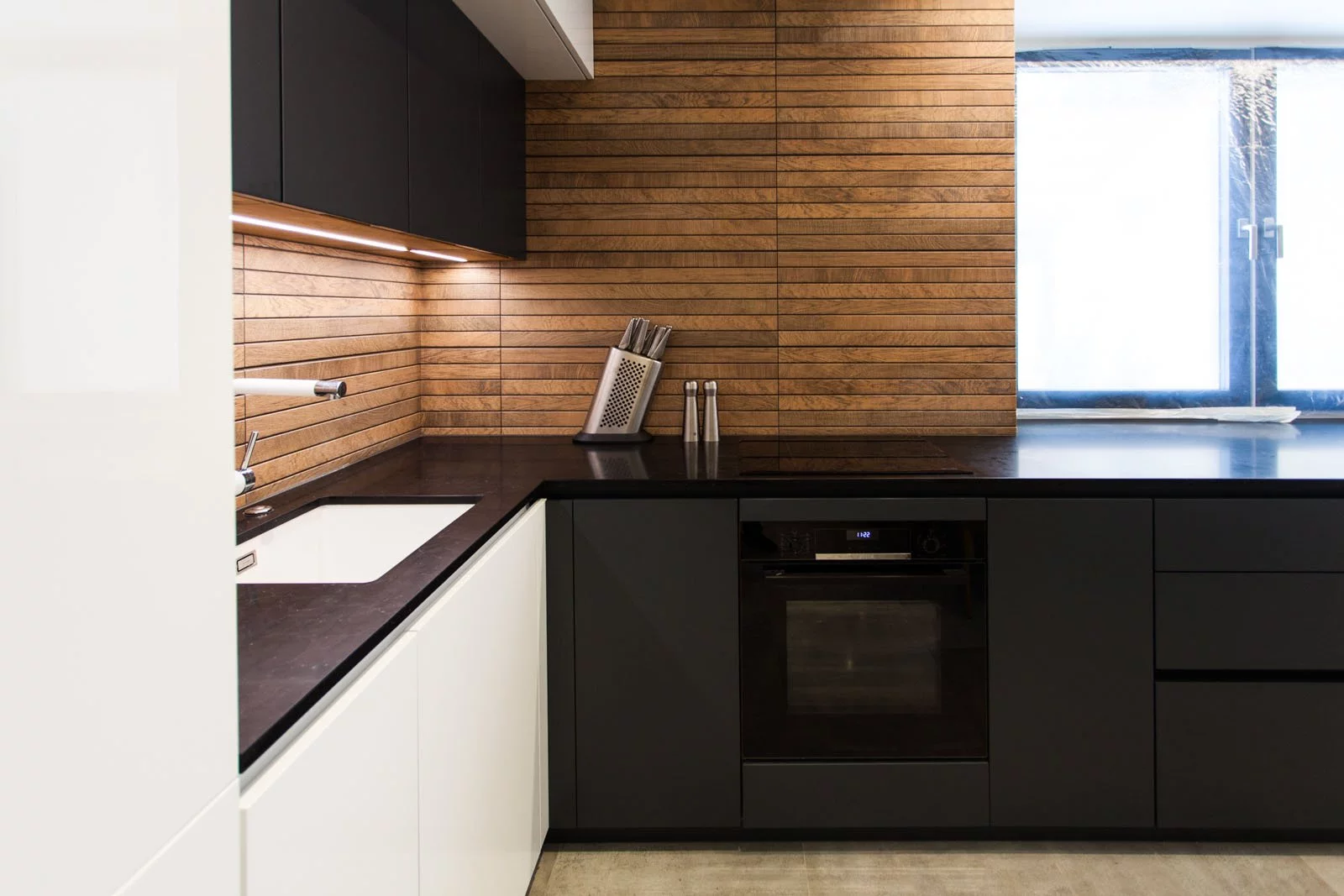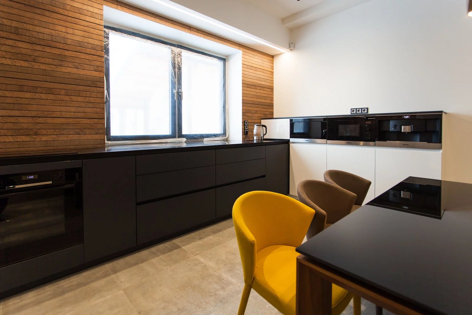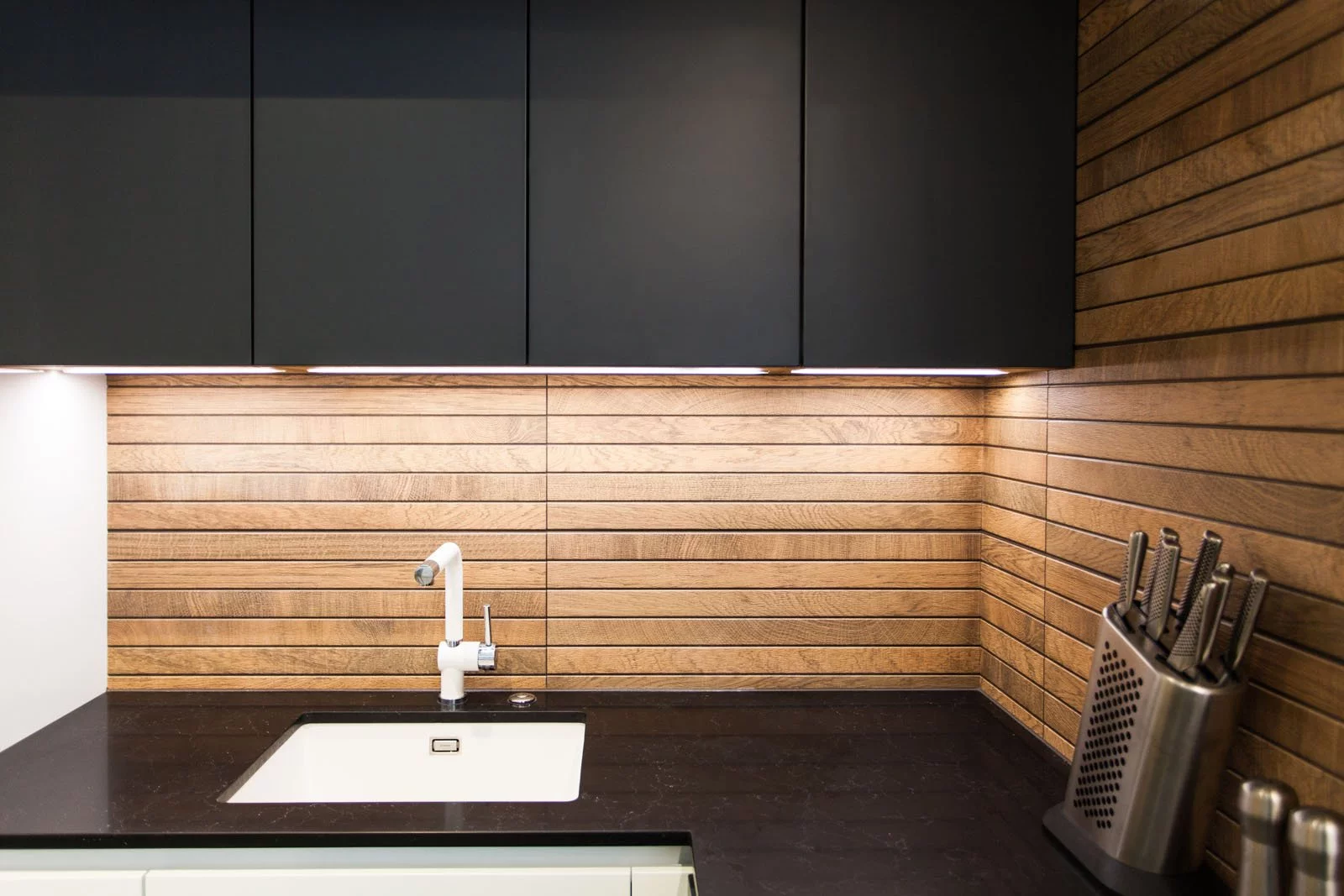 Использована фурнитура Blum премиальной линейки. В качестве ручек использован профиль Gola в 2 отделках, соответствующих цвету фасадов. Цоколь — крашеный алюминий высотой 60 мм. Кухня имеет врезную LED-подсветку с сенсорным датчиком включения.