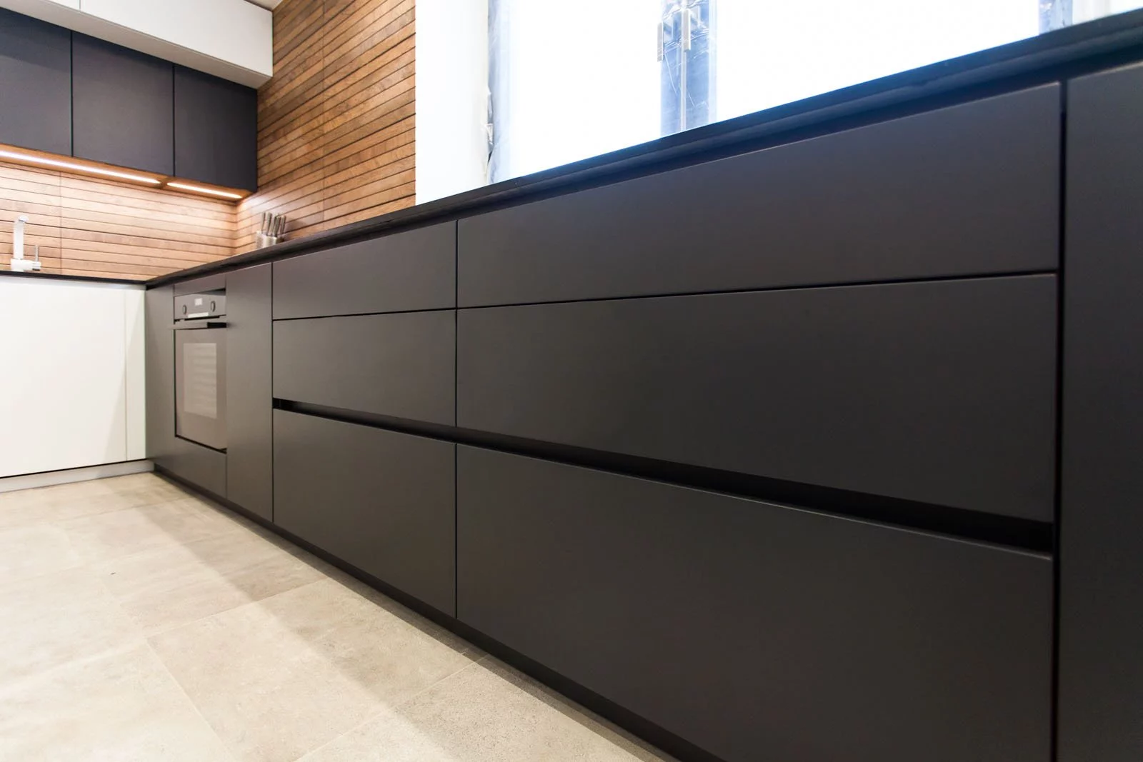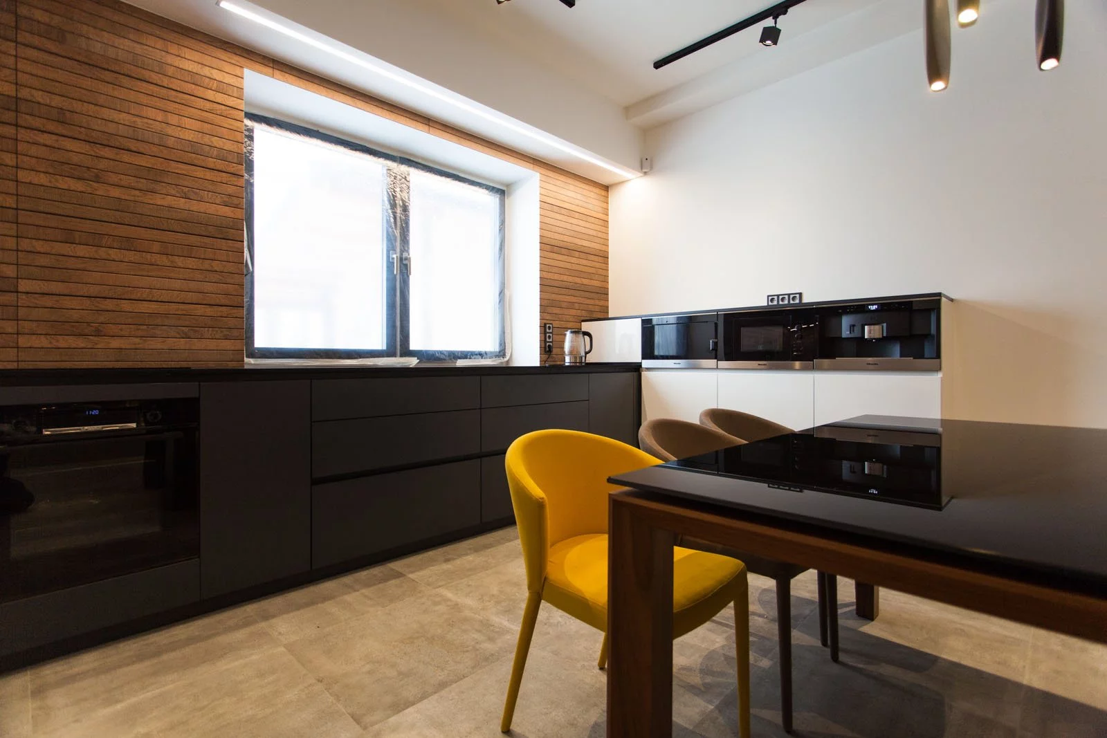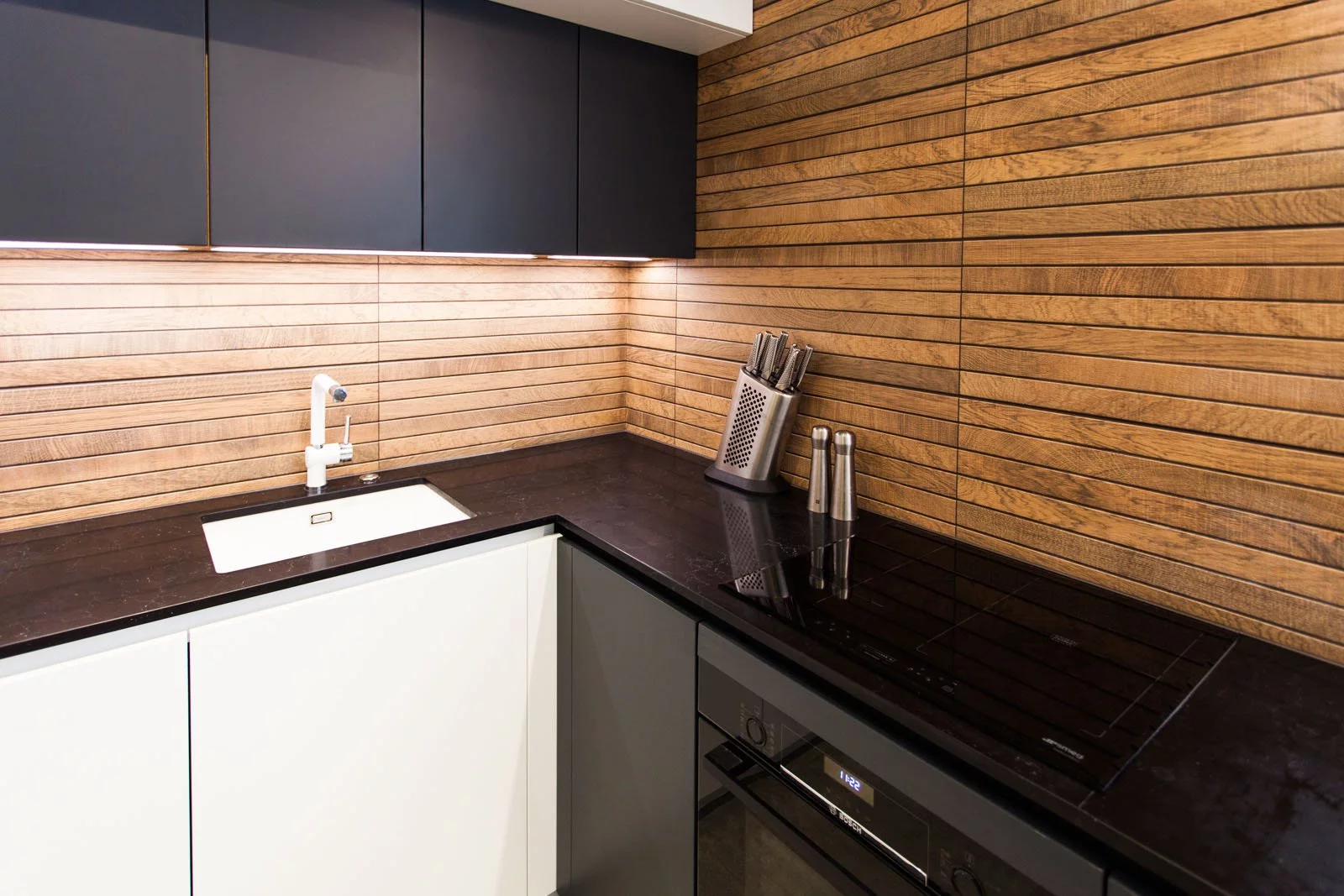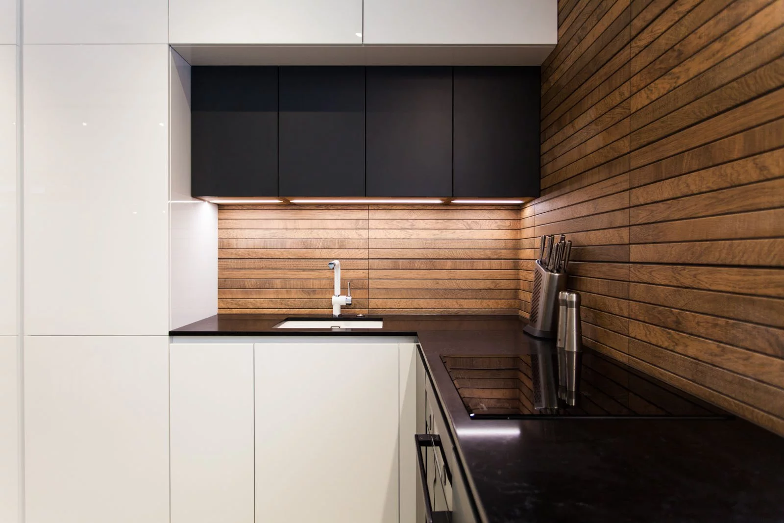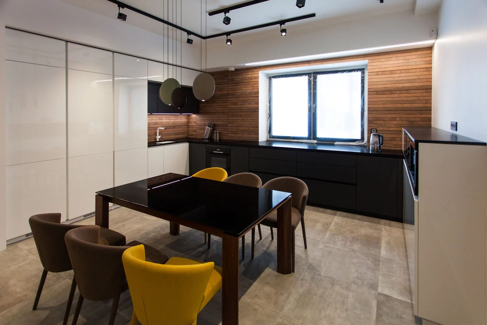 Использована фурнитура Blum премиальной линейки. В качестве ручек использован профиль Gola в 2 отделках, соответствующих цвету фасадов. Цоколь — крашеный алюминий высотой 60 мм. Кухня имеет врезную LED-подсветку с сенсорным датчиком включения.