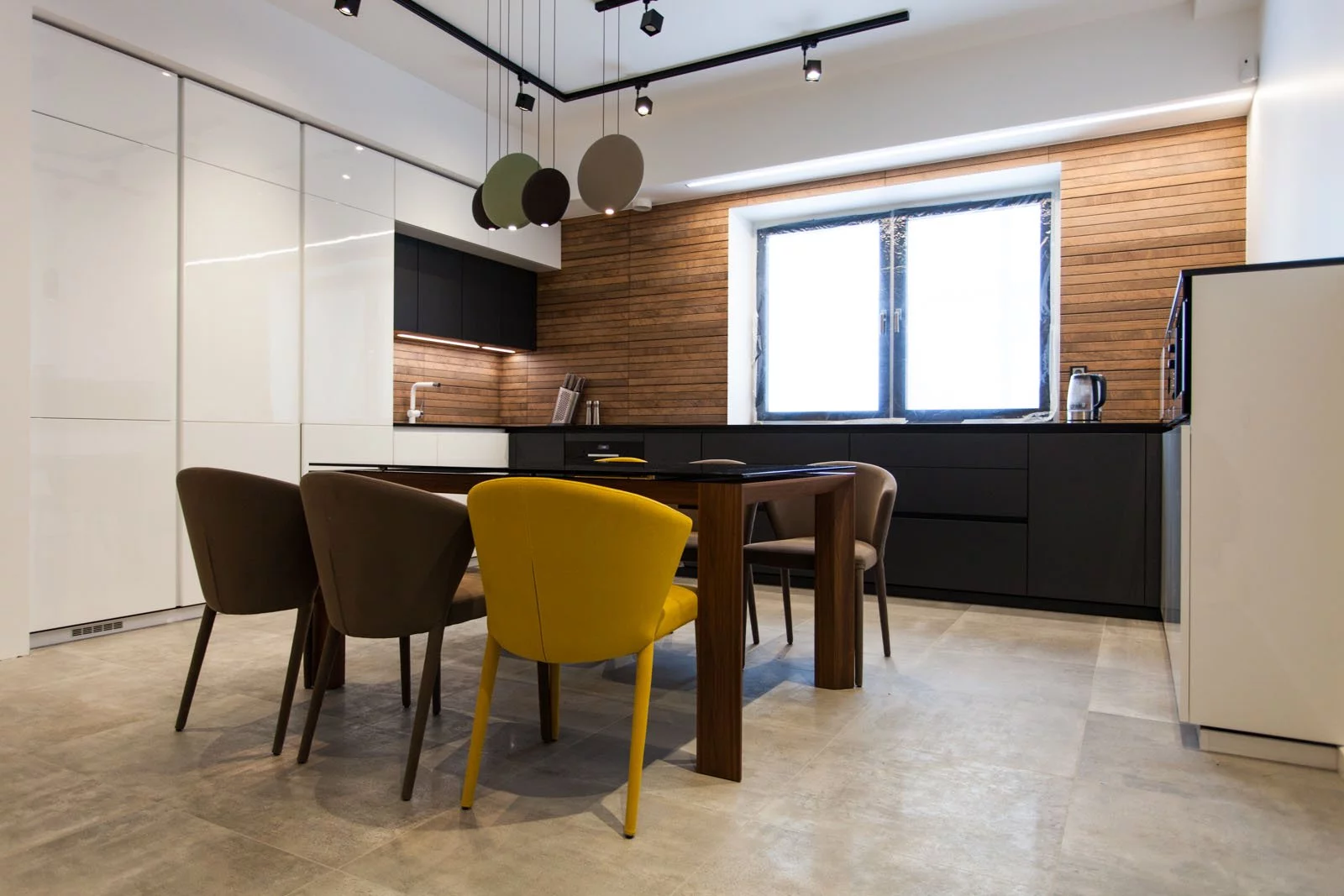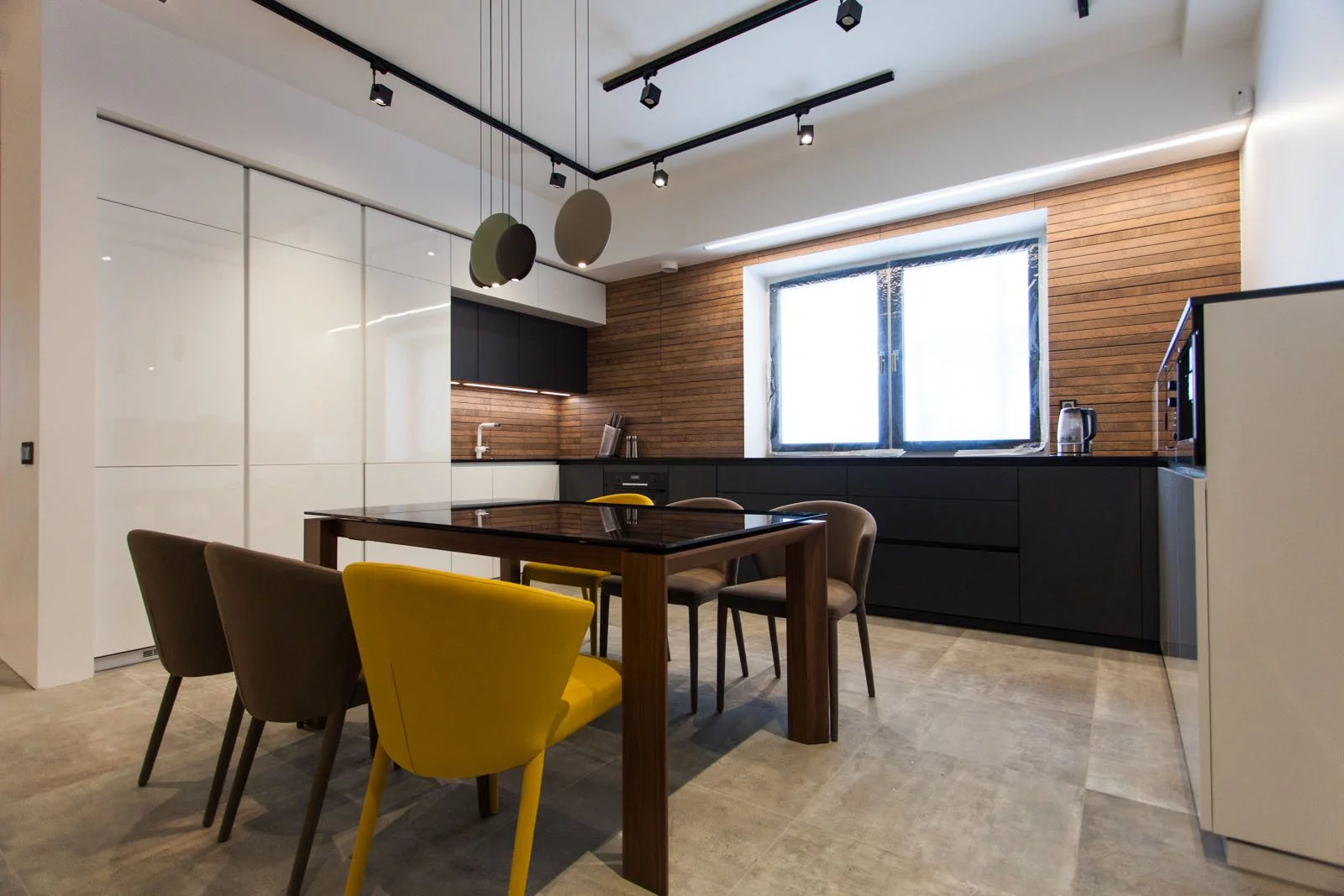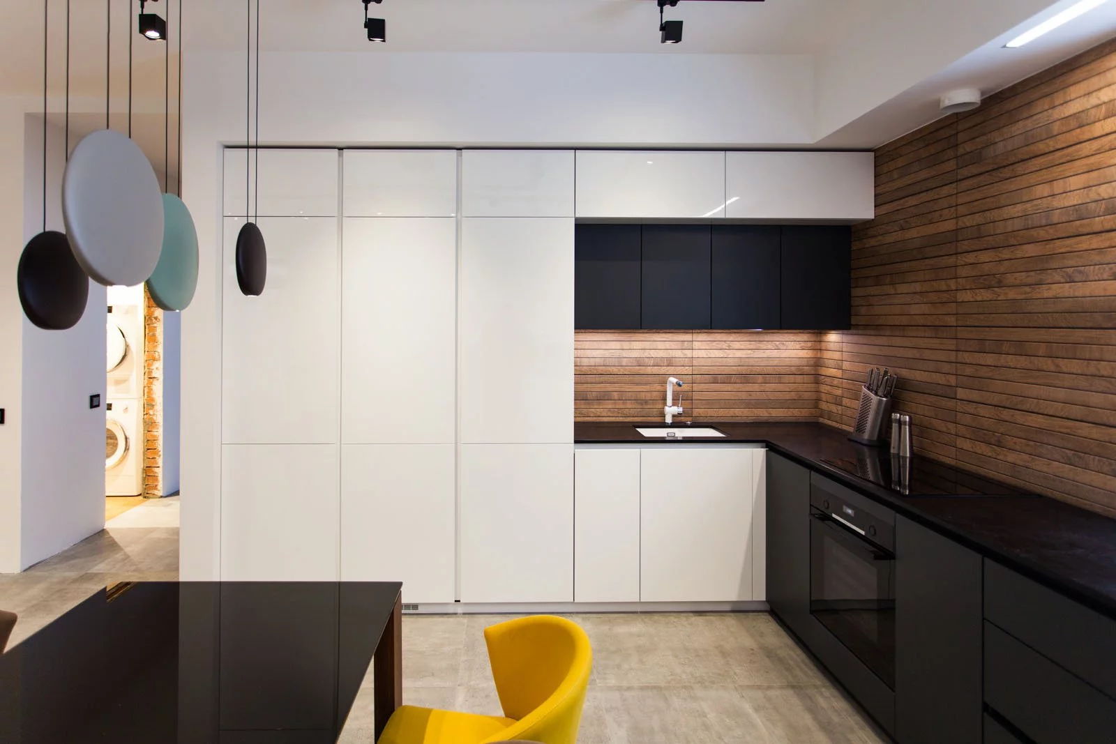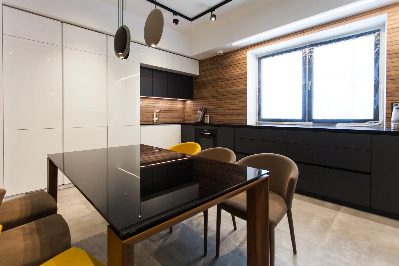 Использована фурнитура Blum премиальной линейки. В качестве ручек использован профиль Gola в 2 отделках, соответствующих цвету фасадов. Цоколь — крашеный алюминий высотой 60 мм. Кухня имеет врезную LED-подсветку с сенсорным датчиком включения.