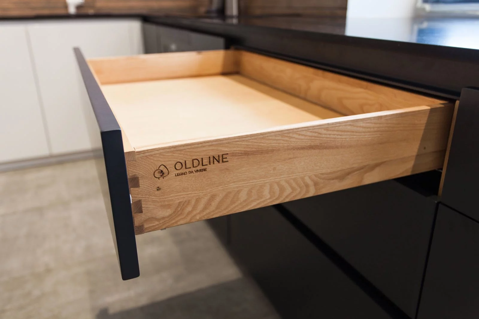 Гарнитур имеет «П»-образную композицию. В нише слева представлены колонны для встроенного холодильника и хранения, а также зона мойки, в которой кухня имеет 3 ряда: гарнитур дополнен глубокими антресолями. Отделки: Laccato Lucido Bianco (белый глянец) и серая матовая эмаль. Центральная часть имеет только нижние выдвижные базы. Тут разместилась зона приготовления с духовым шкафом и широкой варочной панелью. Фасадная часть представлена в матовой эмали RAL 7016, а корпус изготовлен из натурального массива дуба Rovere Naturale. Обратите внимание на изящное соединение «ласточкин хвост» у выдвижных ящиков. Справа гарнитур имеет невысокие колонны для встроенной бытовой техники в белой глянцевой эмали.
