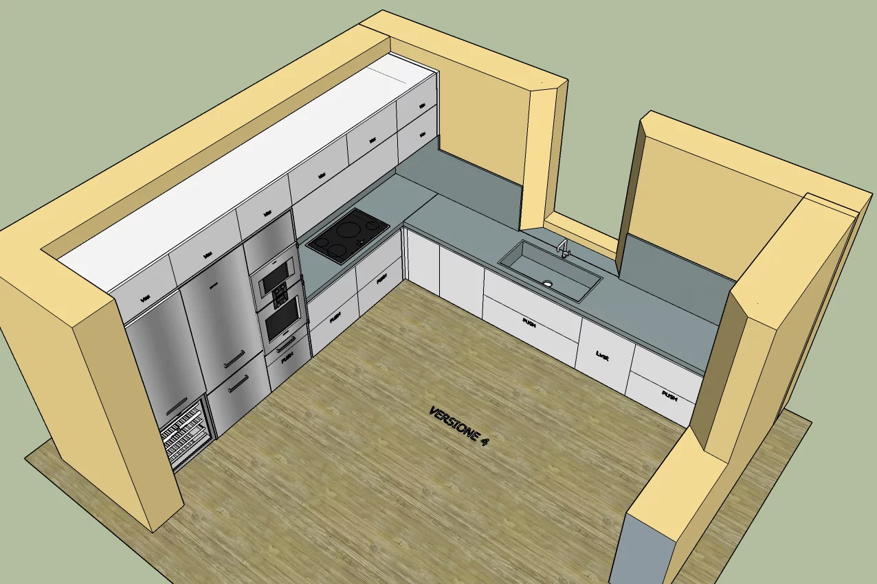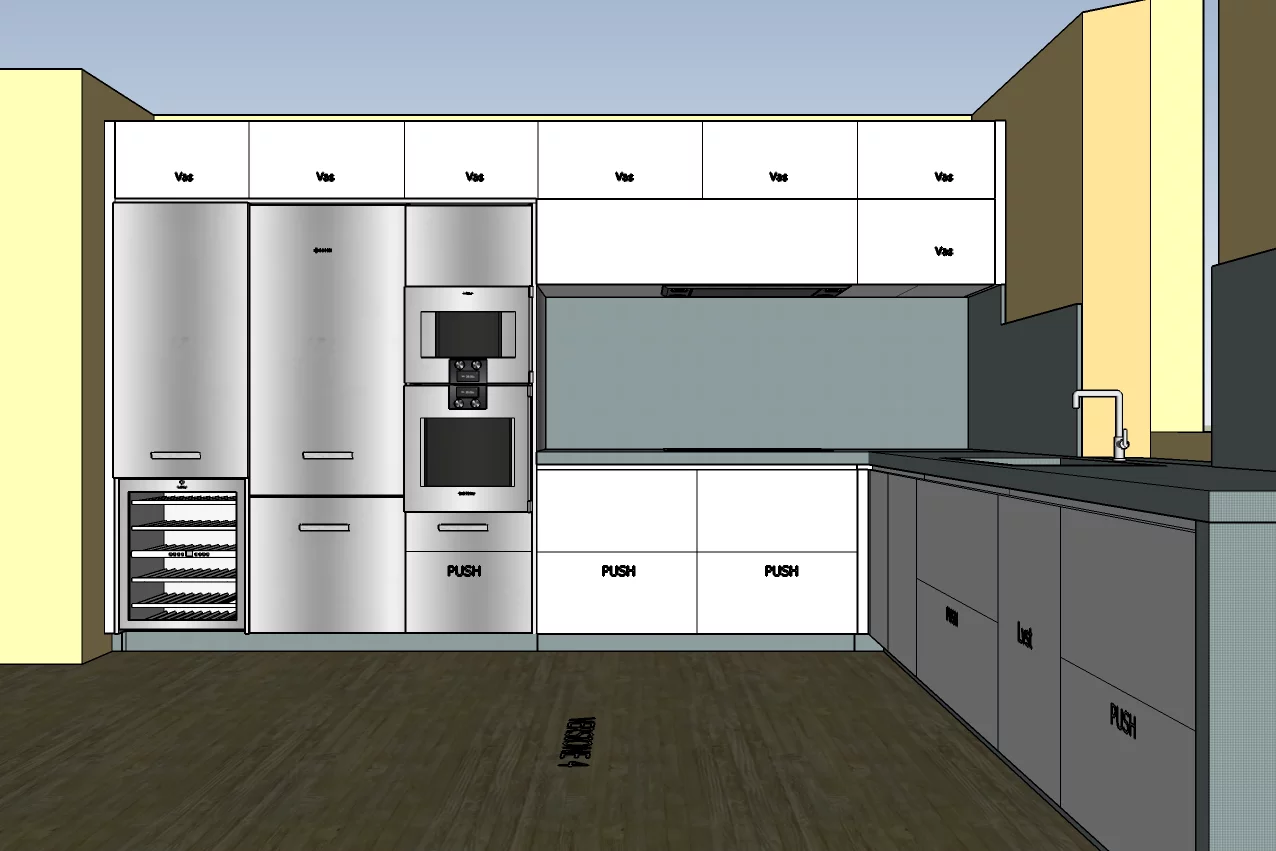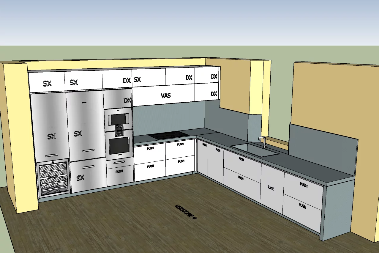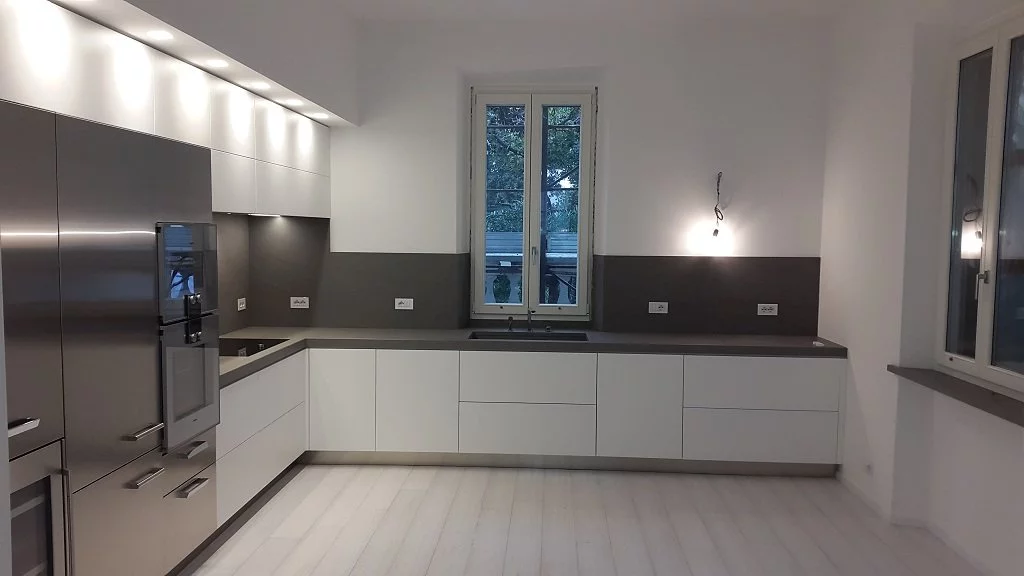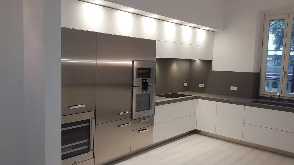 Модель Parigi в современном стиле от фабрики Segno Bianco. В гарнитуре сочетаются плоские окрашенные и металлические фасады. Для удобства использования они комплектуются фурнитурой Push to open. Столешница и фартук изготовлены из искусственного камня серого цвета.